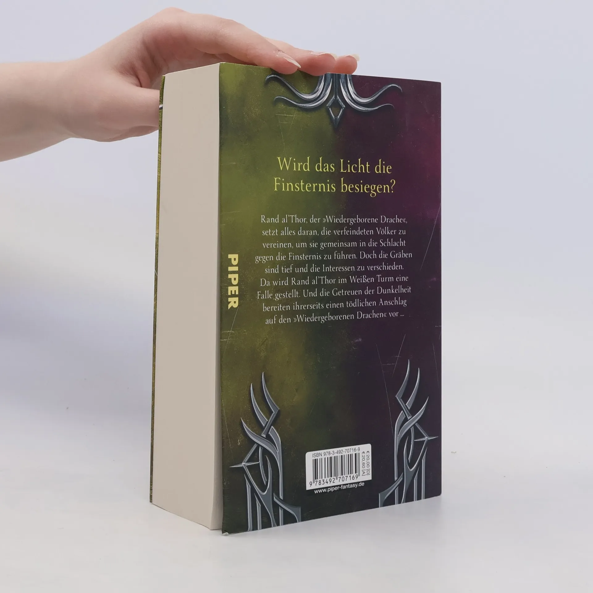 Wird das Licht die Finsternis besiegen? Rand al’Thor, der Wiedergeborene Drache, setzt alles daran, die verfeindeten Völker zu vereinen, um sie gemeinsam in die Schlacht gegen die Finsternis zu führen. Doch die Gräben sind tief und die Interessen zu verschieden. Da wird Rand im Weißen Turm eine Falle gestellt. Und die Getreuen der Dunkelheit bereiten ihrerseits einen tödlichen Anschlag auf den Wiedergeborenen Drachen vor …