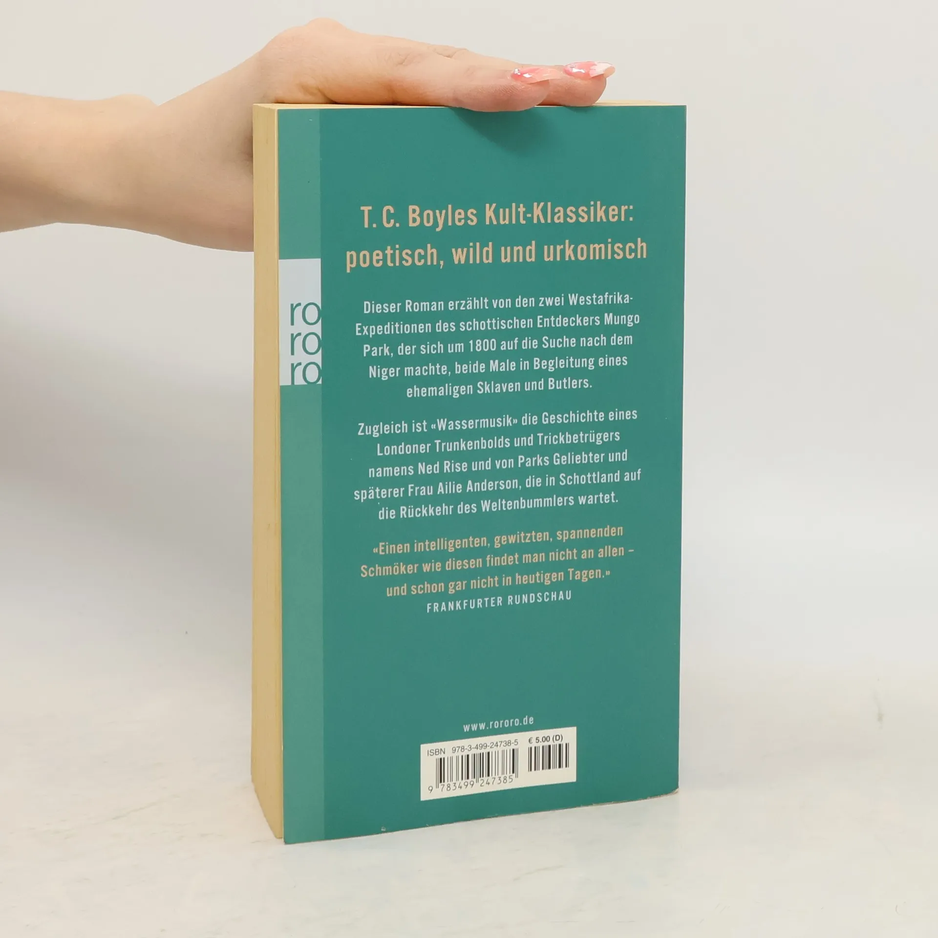 T. C. Boyles Kult-Klassiker: poetisch, wild und urkomisch. Dieser Roman erzählt von den zwei Westafrika-Expeditionen des schottischen Entdeckers Mungo Park, der sich um 1800 auf die Suche nach dem Niger machte, beide Male in Begleitung eines ehemaligen Sklaven und Butlers. Zugleich ist „Wassermusik“ die Geschichte eines Londoner Trunkenbolds und Trickbetrügers namens Ned Rise und von Parks Geliebter und spätere Frau Ailie Anderson, die in Schottland auf die Rückkehr des Weltenbummlers wartet. „Einen intelligenten, gewitzten, spannenden Schmöker wie diesen findet man nicht an allen – und schon gar nicht in heutigen Tagen.“ (Frankfurter Rundschau)
