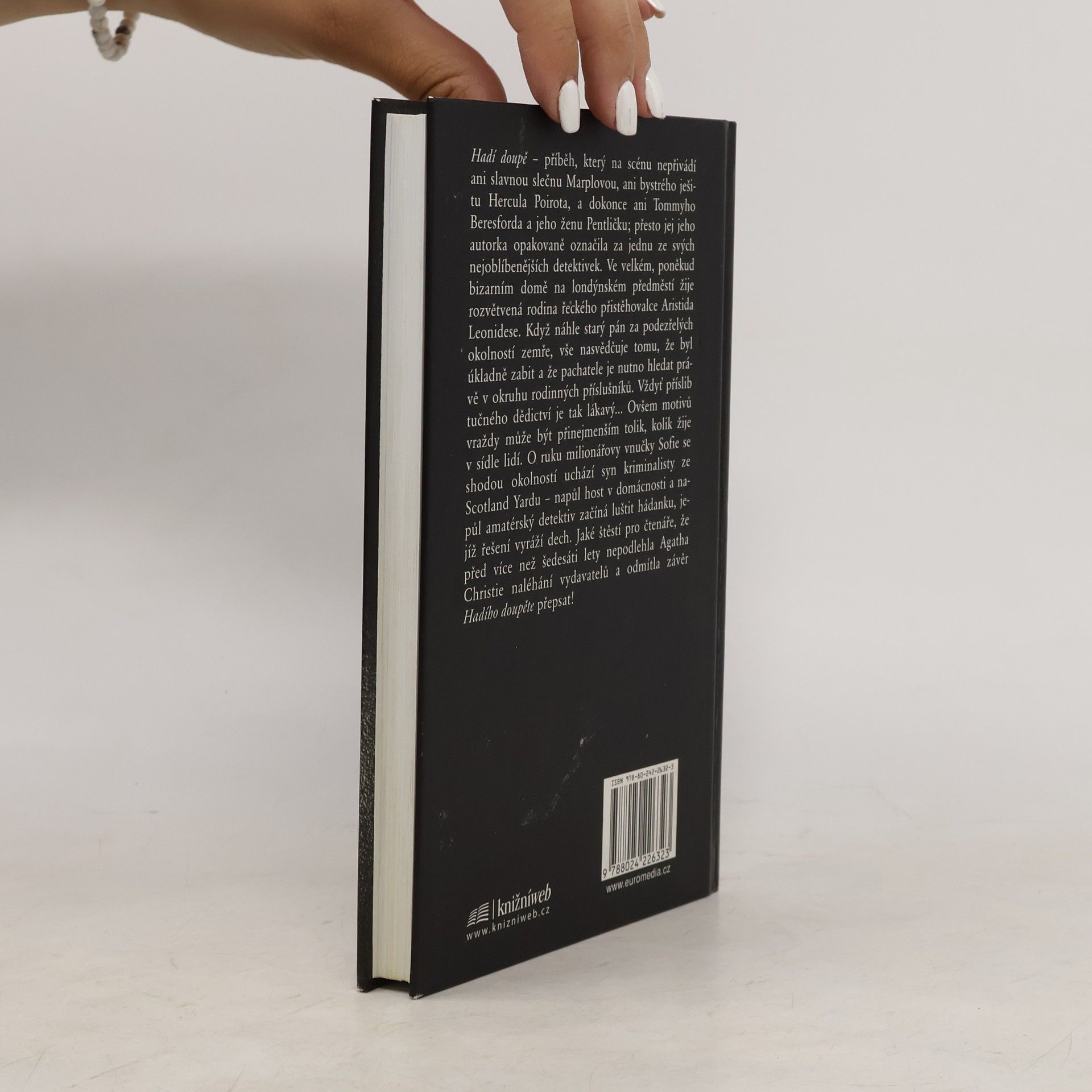 Hadí doupě – příběh, který na scénu nepřivádí ani slavnou slečnu Marplovou, ani bystrého ješitu Hercula Poirota, a dokonce ani Tommyho Beresforda a jeho ženu Pentličku; přesto jej jeho autorka opakovaně označila za jednu ze svých nejoblíbenějších detektivek. Ve velkém, poněkud bizarním domě na londýnském předměstí žije rozvětvená rodina řeckého přistěhovalce Aristida Leonidese. Když náhle starý pán za podezřelých okolností zemře, vše nasvědčuje tomu, že byl úkladně zabit a že pachatele je nutno hledat právě v okruhu rodinných příslušníků. Vždyť příslib tučného dědictví je tak lákavý… Ovšem motivů vraždy může být přinejmenším tolik, kolik žije na sídle lidí. O ruku milionářovy vnučky Sofie se shodou okolností uchází syn kriminalisty ze Scotland Yardu – napůl host v domácnosti a napůl amatérský detektiv začíná luštit hádanku, jejíž řešení vyráží dech. Jaké štěstí pro čtenáře, že před více než padesáti lety nepodlehla Agatha Christie naléhání vydavatelů a odmítla závěr Hadího doupěte přepsat! Přeložil Karel Voleský. Vydání třetí.