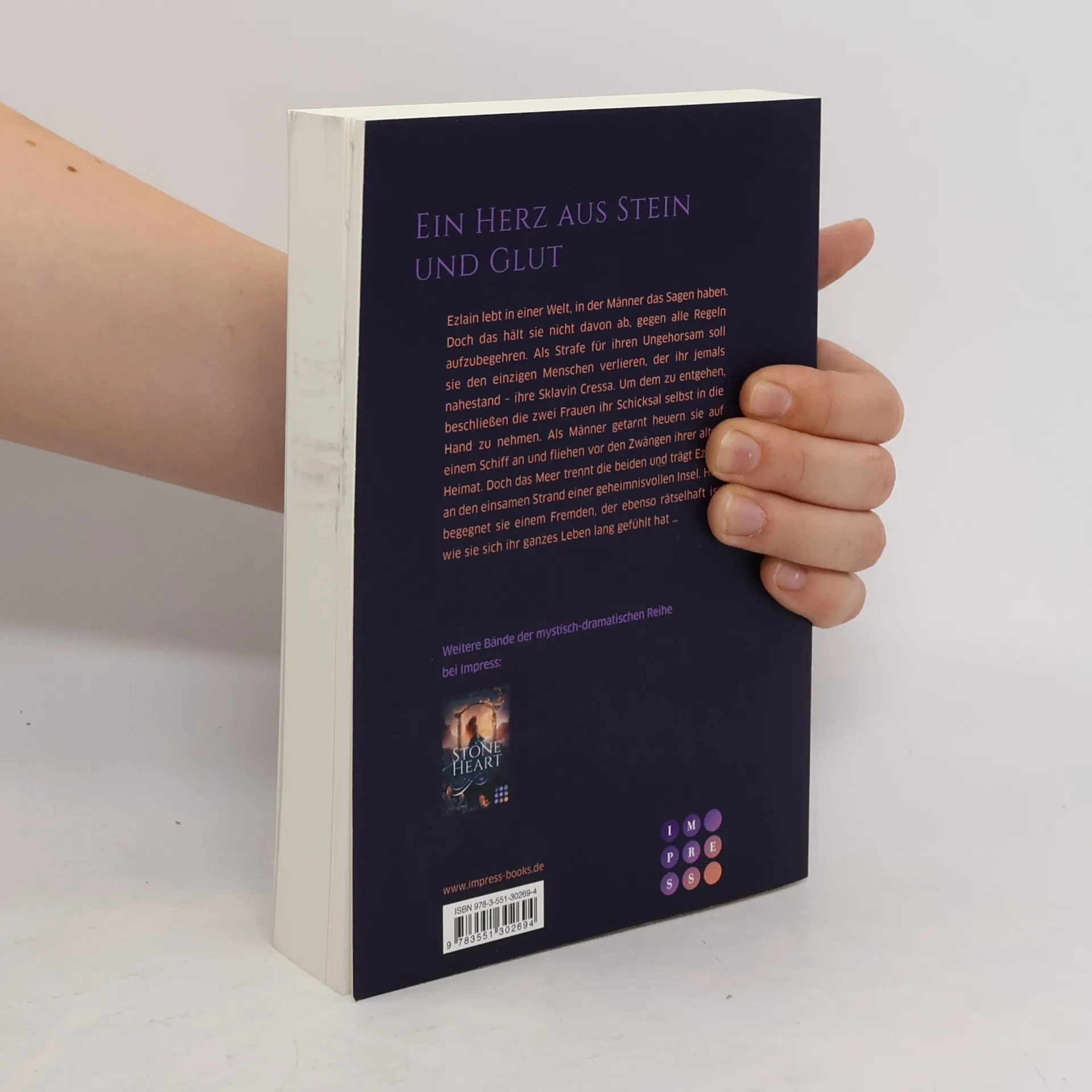 Neues von der Erfolgsautorin Asuka Lionera! **Ein Herz aus Stein und Glut** Ezlain lebt in einer Welt, in der Männer das Sagen haben. Doch das hält sie nicht davon ab, gegen alle Regeln aufzubegehren. Als Strafe für ihren Ungehorsam soll sie den einzigen Menschen verlieren, der ihr jemals nahestand – ihre Sklavin Cressa. Um dem zu entgehen, beschließen die zwei Frauen ihr Schicksal selbst in die Hand zu nehmen. Als Männer getarnt heuern sie auf einem Schiff an und fliehen vor den Zwängen ihrer alten Heimat. Doch das Meer trennt die beiden und trägt Ezlain an den einsamen Strand einer geheimnisvollen Insel. Hier begegnet sie einem Fremden, der ebenso rätselhaft ist, wie sie sich ihr ganzes Leben lang gefühlt hat ... Mystisch-raue Atmosphäre trifft auf magisch-romantischen Fluch: ein Fantasy-Liebesroman, der unter die Haut geht. Schlägt ein Herz in deiner Brust oder ruht ein Stein darin? //Dies ist der erste Band der mystisch-dramatischen Buchserie »Stoneheart« von der beliebten Fantasy-Autorin Asuka Lionera. Alle Romane der Fantasy-Liebesgeschichte bei Impress: -- Stoneheart 1: Geraubte Flamme -- Stoneheart 2: Befreites Feuer// Diese Reihe ist abgeschlossen.