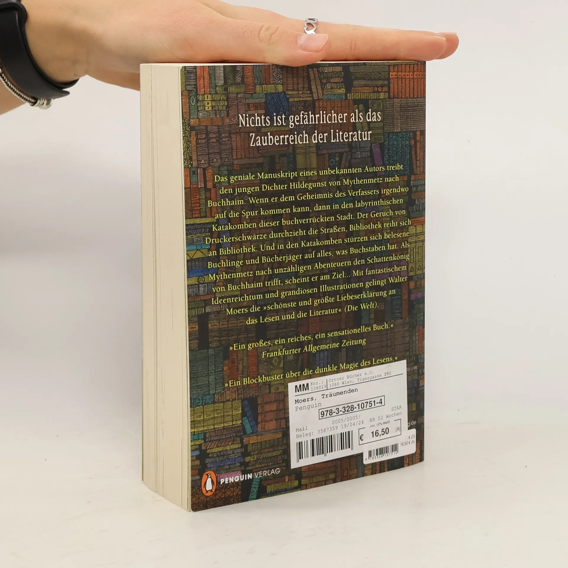 Der junge Dichter Hildegunst von Mythenmetz erbt ein makelloses Manuskript, dessen Geheimnis er ergründen möchte. Die Spur weist nach Buchhaim, der Stadt der Träumenden Bücher … Walter Moers entführt uns in das Zauberreich der Literatur, wo Bücher nicht nur spannend oder komisch sind, sondern auch in den Wahnsinn treiben oder sogar töten können. Nur wer bereit ist, derartige Risiken in Kauf zu nehmen, möge dem Autor folgen. Allen anderen wünschen wir ein gesundes, aber todlangweiliges Leben!
