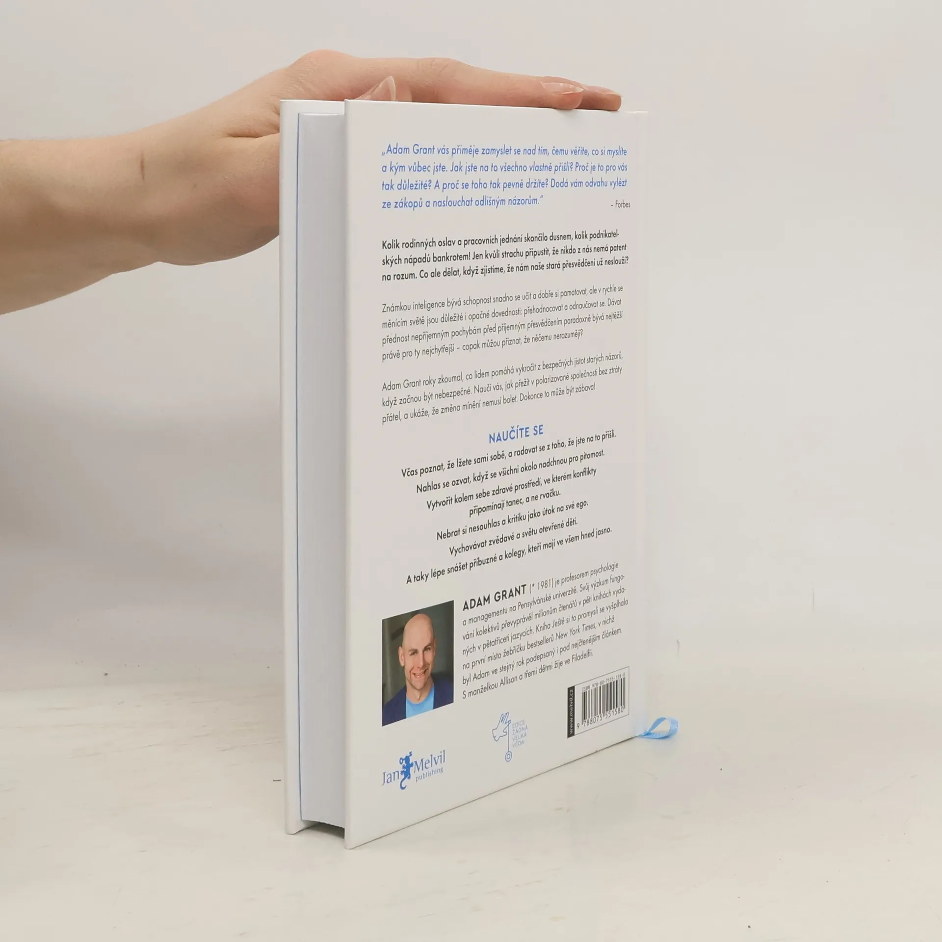 Inteligence je obvykle vnímána jako schopnost myslet a učit se, ale v rychle se měnícím světě je důležitější jiný soubor kognitivních dovedností: schopnost přehodnocovat a odnaučovat se. Dávat přednost nepohodlí pochybností před zažitým přesvědčením. Nenaslouchat pouze názorům, které nám dělají dobře, ale dát prostor myšlenkám, které nás nutí k zamyšlení. Nevnímat něčí nesouhlas jako útok na své ego. Samotná inteligence však problém neřeší: čím jsme bystřejší, tím slepější můžeme být vůči svým vlastním omezením. Organizační psycholog Adam Grant vás v této knize naučí, jak mít otevřenou mysl. Na základě provokativních myšlenek a pečlivých důkazů zkoumá, jak se radovat z toho, že se mýlíme. Jen tak se však můžeme stát celoživotním nadšeným studentem světa. Vždyť je osvobozující, že nemusíme věřit všemu, co si myslíme, ani přijímat vše, co zrovna cítíme! Vzdejme se názorů, které nám už neslouží, a dejme přednost mentální flexibilitě před hloupou důsledností.