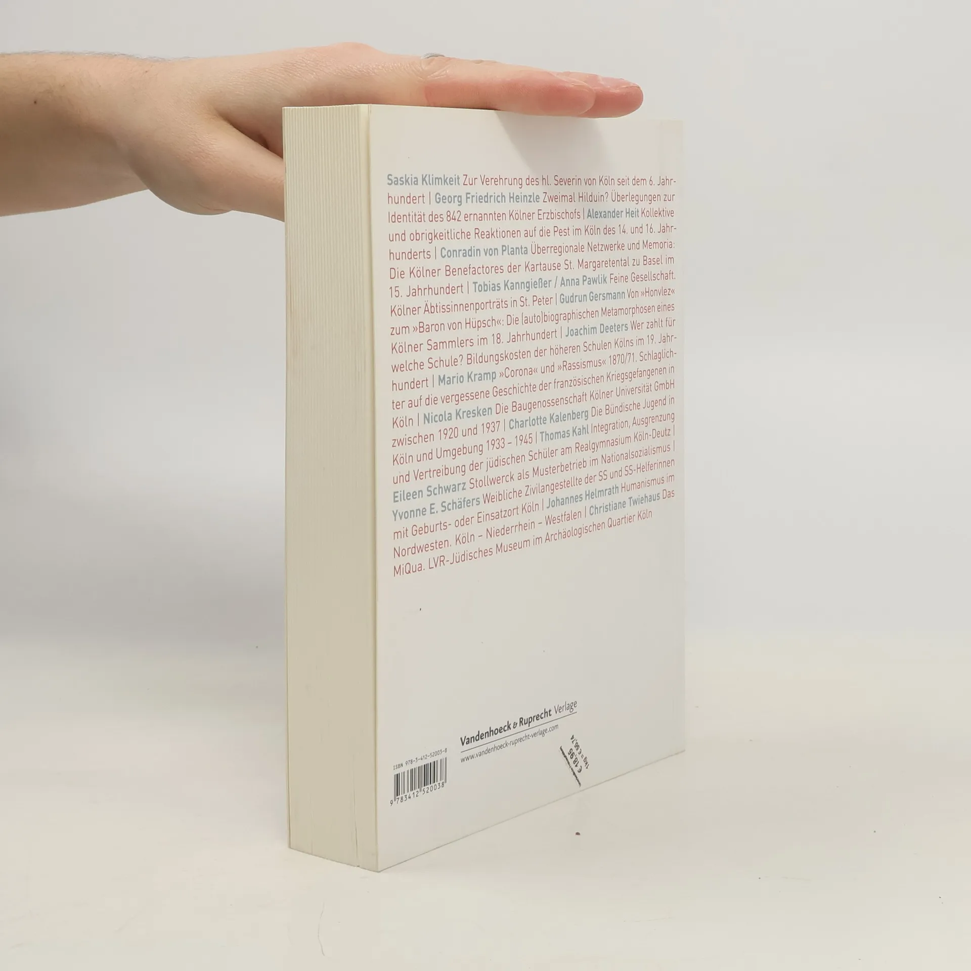 Die aktuelle Ausgabe der Geschichte in Koln setzt sich kritisch mit jungsten Forschungsergebnissen zu Person und Kult des hl. Severin auseinander, fragt nach Identitat des Kolner Erzbischofs Hilduin und beleuchtet, wie man im spatmittelterlichen und fruhneuzeitlichen Koln mit der Pest umgegangen ist. Weitere Beitrage befassen sich mit Kolner Wohltatern der Kartause in Basel, Portrats der Abtissinnen von St. Cacilien, dem Kolner Sammler Baron von Hupsch, der Finanzierung des Schulwesens im 19. Jahrhundert sowie franzosischen Kriegsgefangenenlagern in Koln nach dem 1870/71er Krieg. Ins 20. Jahrhundert fuhren die Beitrage uber die Baugenossenschaft von Professoren der neuen Kolner Universitat, die Bundische Jugend in Koln, judische Schuler am Deutzer Realgymnasium, den Susswarenhersteller Gebruder Stollwerck A.G. als Nationalsozialistischer Musterbetrieb und Frauen, deren Arbeitsgeber die SS war. Abgerundet wird der Band durch zwei Miszellen zu aktuellen Themen und Besprechungen jungst erschienener Bucher.