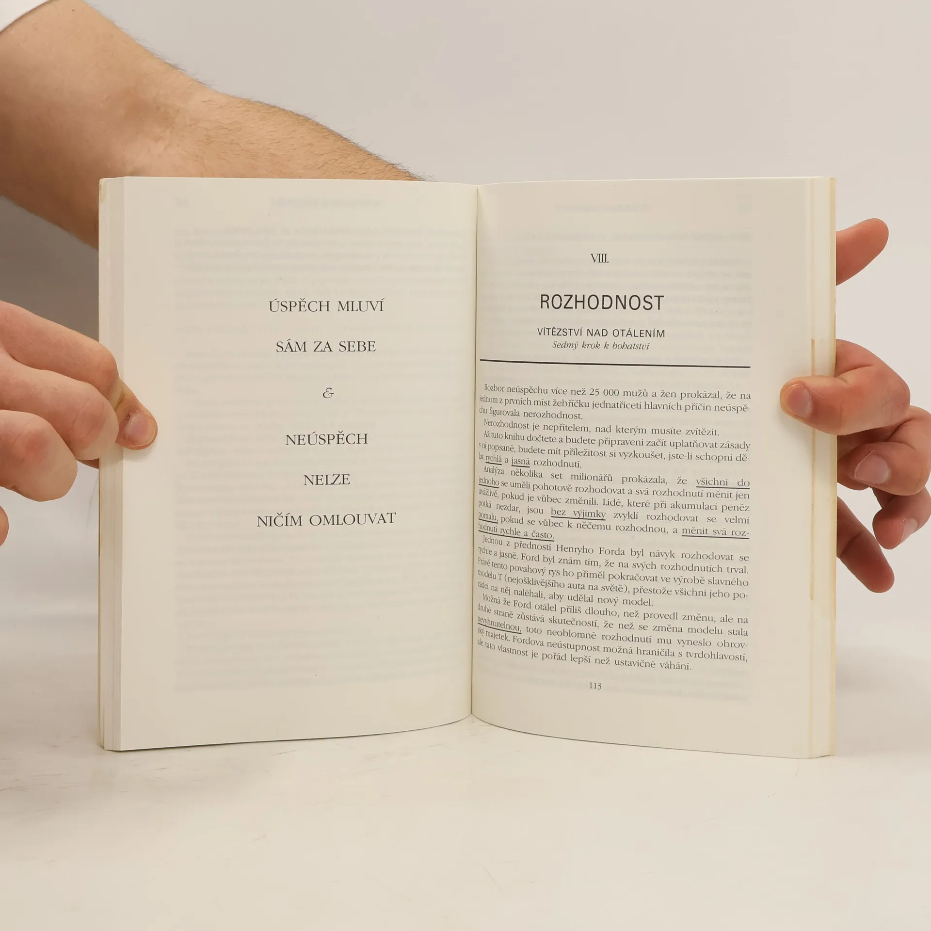 První vydání amerického bestselleru. Kniha nás naučí rozvíjet všechny dobré vlastnosti jako je vůle, rozhodnost, vytrvalost a pevný charakter. Je to návod na bohatství nejenom materiální, ale především bohatství vnitřní. Poukazuje na naše skryté kvality, na náš talent a podává návod, jak ho využít. Dozvíte se, jak si vytvořit správný okruh spolupracovníků, jak podnikat, jak začít, jak vytrvalostí dovést své záměry k úspěšnému konci. Všechno materiální má začátek v myšlence, to je základní idea této knihy od Napoleona Hilla. V této knize najdete tajemství, jak vydělat peníze. Může to změnit váš život. MYŠLENÍM K BOHATSTVÍ vychází z autorova slavného PRINCIPU ÚSPĚCHU. Zahrnuje moudrost, ke které dospěli bohatí a úspěšní lidé. Kniha byla inspirována magickou poučkou Andrewa Carnegieho. Carnegie odhalil tajemství svého úspěchu několika mladým mužům, kteří se díky tomu dopracovali velkého bohatství. Tato kniha vás naučí tomuto tajemství — i tajemství jiných velkých lidí. Ukáže vám nejenom CO DĚLAT, ale i JAK TO DĚLAT. Pokud se naučíte uplatňovat jednoduché základní techniky, ovládnete tajemství opravdového a trvalého úspěchu. BUDETE MÍT VŠE, CO JSTE SI V ŽIVOTĚ PŘÁLI.... celý text