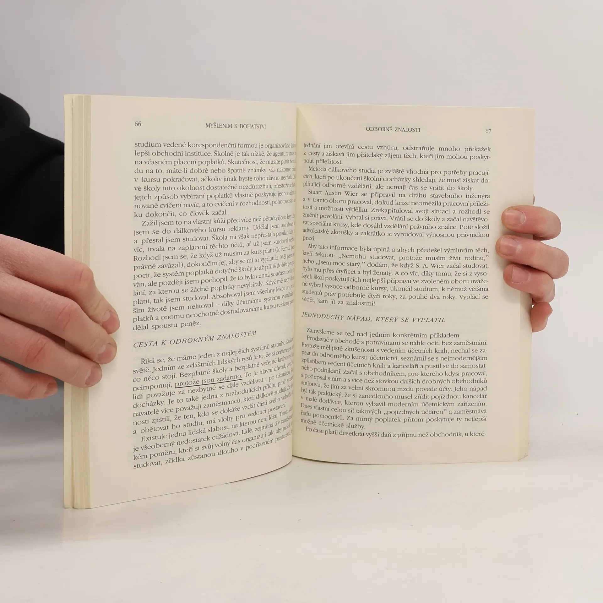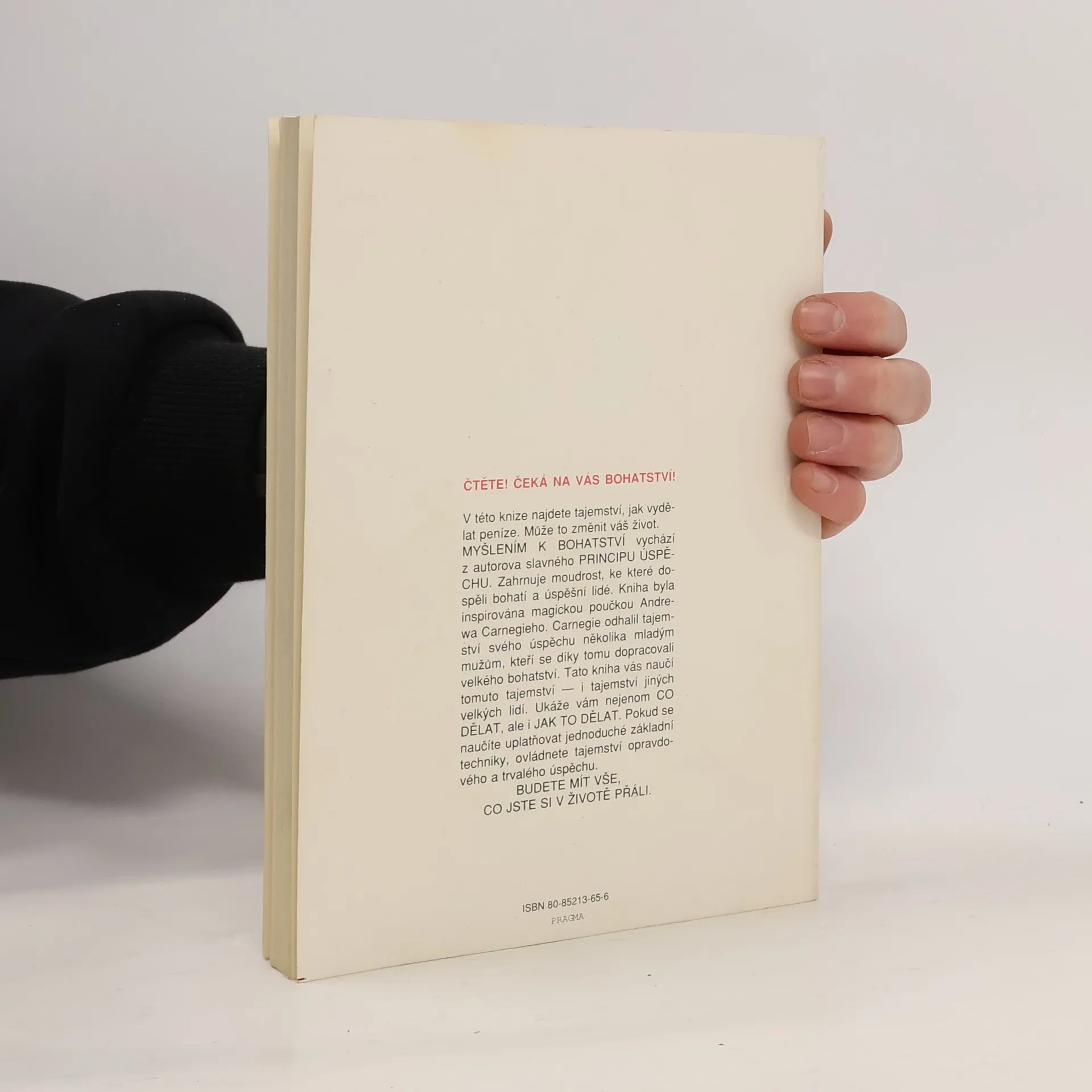 První vydání amerického bestselleru. Kniha nás naučí rozvíjet všechny dobré vlastnosti jako je vůle, rozhodnost, vytrvalost a pevný charakter. Je to návod na bohatství nejenom materiální, ale především bohatství vnitřní. Poukazuje na naše skryté kvality, na náš talent a podává návod, jak ho využít. Dozvíte se, jak si vytvořit správný okruh spolupracovníků, jak podnikat, jak začít, jak vytrvalostí dovést své záměry k úspěšnému konci. Všechno materiální má začátek v myšlence, to je základní idea této knihy od Napoleona Hilla. V této knize najdete tajemství, jak vydělat peníze. Může to změnit váš život. MYŠLENÍM K BOHATSTVÍ vychází z autorova slavného PRINCIPU ÚSPĚCHU. Zahrnuje moudrost, ke které dospěli bohatí a úspěšní lidé. Kniha byla inspirována magickou poučkou Andrewa Carnegieho. Carnegie odhalil tajemství svého úspěchu několika mladým mužům, kteří se díky tomu dopracovali velkého bohatství. Tato kniha vás naučí tomuto tajemství — i tajemství jiných velkých lidí. Ukáže vám nejenom CO DĚLAT, ale i JAK TO DĚLAT. Pokud se naučíte uplatňovat jednoduché základní techniky, ovládnete tajemství opravdového a trvalého úspěchu. BUDETE MÍT VŠE, CO JSTE SI V ŽIVOTĚ PŘÁLI.... celý text