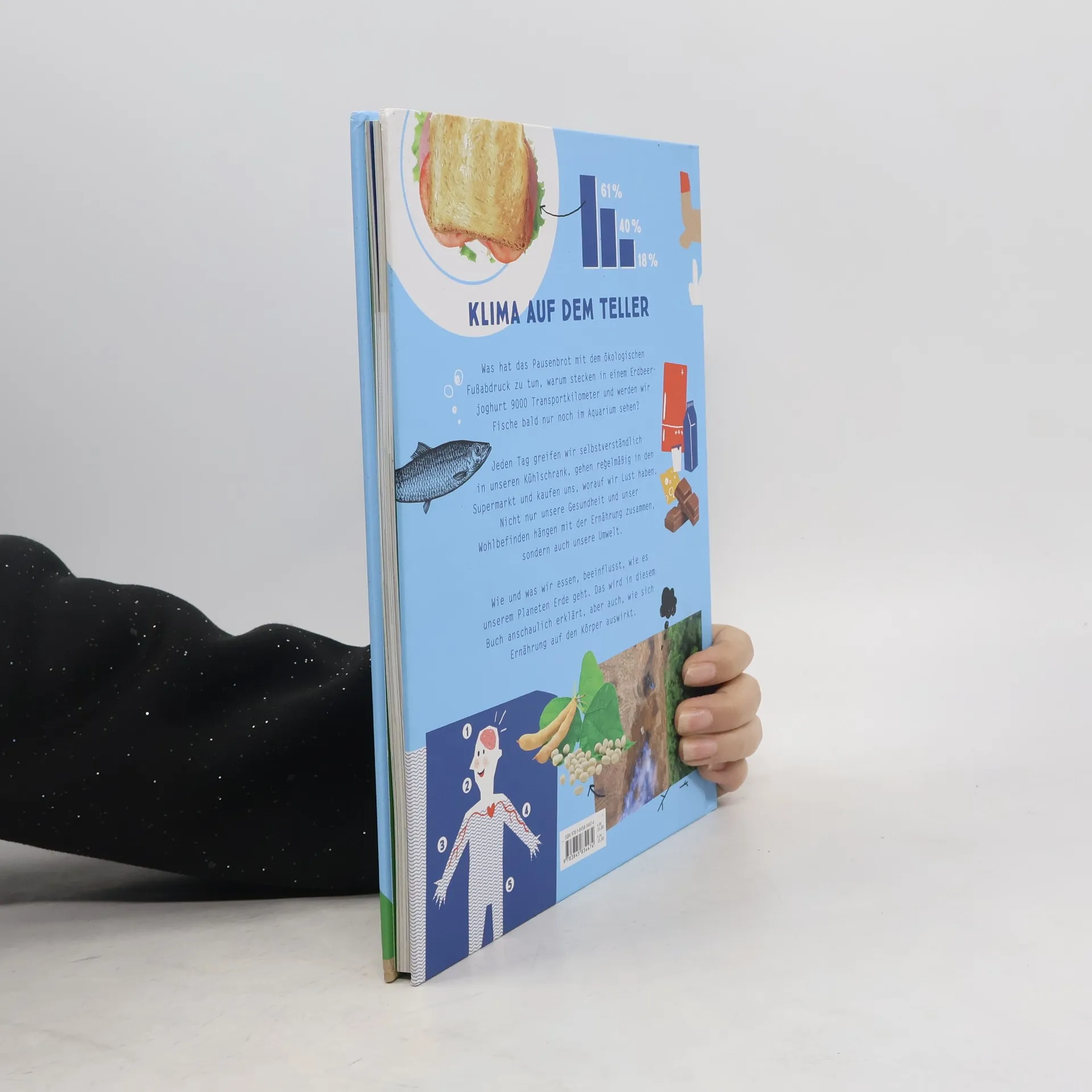 Klima auf dem Teller. Was hat das Pausenbrot mit dem ökologischen Fussabdruck zu tun. Warum stecken in einem Erdbeerjoghurt 9000 Transportkilometer und werden wir Fische bald nur noch im Aquarium sehen? Jeden Tag greifen wir selbstverständlich in unseren Kühlschrank, gehen regelmässig in den Supermarkt und kaufen uns, worauf wir Lust haben. Nicht nur unsere Gesundheit und unser Wohlbefinden hängen mit der Ernährung zusammen, sondern auch unsere Umwelt. Wie und was wir essen, beeinflusst, wie es unserem Planeten Erde geht. Das wird in diesem Buch anschaulich erklärt, aber auch, wie sich Ernährung auf den Körper auswirkt