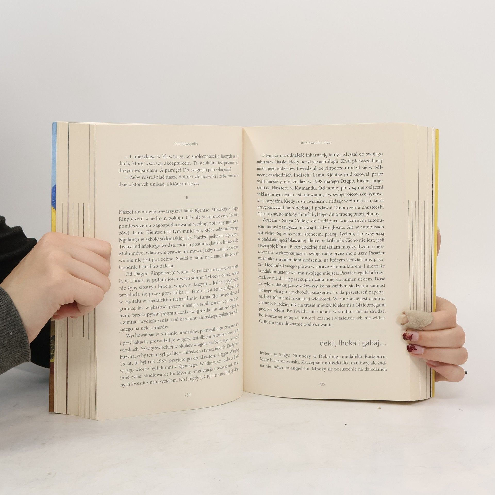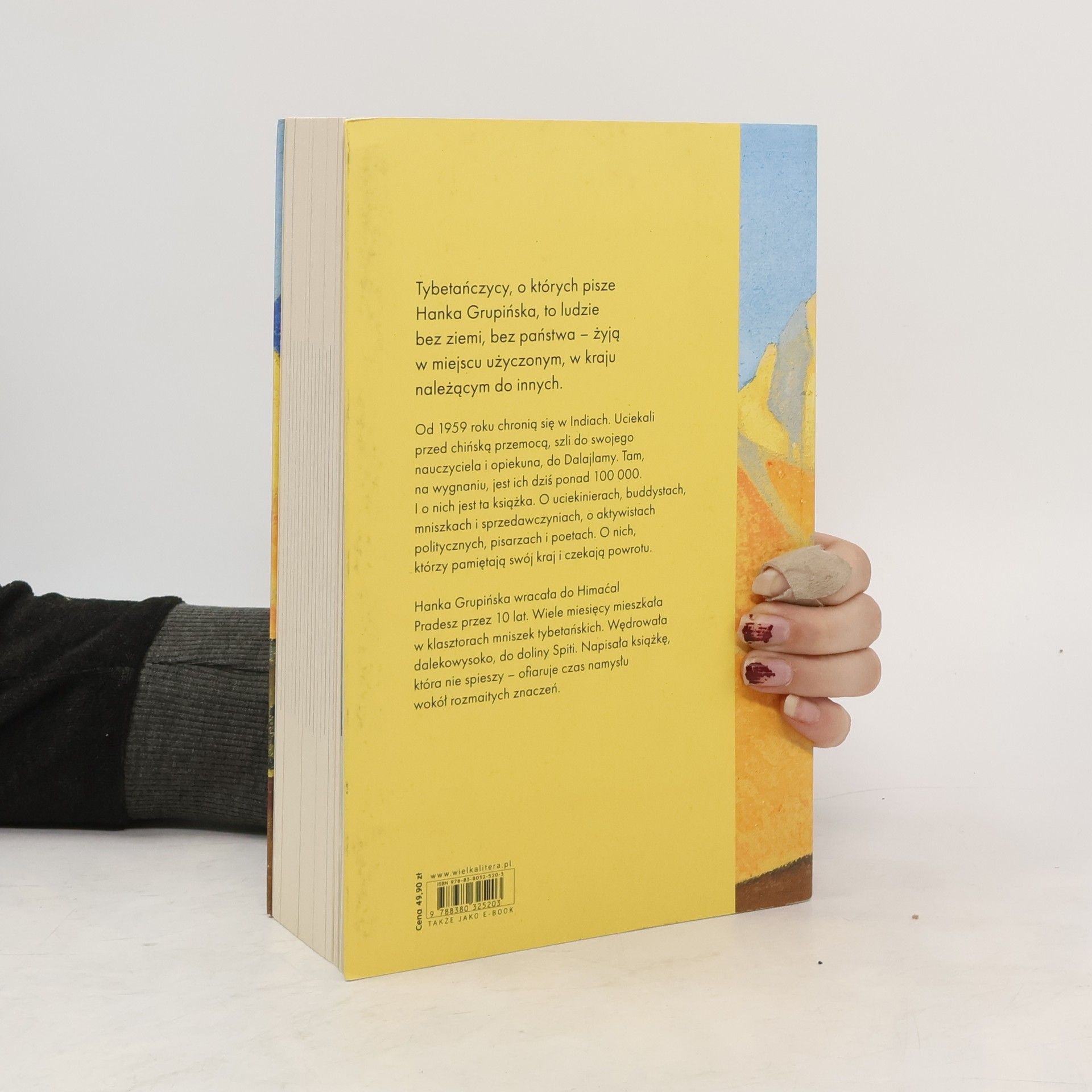 Tybetańczycy, o których pisze Hanka Grupińska, to ludzie bez ziemi, bez państwa – żyją w miejscu użyczonym, w kraju należącym do innych.Od 1959 roku chronią się w Indiach. Uciekali przed chińską przemocą, szli do swojego nauczyciela i opiekuna, do Dalajlamy. Tam, na wygnaniu, jest ich dziś ponad 100 000. I o nich jest ta książka. O uciekinierach, buddystach, mniszkach i sprzedawczyniach, o aktywistach politycznych, pisarzach i poetach. O nich, którzy pamiętają swój kraj i czekają powrotu.Hanka Grupińska wracała do Himaćal Pradesz przez 10 lat. Wiele miesięcy mieszkała w klasztorach mniszek tybetańskich. Wędrowała dalekowysoko, do doliny Spiti. Napisała książkę, która nie spieszy – ofiaruje czas namysłu wokół rozmaitych znaczeń.