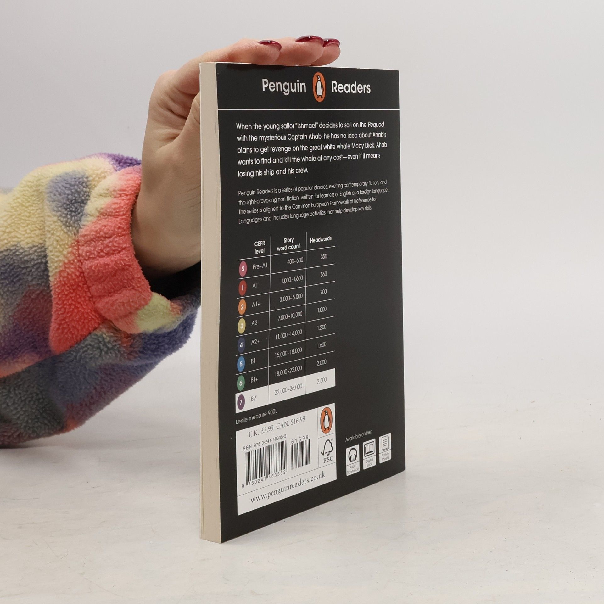 Penguin Readers is an ELT graded reader series for learners of English as a foreign language. With carefully adapted text, new illustrations and language learning exercises , the print edition also includes instructions to access supporting material online.Titles include popular classics, exciting contemporary fiction, and thought-provoking non-fiction, introducing language learners to bestselling authors and compelling content .The eight levels of Penguin Readers follow the Common European Framework of Reference for language learning ( CEFR ). Exercises at the back of each Reader help language learners to practise grammar, vocabulary, and key exam skills. Before, during and after-reading questions test readers' story comprehension and develop vocabulary.Visit the Penguin Readers websiteExclusively with the print edition, readers can unlock online resources including a digital book, audio edition, lesson plans and answer keys.When the young sailor "Ishmael" decides to sail on the Pequod with the mysterious Captain Ahab, he has no idea about Ahab's plans to get revenge on the great white whale Moby Dick. Ahab wants to find and kill the whale at any cost - even if it means losing his ship and his crew.