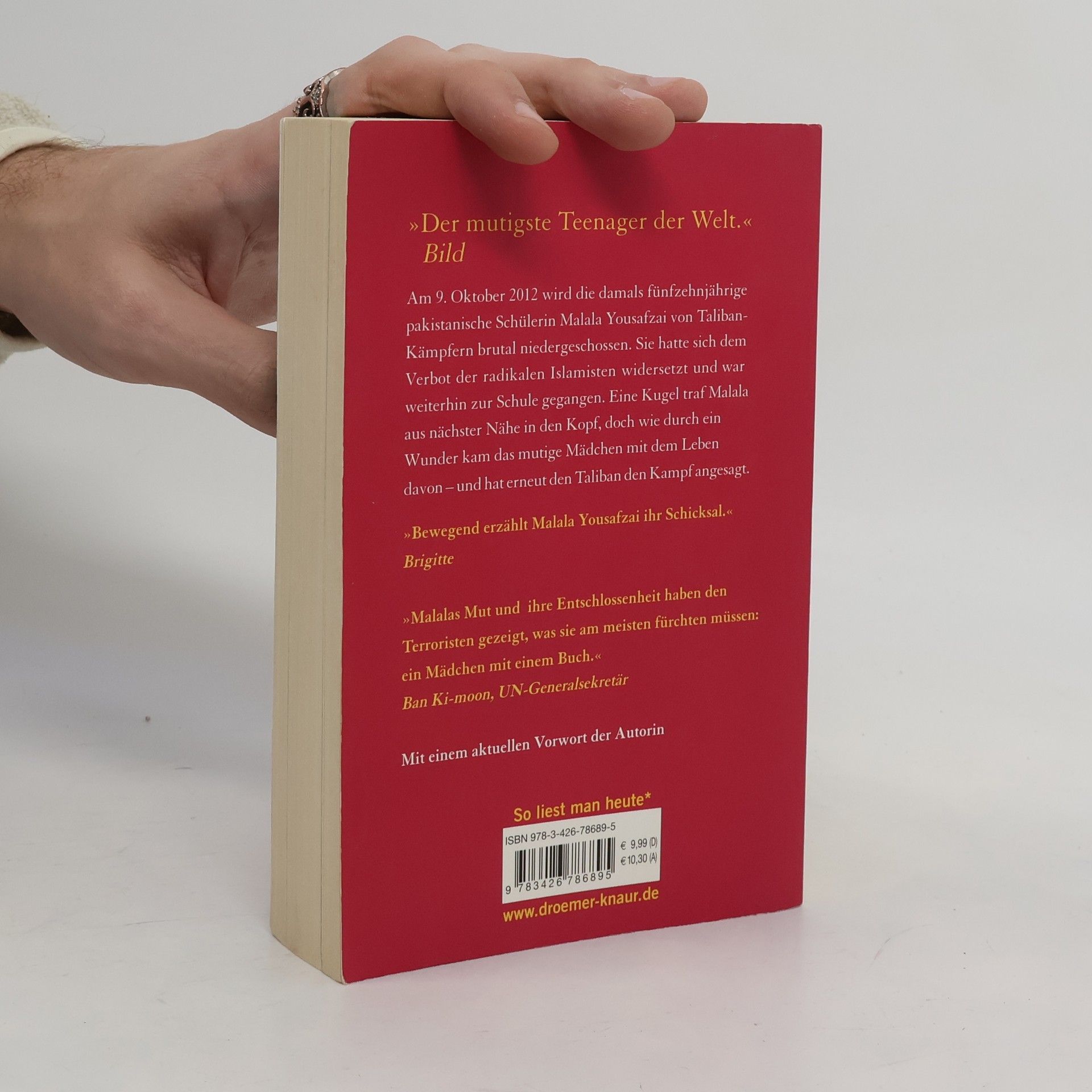 Am 9. Oktober 2012 wird die junge Pakistanerin Malala Yousafzai auf ihrem Schulweg überfallen und niedergeschossen. Die Fünfzehnjährige hatte sich den Taliban widersetzt, die Mädchen verbieten, zur Schule zu gehen. Wie durch ein Wunder kommt Malala mit dem Leben davon. Als im Herbst 2013 ihr Buch „Ich bin Malala“ erscheint, ist die Resonanz enorm: Weltweit wird über ihr Schicksal berichtet. Im Juli 2013 hält sie eine beeindruckende Rede vor den Vereinten Nationen. Barack Obama empfängt sie im Weißen Haus, und im Dezember erhält sie den Sacharow-Preis für geistige Freiheit, verliehen vom Europäischen Parlament. Malala Yousafzai lebt heute mit ihrer Familie in England, wo sie wieder zur Schule geht. Malala Yousafzai wird mit dem Friedensnobelpreis 2014 ausgezeichnet. »Dieses Memoir unterstreicht ihre besten Eigenschaften. Ihren Mut und ihre Entschlossenheit kann man nur bewundern. Ihr Hunger nach Bildung und Neugestaltung ist authentisch. Sie wirkt so unschuldig, und da ist diese unverwüstliche Zuversicht. Sie spricht mit einem solchen Gewicht, dass man vergisst, dass Malala erst 16 ist.« The Times »Niemand hat das Recht auf Bildung so knapp, so einprägsam und überzeugend zusammengefasst wie Malala Yousafzai, die tapferste Schülerin der Welt.« Berliner Zeitung »Der mutigste Teenager der Welt« Bild »Bewegend erzählt Malala Yousafzai ihr Schicksal.« Brigitte