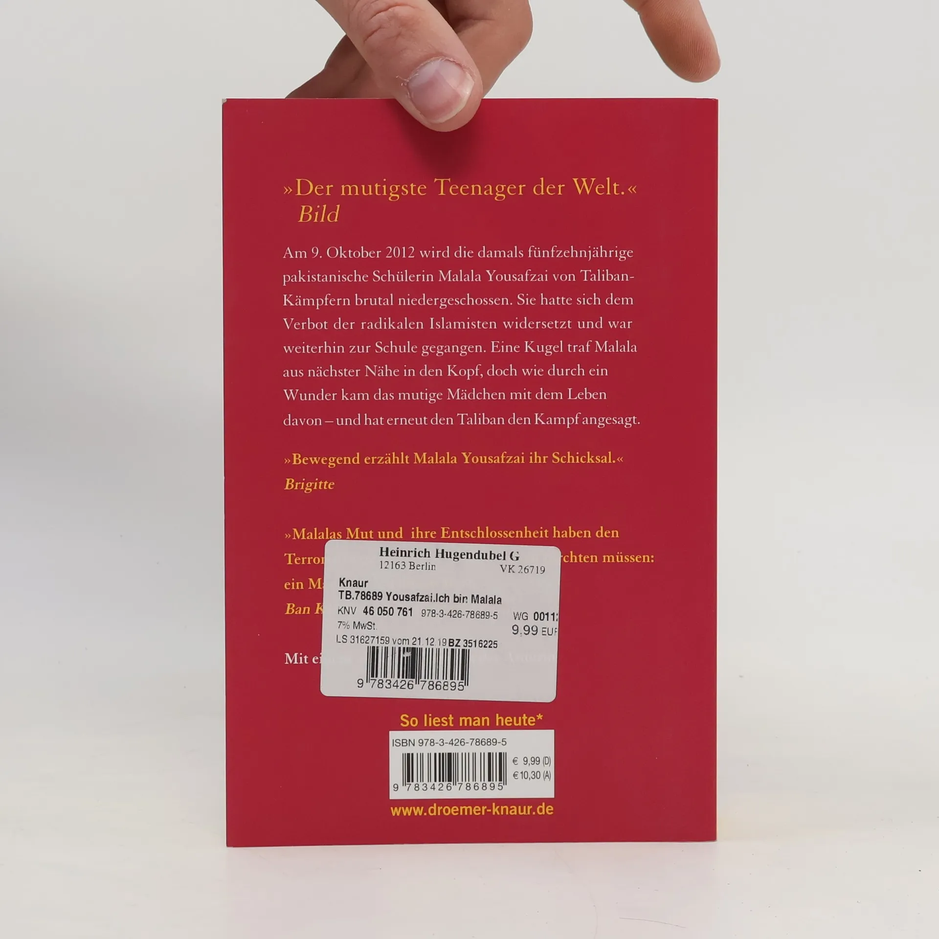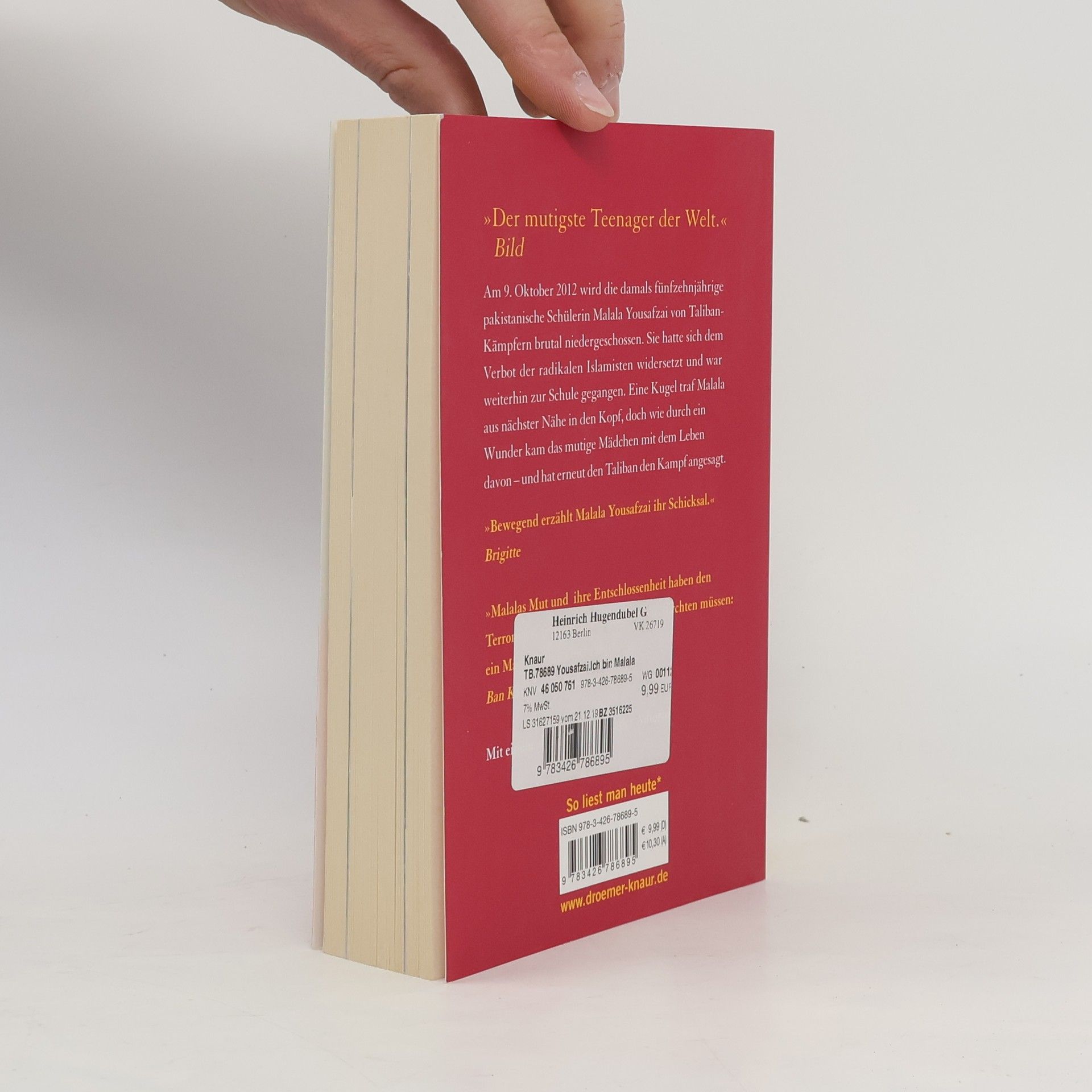 Am 9. Oktober 2012 wird die junge Pakistanerin Malala Yousafzai auf ihrem Schulweg überfallen und niedergeschossen. Die Fünfzehnjährige hatte sich den Taliban widersetzt, die Mädchen verbieten, zur Schule zu gehen. Wie durch ein Wunder kommt Malala mit dem Leben davon. Als im Herbst 2013 ihr Buch „Ich bin Malala“ erscheint, ist die Resonanz enorm: Weltweit wird über ihr Schicksal berichtet. Im Juli 2013 hält sie eine beeindruckende Rede vor den Vereinten Nationen. Barack Obama empfängt sie im Weißen Haus, und im Dezember erhält sie den Sacharow-Preis für geistige Freiheit, verliehen vom Europäischen Parlament. Malala Yousafzai lebt heute mit ihrer Familie in England, wo sie wieder zur Schule geht. Malala Yousafzai wird mit dem Friedensnobelpreis 2014 ausgezeichnet. »Dieses Memoir unterstreicht ihre besten Eigenschaften. Ihren Mut und ihre Entschlossenheit kann man nur bewundern. Ihr Hunger nach Bildung und Neugestaltung ist authentisch. Sie wirkt so unschuldig, und da ist diese unverwüstliche Zuversicht. Sie spricht mit einem solchen Gewicht, dass man vergisst, dass Malala erst 16 ist.« The Times »Niemand hat das Recht auf Bildung so knapp, so einprägsam und überzeugend zusammengefasst wie Malala Yousafzai, die tapferste Schülerin der Welt.« Berliner Zeitung »Der mutigste Teenager der Welt« Bild »Bewegend erzählt Malala Yousafzai ihr Schicksal.« Brigitte