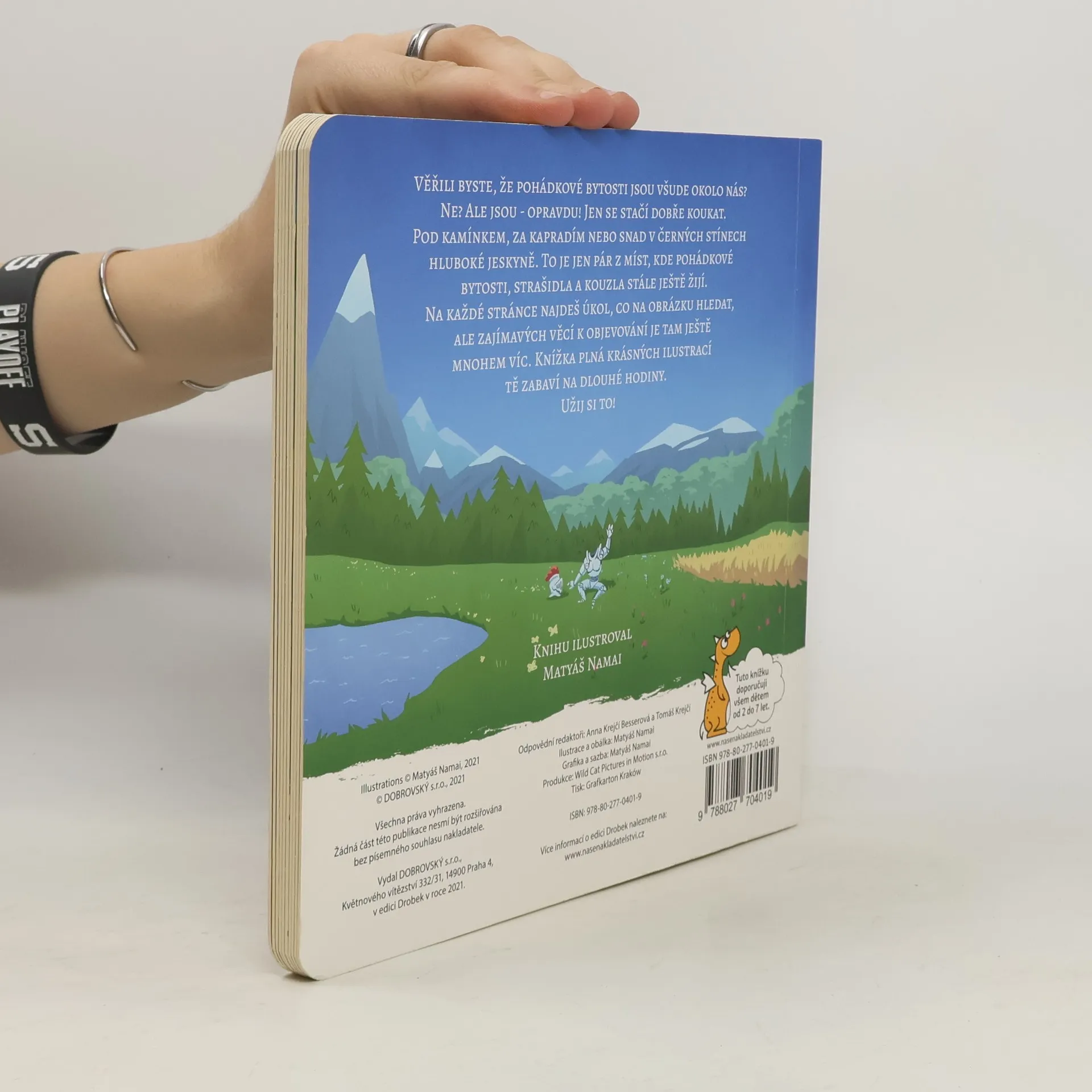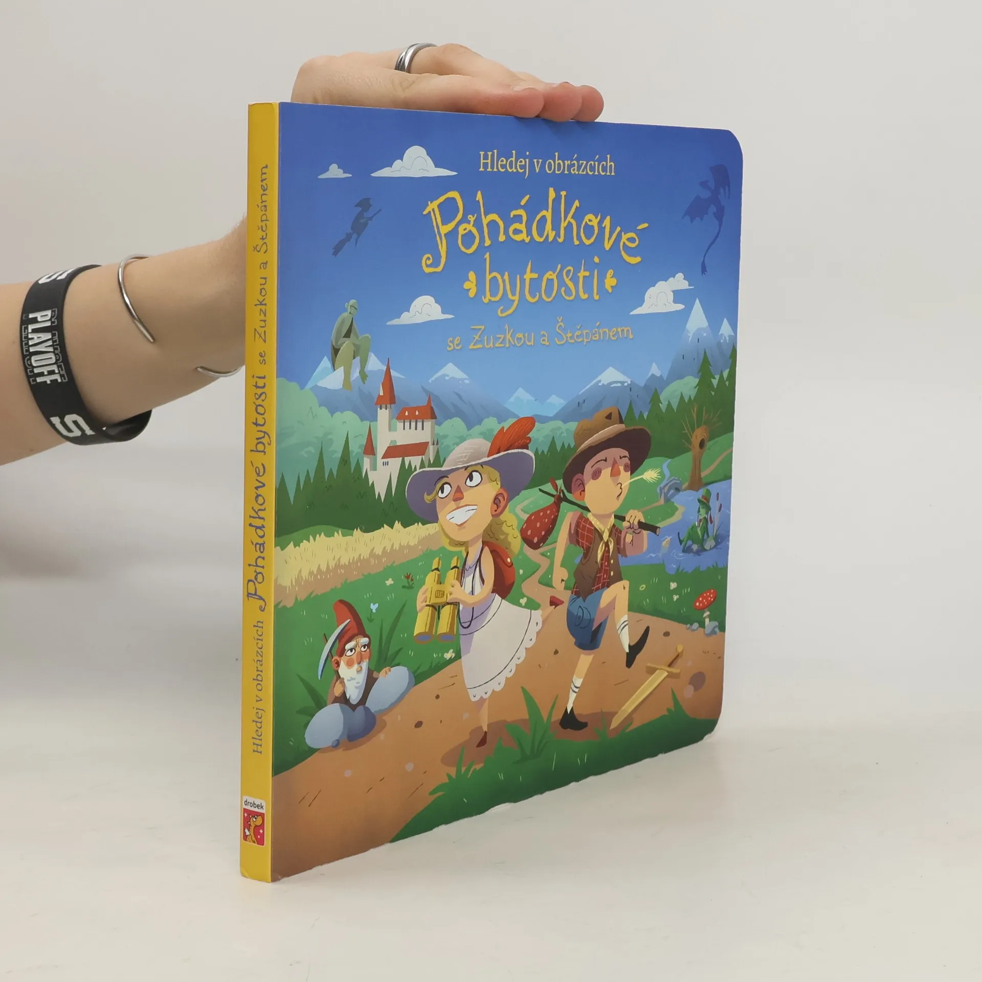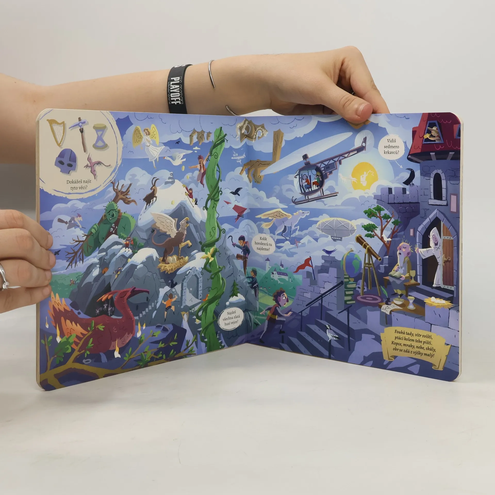 Knížka s celostránkovými ilustracemi plná úkolů zaměřených na hledání pohádkových postav a různých detailů doplněná dvěma verši na každé dvoustraně.