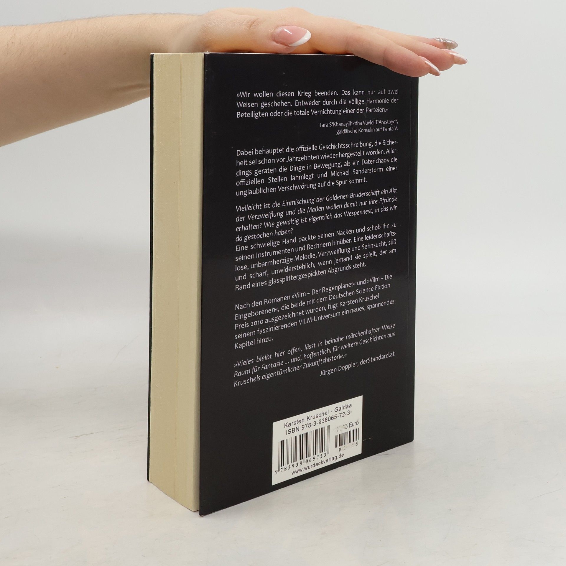 „Wir wollen diesen Krieg beenden. Das kann nur auf zwei Weisen geschehen. Entweder durch die völlige Harmonie der Beteiligten oder die totale Vernichtung einer der Parteien." - Tara S‘Khanayilhkdha Vuvlel T‘Arastoydt, galdäische Konsulin auf Penta V Dabei behauptet die offizielle Geschichtsschreibung, die Sicherheit sei schon vor Jahrzehnten wieder hergestellt worden. Allerdings geraten die Dinge in Bewegung, als ein Datenchaos die offiziellen Stellen lahmlegt und Michael Sanderstorm einer unglaublichen Verschwörung auf die Spur kommt. „Vielleicht ist die Einmischung der Goldenen Bruderschaft ein Akt der Verzweiflung und die die Maden wollen damit nur ihre Pfründe erhalten? Wie gewaltig ist eigentlich das Wespennest, in das wir da gestochen haben?“ Eine schwielige Hand packte seinen Nacken und schob ihn zu seinen Instrumenten und Rechnern hinüber. Eine leidenschaftslose, unbarmherzige Melodie, Verzweiflung und Sehnsucht, süß und scharf, unwiderstehlich, wenn jemand sie spielt, der am Rand eines glassplittergespickten Abgrunds steht. Nach den Romanen "Vilm - Der Regenplanet" und "Vilm - Die Eingeborenen", die beide mit dem Deutschen Science Fiction Preis 2010 ausgezeichnet wurden, fügt Karsten Kruschel seinem faszinierenden VILM-Universum ein neues, spannendes Kapitel hinzu.