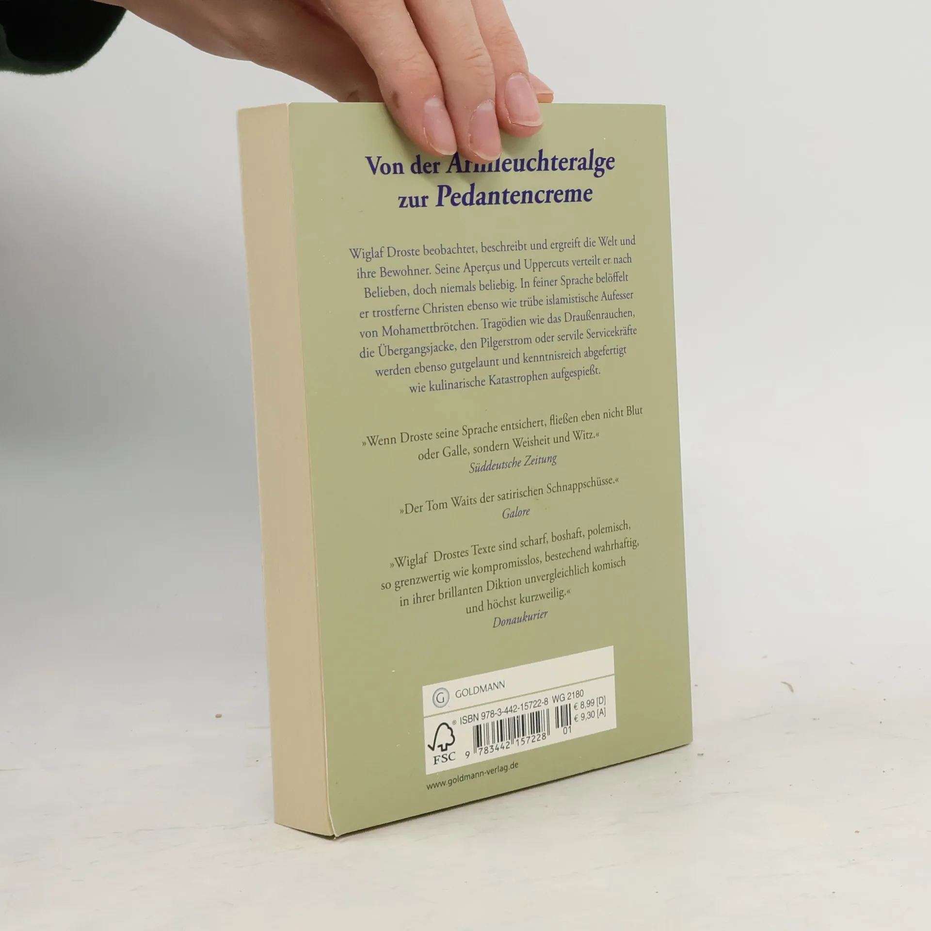 Wiglaf Droste, ein satirischer Beobachter, beschreibt die Welt und ihre Menschen mit klarer, schöner Sprache. Er kombiniert Komik und Polemik und reflektiert über die Blindheit der Gesellschaft sowie die unangenehme Kenntnis ihrer kleinlichen Existenz.