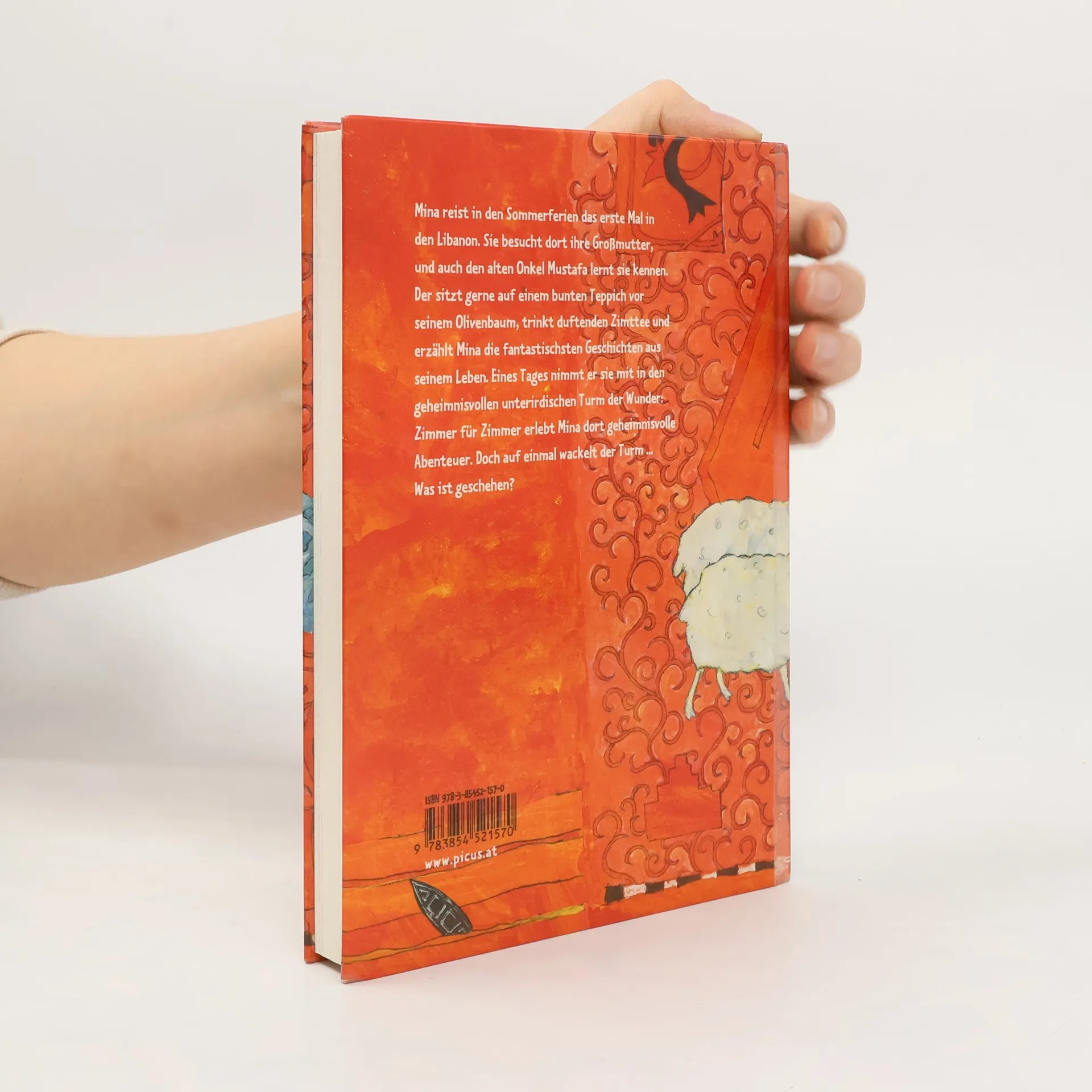 Mina fährt in den Sommerferien das erste Mal in den Libanon. Sie besucht dort ihre Großmutter, und auch den alten Onkel Mustafa lernt sie kennen. Der sitzt gerne auf einem Teppich vor seinem Olivenbaum, trinkt duftenden Zimttee und erzählt Mina die unglaublichsten Geschichten aus seinem Leben. Eines Tages zeigt er ihr seinen geheimnisvollen unterirdischen Turm der Wunder, in dem sich all seine Geschichten in einem eigenen Zimmer wiederfinden. Doch auf einmal fängt der Turm an zu zittern und zu beben rasch bringt der Onkel Mina nach Hause. Dort erklärt man ihr dann das Schreckliche: Ein Krieg ist ausgebrochen! Die Familie flüchtet nach Deutschland zurück, Onkel Mustafa nehmen sie mit. Doch der findet sich in Deutschland gar nicht zurecht. In sensibler, bildreicher Sprache thematisiert Andrea Karimé mit viel Witz die schwer fassbaren Themen Krieg und Heimat und macht Minas Geschichte spielend greifbar und dabei wie nebenbei bestens für Kinder verständlich