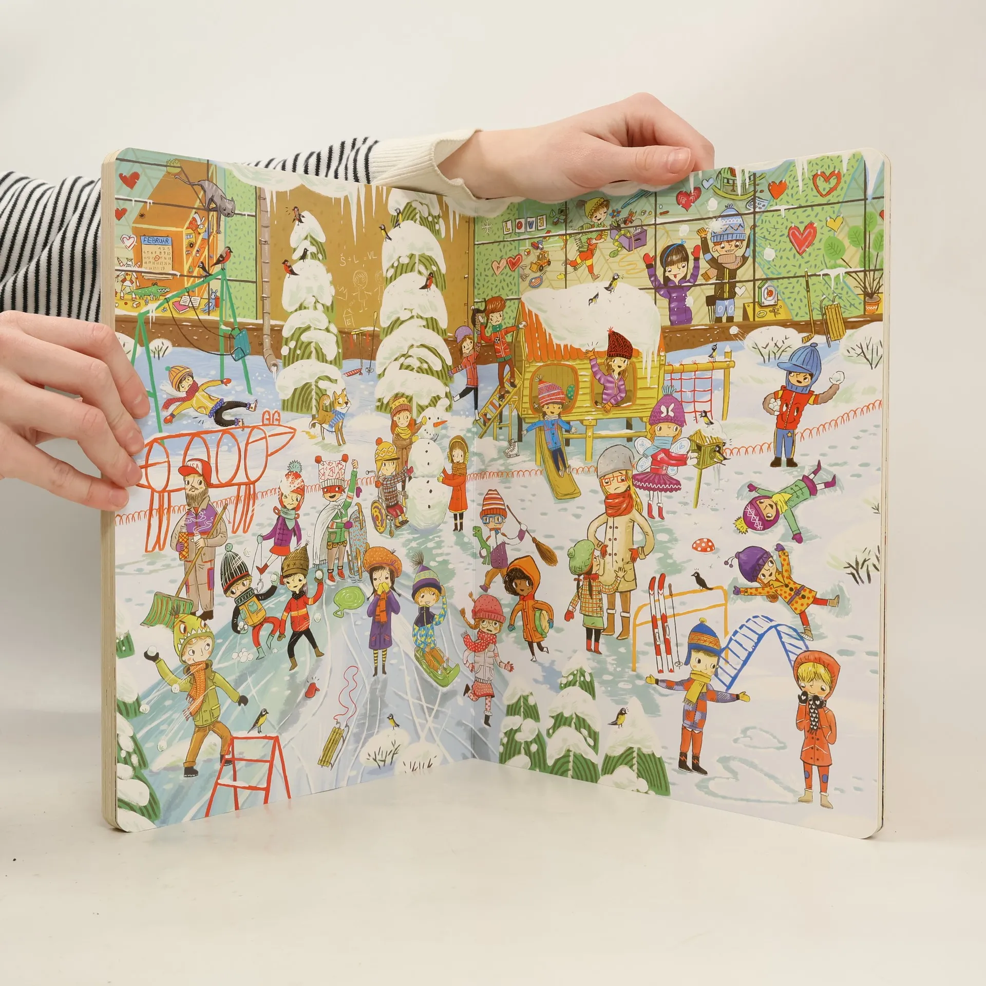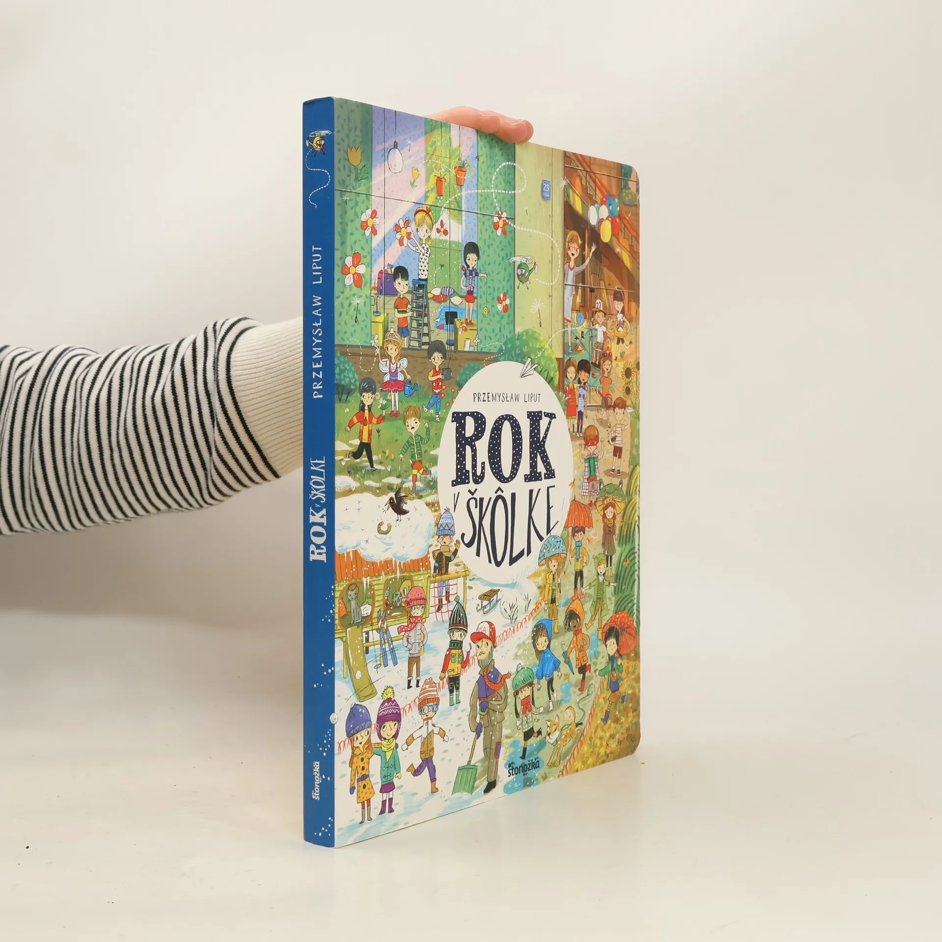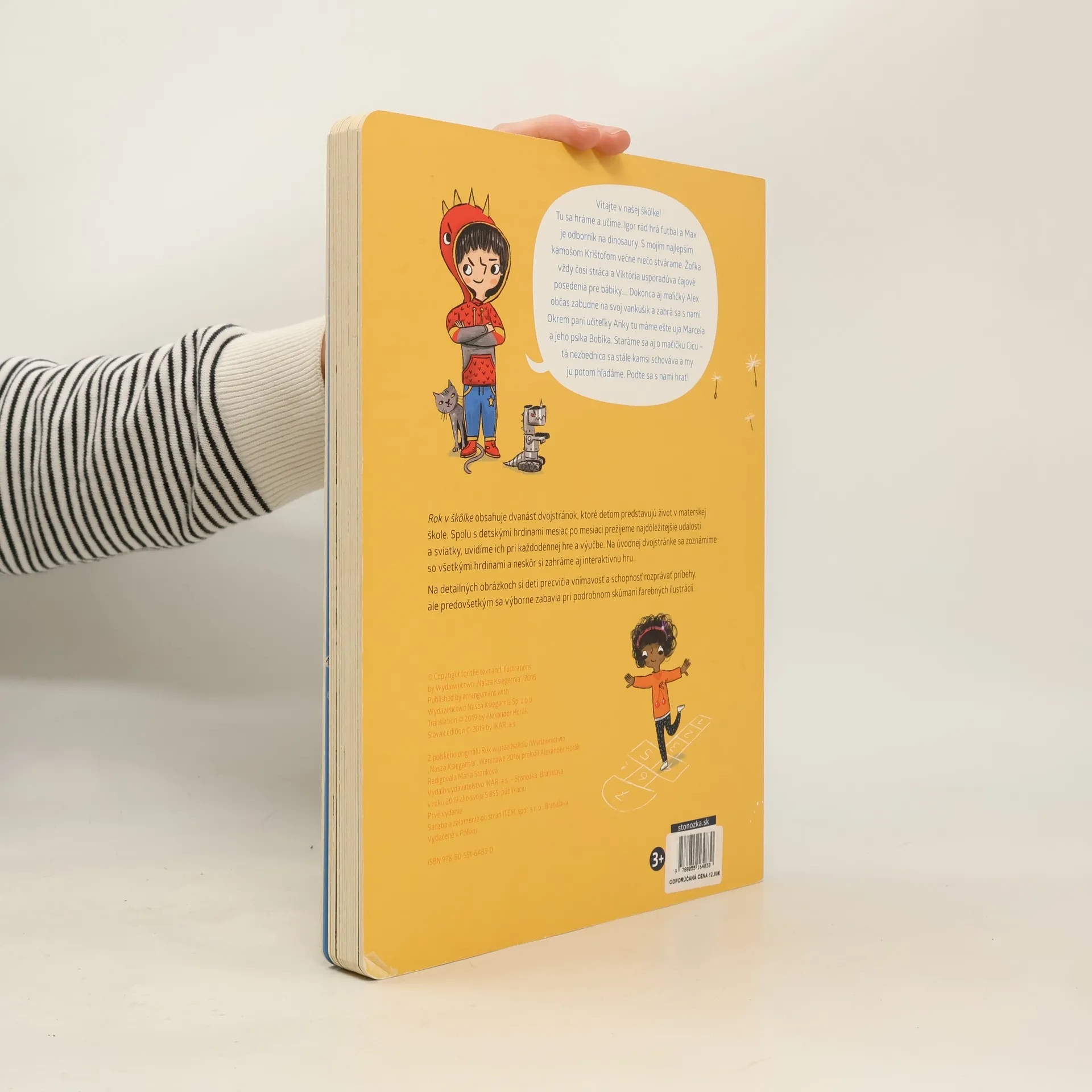 Vitajte v našej škôlke! Tu sa hráme a učíme. Igor rád hrá futbal a Max je odborník na dinosaury. S mojím najlepším kamošom Krištofom večne niečo stvárame. Žofka vždy niečo stráca a Viktória usporadúva čajové posedenia pre bábiky.... Dokonca aj maličký Alex občas zabudne na svoj vankúšik a zahrá sa s nami. Okrem pani učiteľky Anky tu máme ešte uja Marcela a jeho psíka Bobíka. Staráme sa aj o mačičku Cicu – tá nezbednica sa stále kamsi schováva a my ju potom hľadáme. Poďte sa s nami hrať! Rok v škôlke obsahuje dvanásť dvojstránok, ktoré deťom predstavujú život v materskej škole. Spolu s detskými hrdinami mesiac po mesiaci prežijeme najdôležitejšie udalosti a sviatky, uvidíme ich pri každodennej hre a výučbe. Na úvodnej dvojstránke sa zoznámime so všetkými hrdinami a neskôr si zahráme aj interaktívnu hru. Na detailných obrázkoch si deti precvičia vnímavosť a schopnosť rozprávať príbehy, ale predovšetkým sa výborne zabavia pri podrobnom skúmaní farebných ilustrácií.