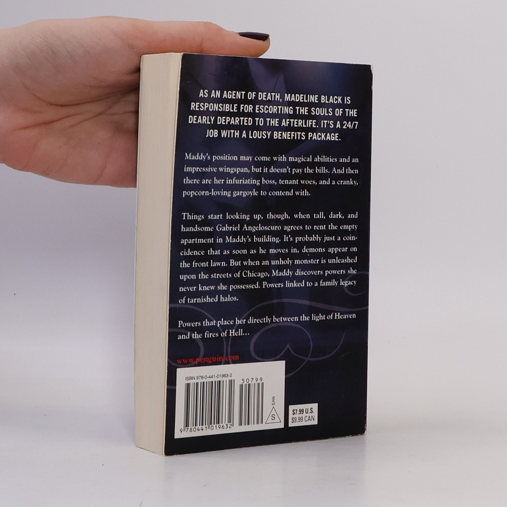 She's an Agent of Death who really needs to get a life.As an Agent of Death, Madeline Black is responsible for escorting the souls of the dearly departed to the afterlife. It's a 24/7 job with a lousy benefits package.Maddy's position may come with magical powers and an impressive wingspan, but it doesn't pay the bills. And then there are her infuriating boss, tenant woes, and a cranky, popcorn-loving gargoyle to contend with.Things start looking up, though, when tall, dark, and handsome Gabriel Angeloscuro agrees to rent the empty apartment in Maddy's building. It's probably just a coincidence that as soon as he moves in demons appear on the front lawn. But when an unholy monster is unleashed upon the streets of Chicago, Maddy discovers powers she never knew she possessed. Powers linked to a family legacy of tarnished halos.Powers that place her directly between the light of Heaven and the fires of Hell...