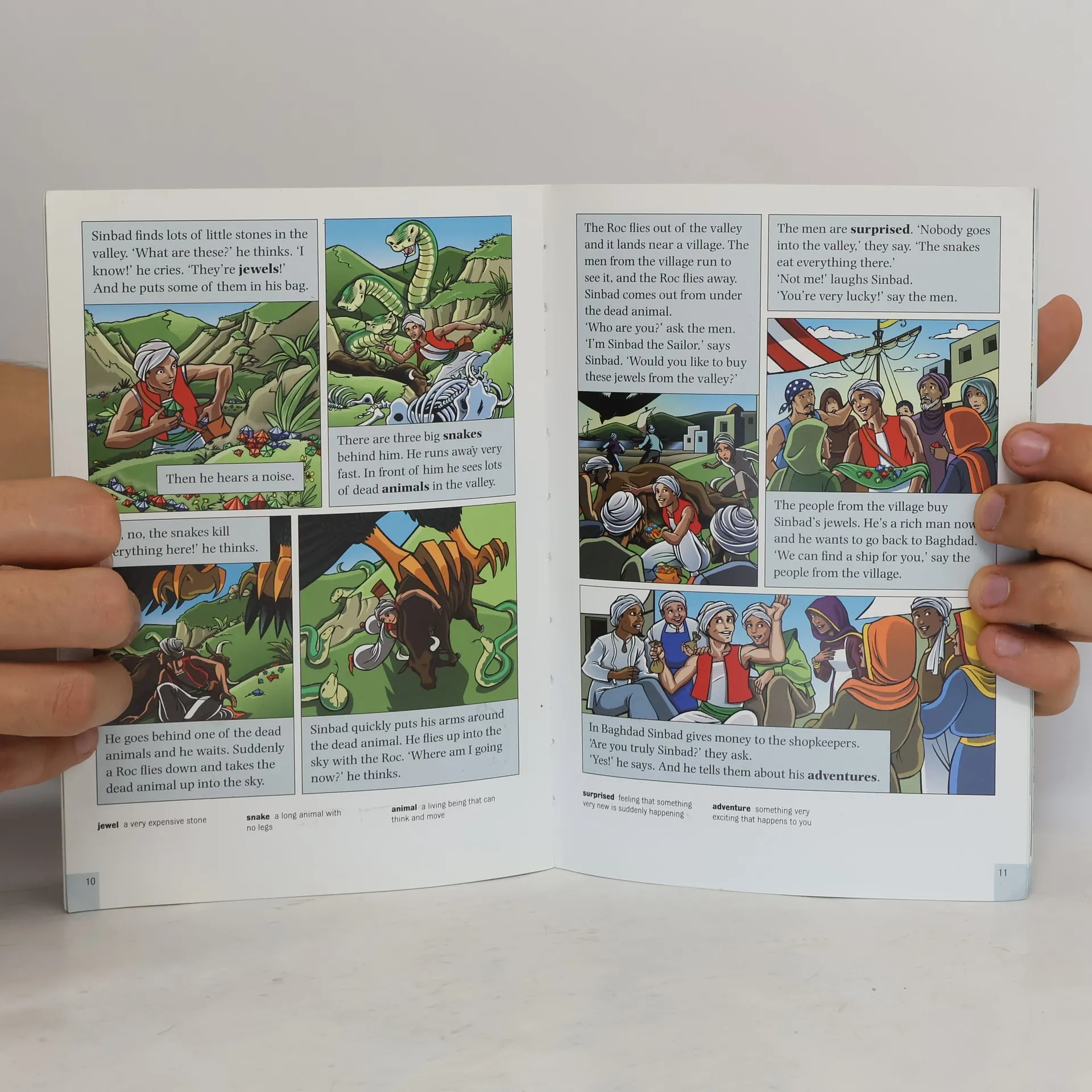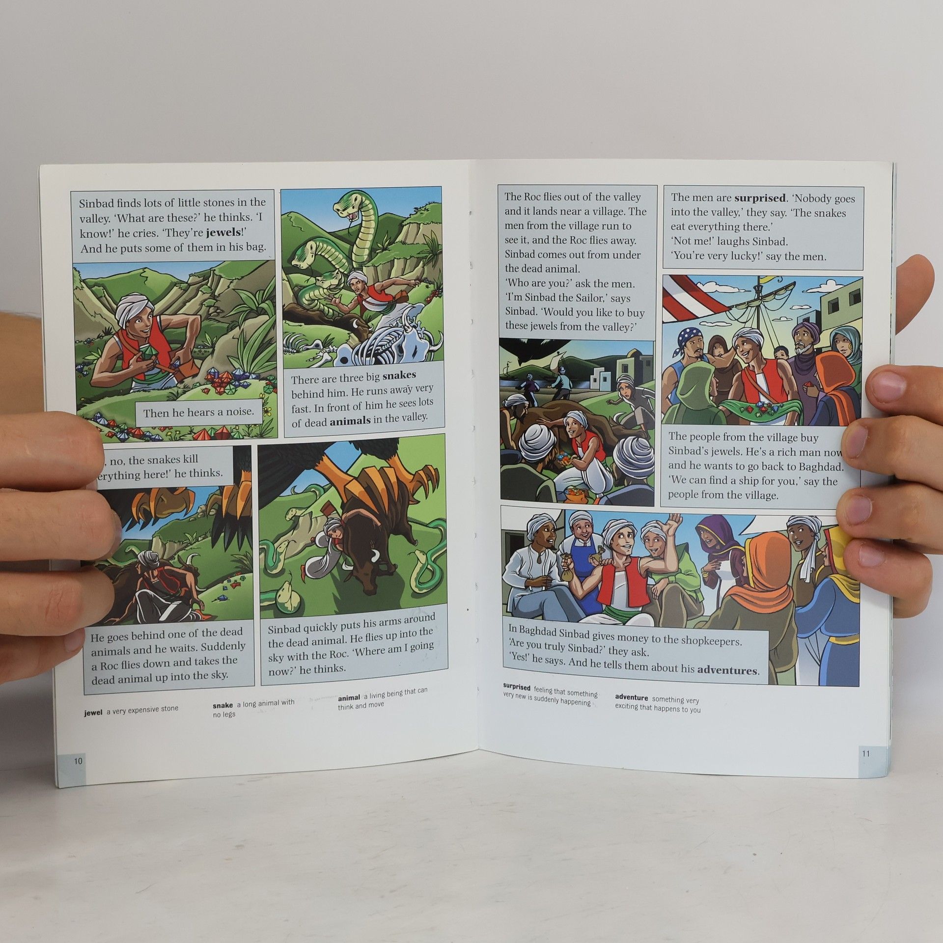 Sinbad the sailor spends many years at sea. He visits strange countries, meets some strange people and some frightening animals. He is sometimes rich, sometimes poor and always in danger. But all the time he is learning from his adventures, until finally he returns home to Baghdad, an older and wiser man.