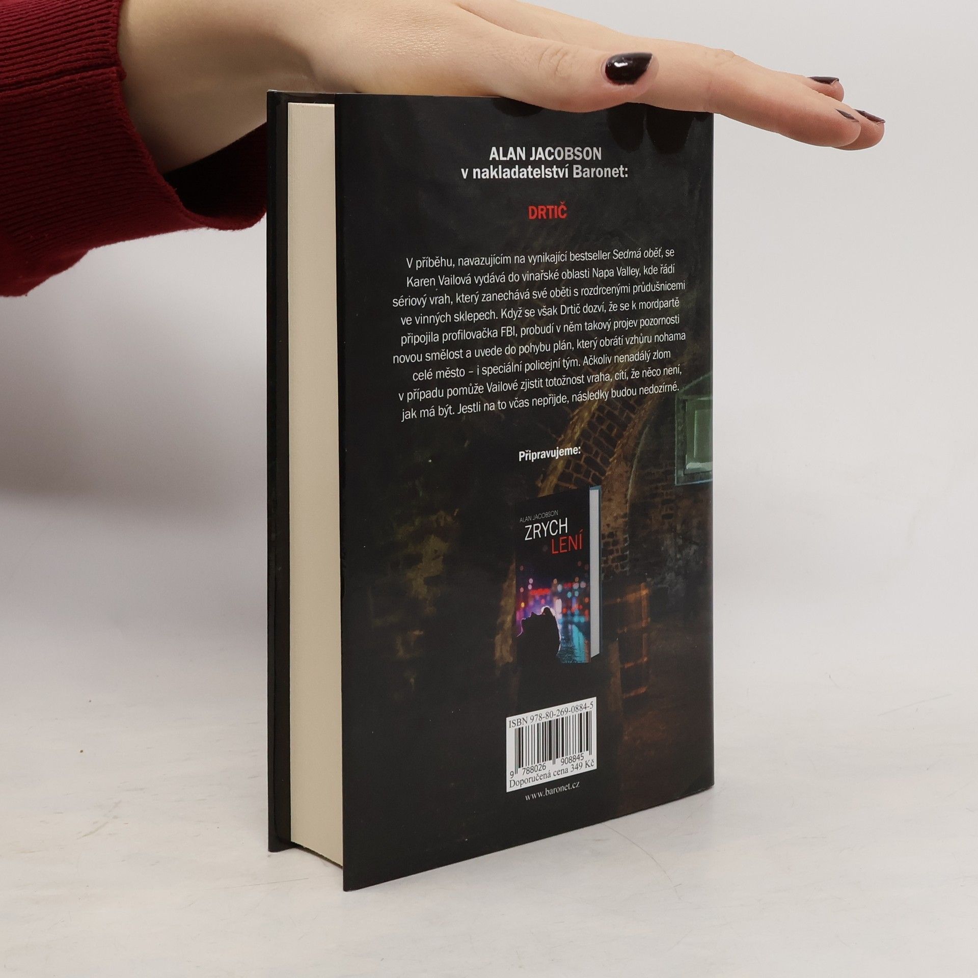 V příběhu, navazujícím na vynikající bestseller Sedmá oběť, se Karen Vailová vydává do vinařské oblasti Napa Valley, kde řádí sériový vrah, který zanechává své oběti s rozdrcenými průdušnicemi ve vinných sklepech. Když se však Drtič dozví, že se k mordpartě připojila profilovačka FBI, probudí v něm takový projev pozornosti novou smělost a uvede do pohybu plán, který obrátí vzhůru nohama celé město – i speciální policejní tým. Ačkoliv nenadálý zlom v případu pomůže Vailové zjistit totožnost vraha, cítí, že něco není, jak má být. Jestli na to včas nepřijde, následky budou nedozírné.