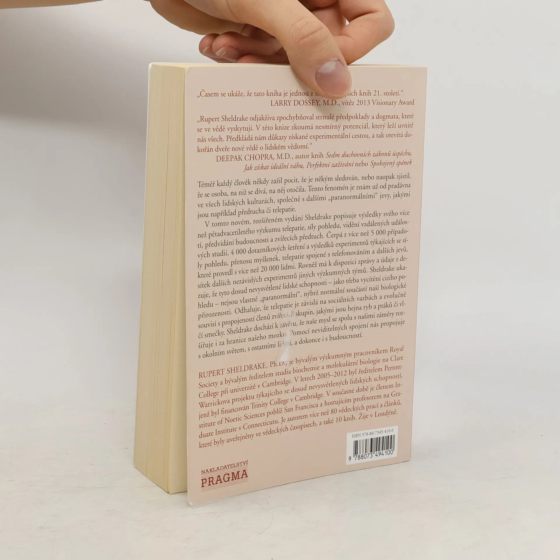 Možná považujete jevy jako telepatie či předvídání budoucnosti za nadpřirozené či neexistující. Tato kniha vám však s pomocí vědeckých metod dokáže, že jsou naopak naší přirozenou součástí. Doktor Rupert Sheldrake ve své knize shrnul více než 25 let trvající výzkum. Do svých experimentů zahrnul i nejnovější technologie a zkoumá telepatii ve spojitosti s mobilními telefony a e-maily. Zajímavé a objevné jsou rovněž jeho výzkumy týkající se telepatických schopností zvířat. Sheldrake zkrátka boří vědecká dogmata, a to rovněž s pomocí vědy!
