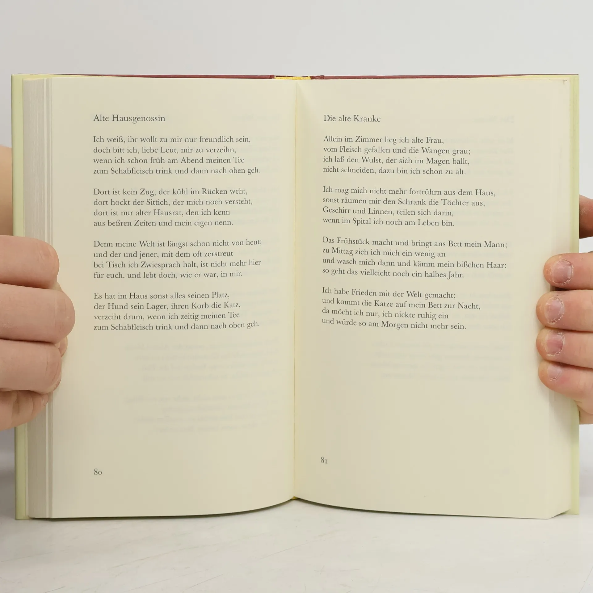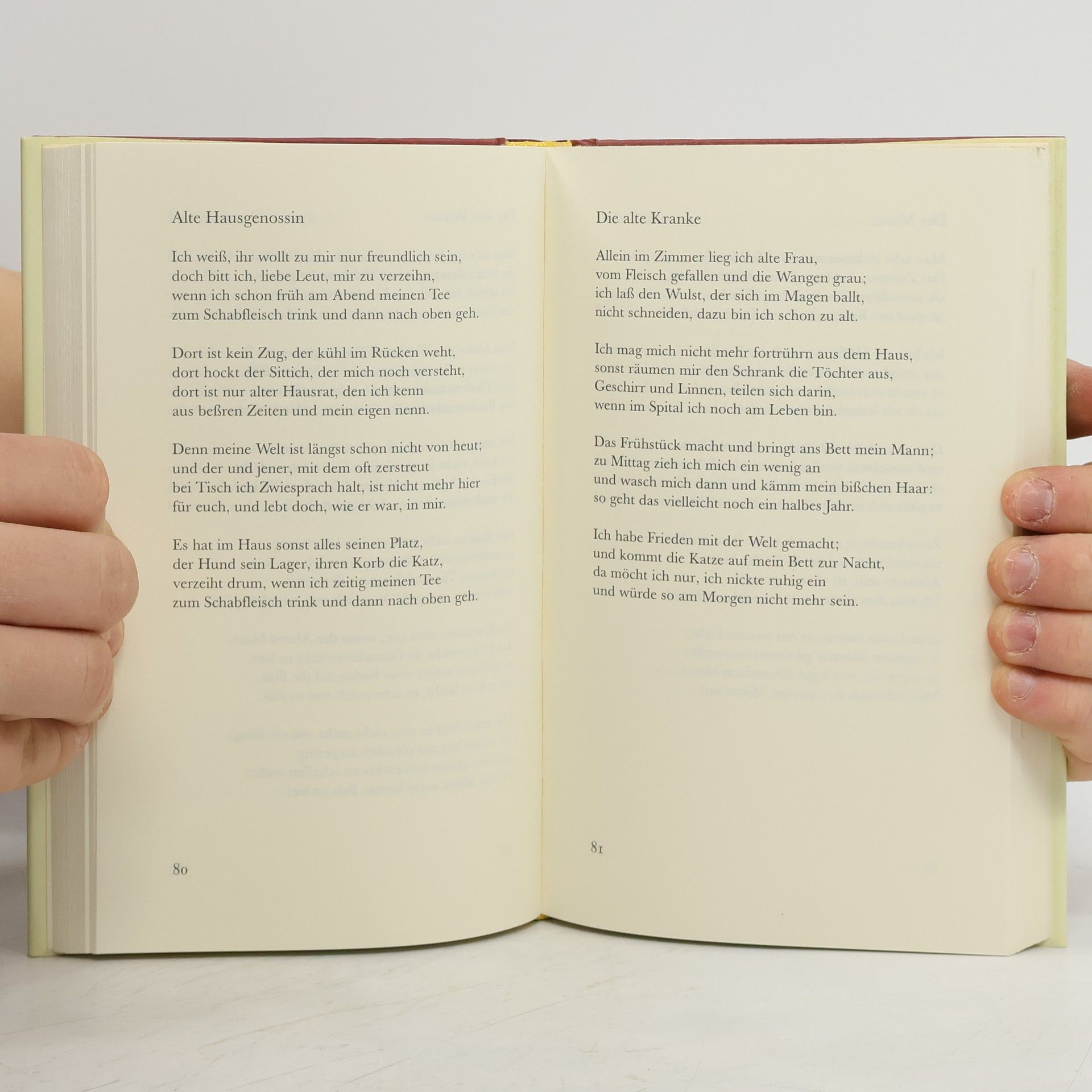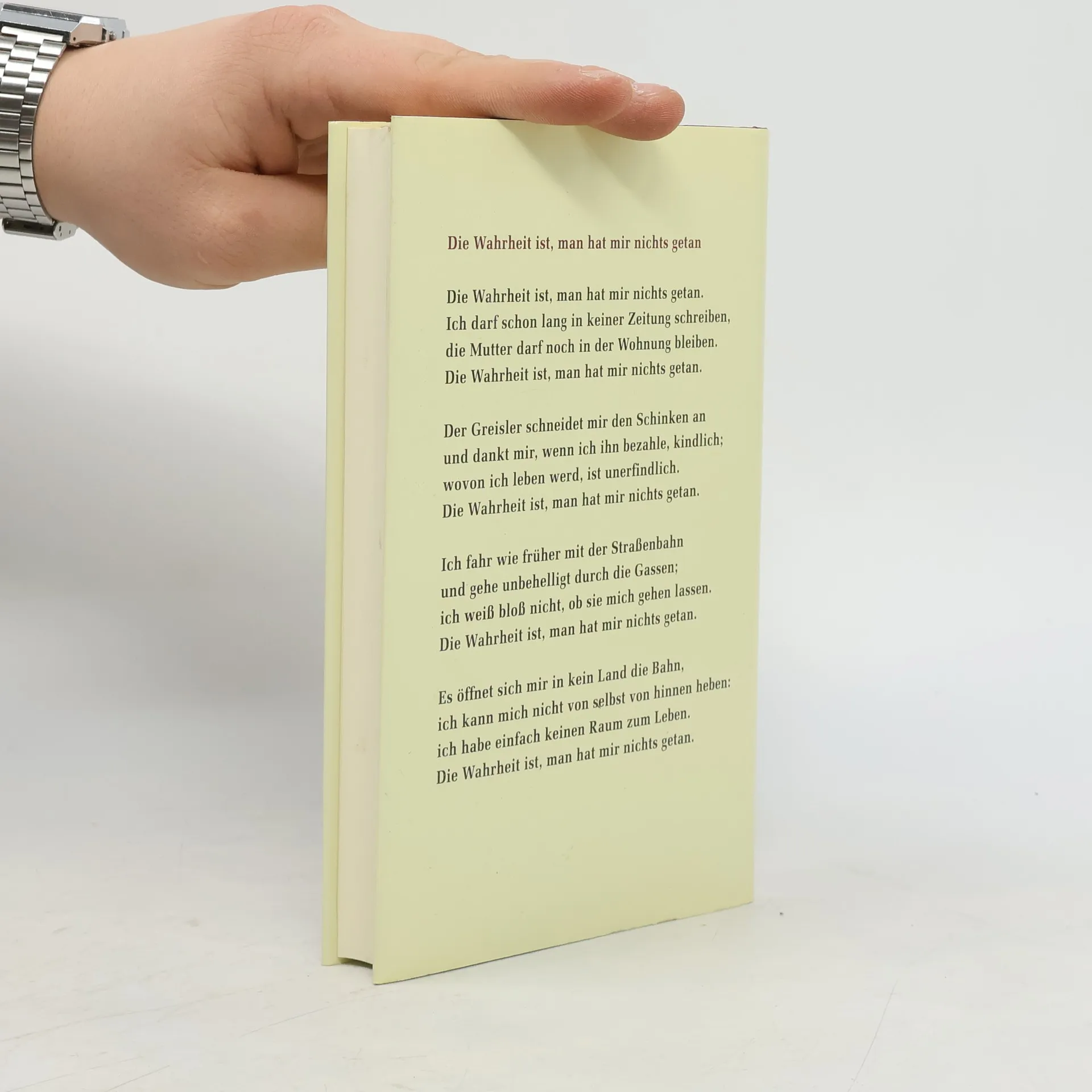 Die Wahrheit ist, man hat mir nichts getan. Ich darf schon lang in keiner Zeitung schreiben, die Mutter darf noch in der Wohnung bleiben. Die Wahrheit ist, man hat mir nichts getan. Die Greisler schneidet mir den Schinken an und dankt mir, wenn ich ihn bezahle, kindlich; wovon ich leben werd, ist unerfindlich. Die Wahrheit ist, man hat mir nicht getan. Ich fahr wie früher mit der Straßenbahn und gehe unbehelligt durch die Gassen; ich weiß bloß nicht, ob sie mich gehen lassen. Die Wahrheit ist, man hat mir nichts getan. Es öffnet sich mir kein Land die Bahn, ich kann mich nicht von selbst von hinnen heben: ich habe einfach keinen Raum zum Leben. Die Wahrheit ist, man hat mir nichts getan