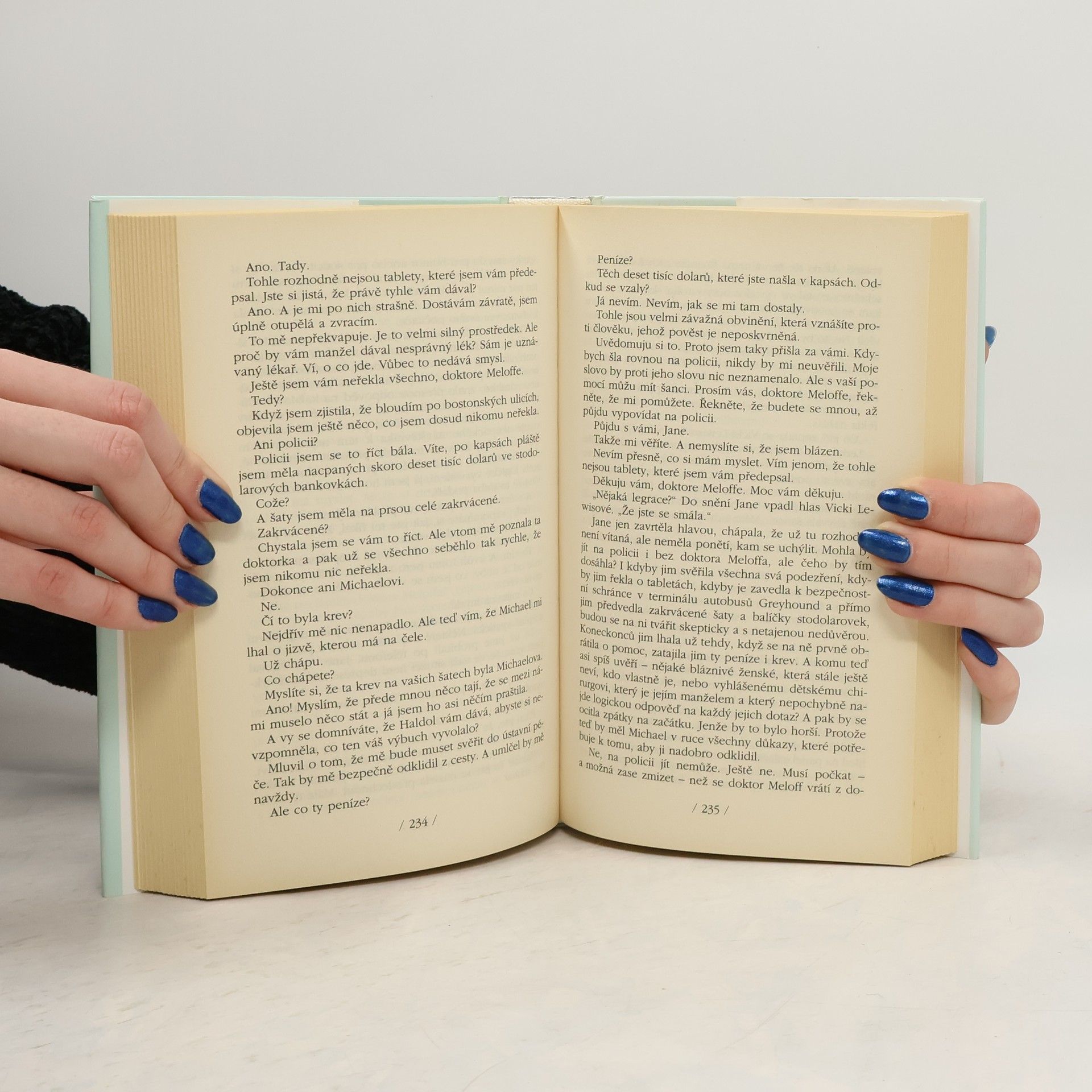Jane Whittakerová se ocitla uprostřed noční můry. Neví, kdo je, nevzpomíná si na vlastní jméno, netuší, kolik jí je let. A už vůbec neví, proč bloudí ulicemi Bostonu v zakrvácených šatech a s deseti tisíci dolary v kapse. Nezbývá jí než důvěřovat hezkému mladému muži, o němž jí říkají, že je to její manžel, a dovolit mu, aby o ni pečoval v elegantním domě, který údajně sama zařizovala. Ale pomáhají jí skutečně léky, které jí dávají? Nebo pouze prohlubují její zmatenost? Jane se pouští do nerovného boje, aby se dopátrala pravdy a získala zpátky svou paměť i svůj život. Krok za krokem rozmotává pavučinu rafinovaného zla a uvolňuje smyčku, která ji rdousí. Nemá se na koho obrátit, neboť i těm nejlepším přátelům se zdá, že Jane pomalu, ale jistě přichází o rozum. Jenom nezlomná vůle ji nutí, aby se nevzdávala, když konečně pochopí, že člověk, jemuž věřila, s ní hraje krutou hru. Ale pokud přece jen získá zpět své vzpomínky a odhalí pravdu, bude ubohé bláznivé Jane ještě někdo věřit...?