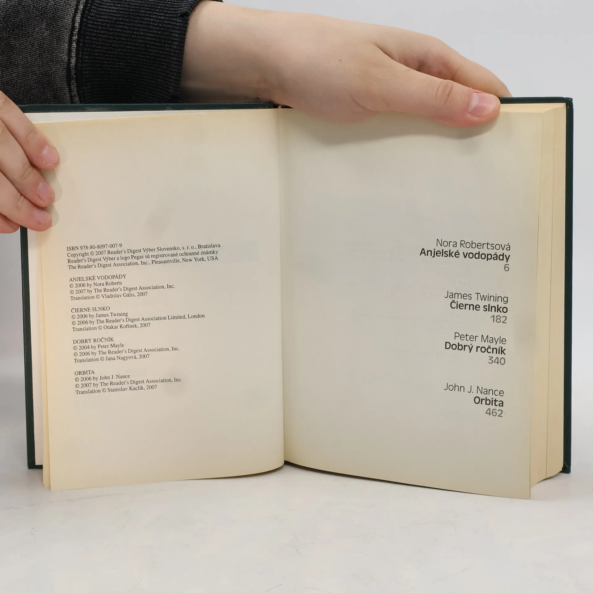 Najlepšie svetové čítanie: Anjelské vodopády; Čierne slnko; Dobrý ročník; Orbita, Nora Roberts, James Twining, Peter Mayle, John J. Nance