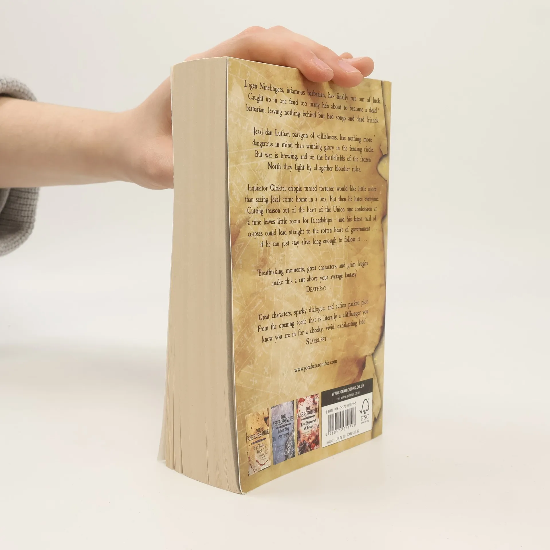 Inquisitor Glokta, a crippled and increasingly bitter relic of the last war, former fencing champion turned torturer extraordinaire, is trapped in a twisted and broken body - not that he allows it to distract him from his daily routine of torturing smugglers. Nobleman, dashing officer and would-be fencing champion Captain Jezal dan Luthar is living a life of ease by cheating his friends at cards. Vain, shallow, selfish and self-obsessed, the biggest blot on his horizon is having to get out of bed in the morning to train with obsessive and boring old men. And Logen Ninefingers, an infamous warrior with a bloody past, is about to wake up in a hole in the snow with plans to settle a blood feud with Bethod, the new King of the Northmen, once and for all - ideally by running away from it. But as he's discovering, old habits die really, really hard indeed . . . . . . especially when Bayaz gets involved. A bald old man with a terrible temper and a pathetic assistant, he could be the First of the Magi, he could be a spectacular fraud, but whatever he is, he's about to make the lives of Glotka, Jezal and Logen a whole lot more difficult . . .