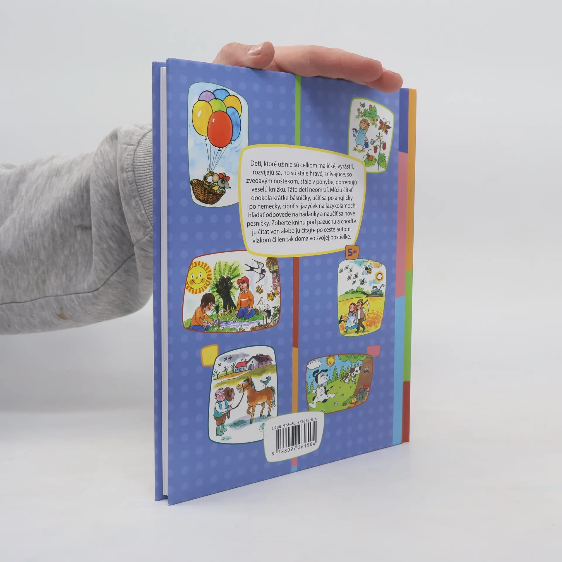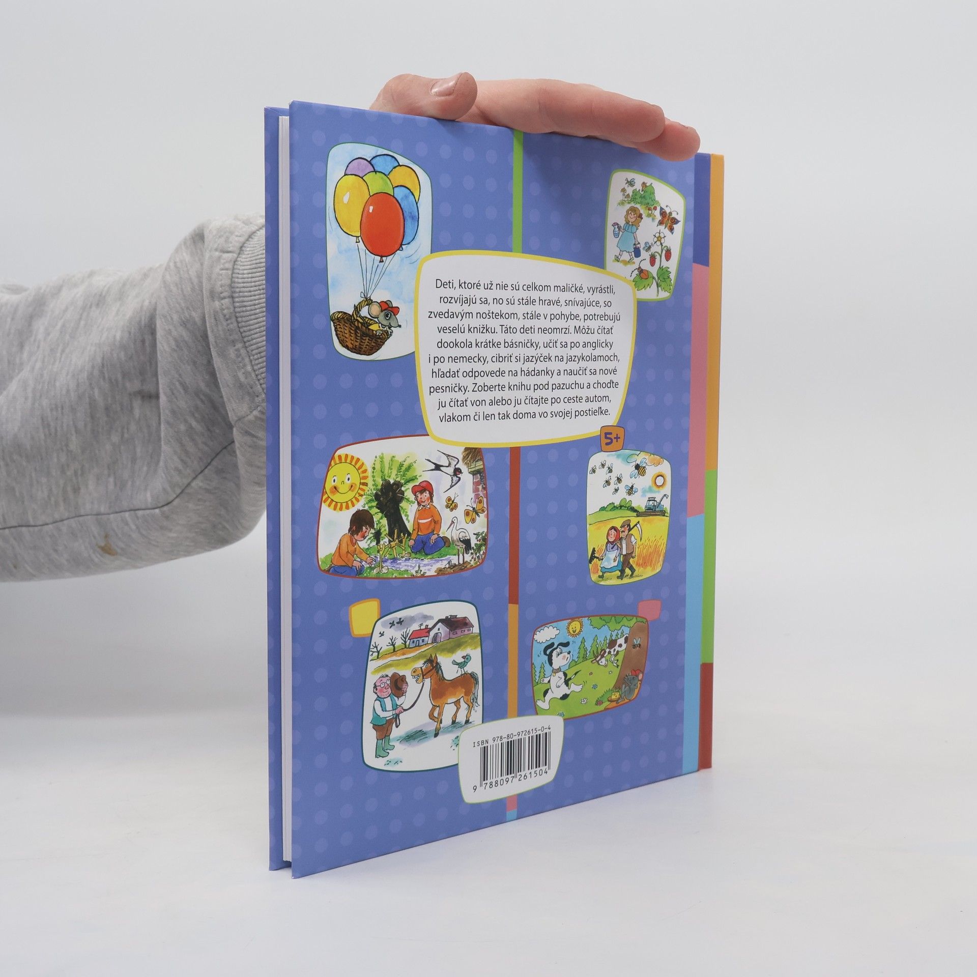 Deti, ktoré už nie sú celkom maličké, vyrástli, rozvíjajú sa, no sú stále hravé, snívajúce, so zvedavým noštekom, stále v pohybe, potrebujú veselú knižku. Táto deti neomrzí. Môžu čítať dookola krátke básničky, učiť po anglicky i po nemecky, cibriť si jazýček na jazykolamoch, hľadať odpovede na hádanky a naučiť sa nové pesničky. Zoberte knihu pod pazuchu a choďte ju čítať von alebo ju čítajte po ceste autom, vlakom či len tak doma vo svojej postieľke.