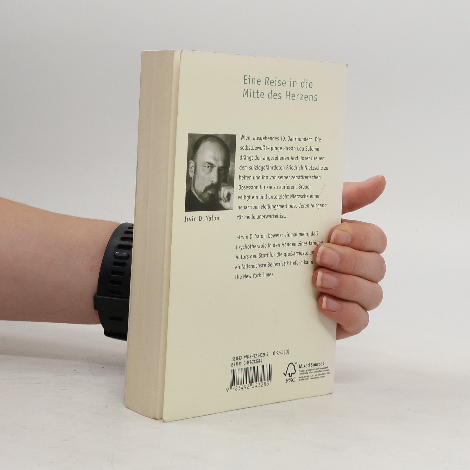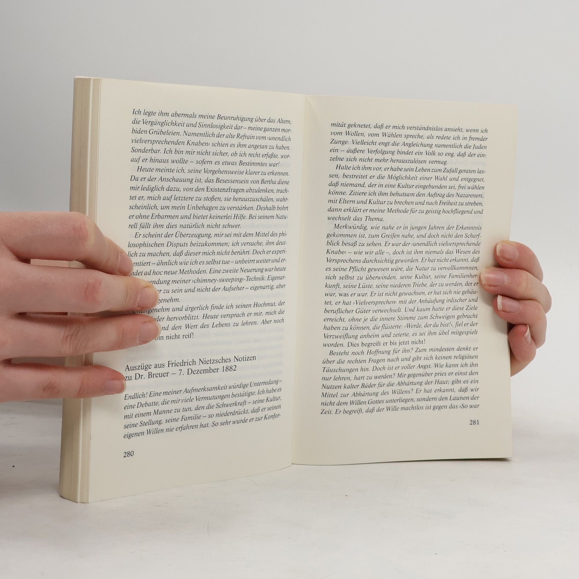 Wien, ausgehendes 19. Jahrhundert: Die selbstbewußte junge Russin Lou Salomé drängt den angesehenen Arzt Josef Breuer, dem suizidgefährdeten Friedrich Nietzsche zu helfen und ihn von seiner zerstörerischen Obsession für sie zu kurieren. Breuer willigt ein und unterzieht Nietzsche einer neuartigen Heilungsmethode, deren Ausgang für beide unerwartet ist. 'Irvin D. Yalom beweist einmal mehr, daß Psychotherapie in den Händen eines fähigen Autors den Stoff für die großartigste und einfallsreichste Belletristik liefern kann.' The New York Times