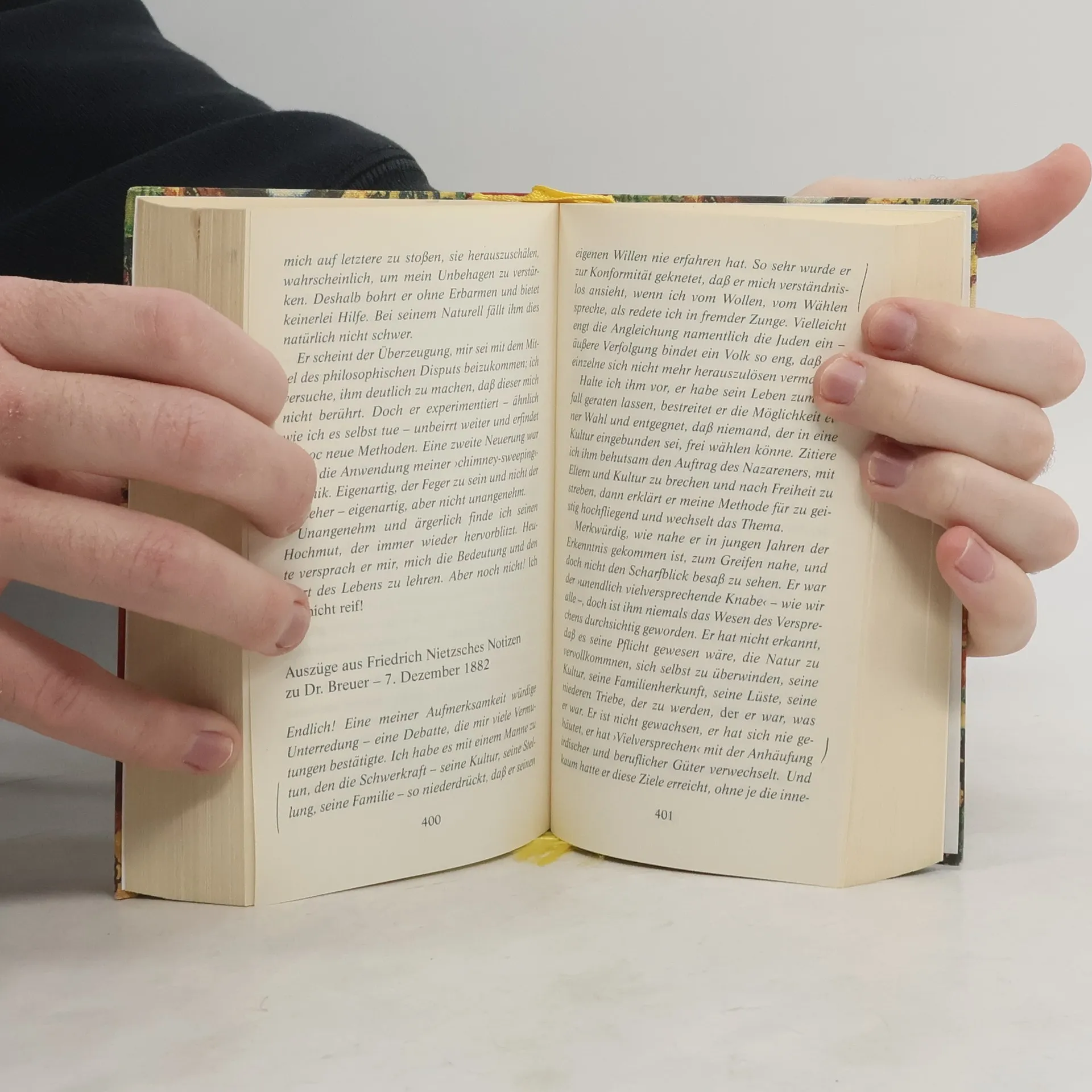 Eine Ménage à trois zwischen Lou Andreas Salomé, Nietzsche und der Psychoanalyse Die Geschenkausgabe mit der abgerundeten Ecke: anspruchsvolle Haptik, hochwertiges Papier, mit Lesebändchen, kleines Format. Das Wien des Fin de siècle: Die selbstbewusste junge Russin Lou Andreas Salomé drängt den angesehenen Arzt Josef Breuer, dem suizidgefährdeten Friedrich Nietzsche zu helfen und ihn von seiner zerstörerischen Obsession für sie zu kurieren. Breuer willigt ein und unterzieht Nietzsche einer neuartigen Heilungsmethode, deren Ausgang jedoch für beide unerwartet ist. Ausstattung: sechs s/w-Fotos