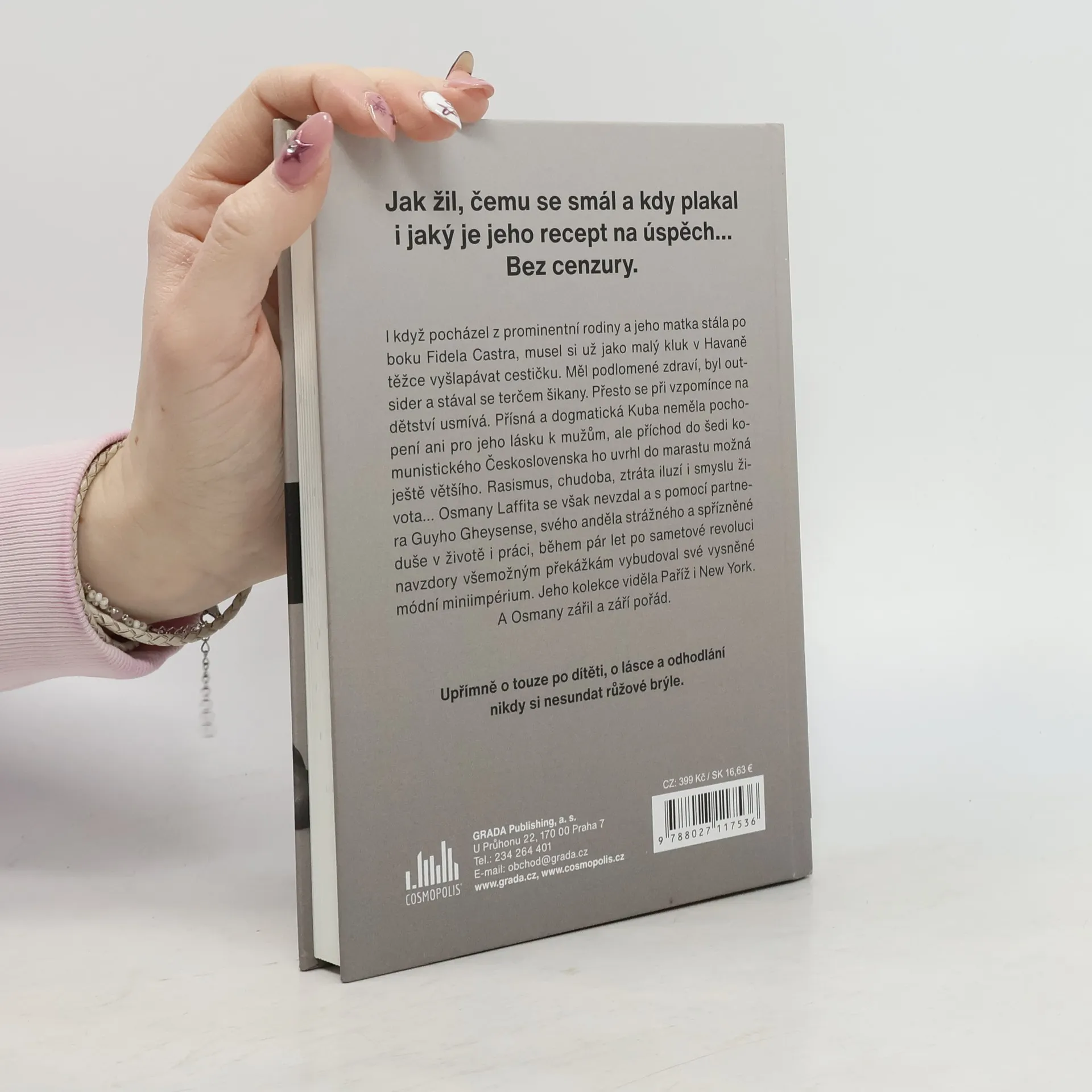 I když pocházel z prominentní rodiny a jeho matka stála po boku Fidela Castra, musel si už jako malý kluk v Havaně těžce vyšlapávat cestičku. Měl podlomené zdraví, byl outsider a stával se terčem šikany. Přesto se při vzpomínce na dětství usmívá. Přísná a dogmatická Kuba neměla pochopení ani pro jeho lásku k mužům, ale příchod do šedi komunistického Československa ho uvrhl do marastu možná ještě většího. Rasismus, chudoba, ztráta iluzí i smyslu života… Osmany Laffita se však nevzdal a s pomocí partnera Guyho Gheysense, svého anděla strážného a spřízněné duše v životě i práci, během pár let po sametové revoluci navzdory všemožným překážkám vybudoval své vysněné módní miniimpérium. Jeho kolekce viděla Paříž i New York. A Osmany zářil a září pořád. Upřímně o touze po dítěti, o lásce a odhodlání nikdy si nesundat růžové brýle.