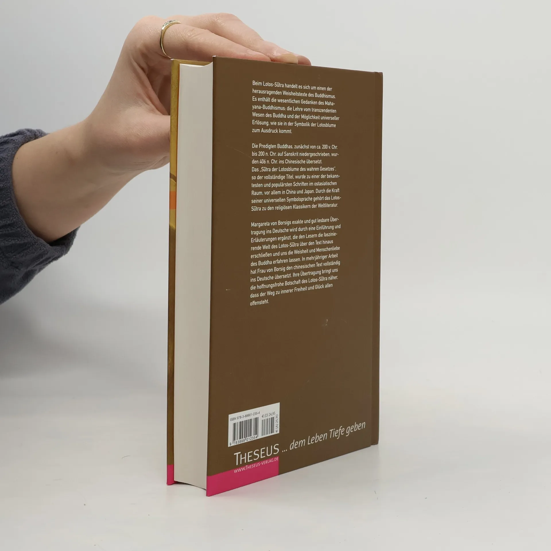 Die Predigten Buddhas im Lotos-Sutra gehoren zu den bekanntesten und popularsten Schriften im ostasiatischen Raum und bringen den Leserinnen und Lesern die buddhistische Idee naher, dass jeder Mensch sein Schicksal und Leben selbstbestimmt fuhren und gestalten kann. Durch Margareta von Borsigs exakte und gut lesbare Ubertragung taucht man in die faszinierende Welt des Lotos-Sutras ein und kann die Weisheit und Menschenliebe Buddhas naher ergrunden. Nun liegt die vollstandige Ubersetzung in hochwertiger und veredelter Ausgabe vor. Wie zeitlos erscheinen uns doch gerade heute uber alle Grenzen der Kulturen und Regionen hinweg die Parabeln vom brennenden Haus und vom verlorenen Sohn. Sie bestarken mich in meiner Uberzeugung, dass es doch einen gemeinsamen ethischen Kern der scheinbar so unvereinbaren grossen Religionen und Moralsysteme gibt. (Richard von Weizsacker)