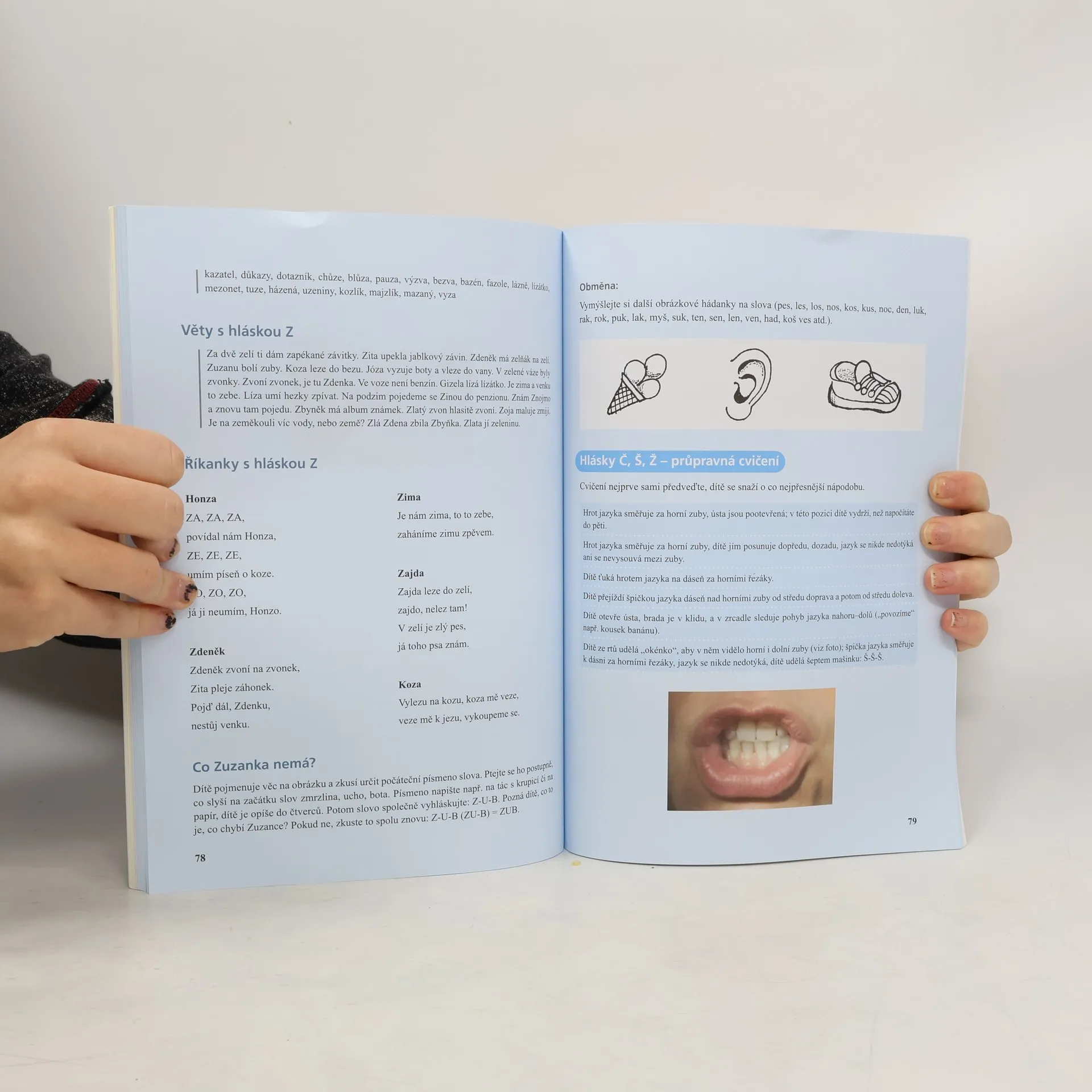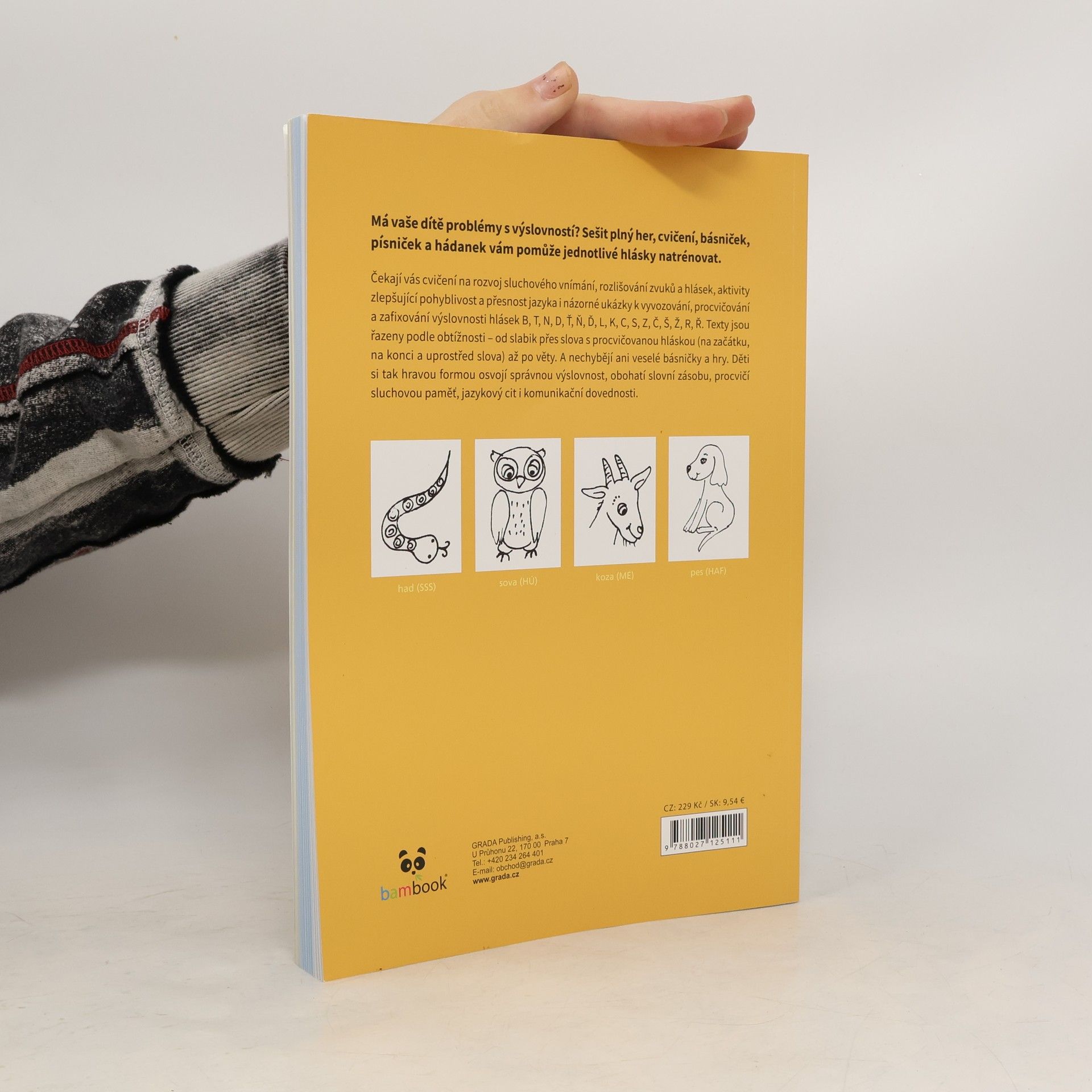 Má vaše dítě problémy s výslovností? Sešit plný her, cvičení, básniček, písniček a hádanek vám pomůže jednotlivé hlásky natrénovat. Čekají vás cvičení na rozvoj sluchového vnímání, rozlišování zvuků a hlásek, aktivity zlepšující pohyblivost a přesnost jazyka i názorné ukázky k vyvozování, procvičování a zafixování výslovnosti hlásek B, T, N, D, Ť, Ň, Ď, L, K, C, S, Z, Č, Š, Ž, R, Ř. Texty jsou řazeny podle obtížnosti – od slabik přes slova s procvičovanou hláskou (na začátku, na konci a uprostřed slova) až po věty. A nechybějí ani veselé básničky a hry. Děti si tak hravou formou osvojí správnou výslovnost, obohatí slovní zásobu, procvičí sluchovou paměť, jazykový cit i komunikační dovednosti.
