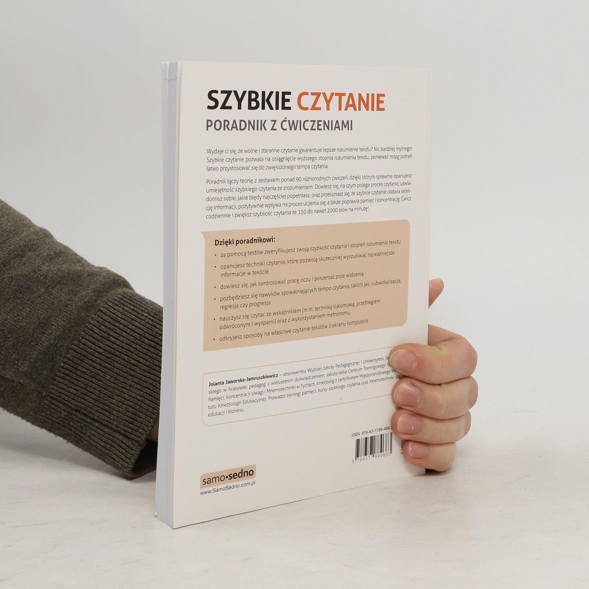 Wydaje ci się, że wolne i staranne czytanie gwarantuje lepsze rozumienie tekstu? Nic bardziej mylnego! Szybkie czytanie pozwala na osiągnięcie wyższego stopnia rozumienia tekstu , ponieważ mózg potrafi łatwo przystosować się do zwiększonego tempa czytania. Poradnik łączy teorię z zestawem ponad 90 różnorodnych ćwiczeń , dzięki którym sprawnie opanujesz umiejętność szybkiego czytania ze zrozumieniem. Dowiesz się, na czym polega proces czytania, uświadomisz sobie, jakie błędy najczęściej popełniasz, oraz przekonasz się, że szybkie czytanie ułatwia selekcję informacji, pozytywnie wpływa na proces uczenia się, a także poprawia pamięć i koncentrację. Ćwicz codziennie i zwiększ szybkość czytania ze 150 do nawet 2000 słów na minutę! Dzięki poradnikowi: - za pomocą testów zweryfikujesz swoją szybkość czytania i stopień rozumienia tekstu - opanujesz techniki czytania , które pozwolą skuteczniej wyszukiwać najważniejsze informacje w tekście - dowiesz się, jak kontrolować pracę oczu i poszerzać pole widzenia - pozbędziesz się nawyków spowalniających tempo czytania , takich jak: subwokalizacja, regresja czy progresja - nauczysz się czytać ze wskaźnikiem (m.in. techniką slalomową, przebiegiem odwróconym i wyspami) oraz z wykorzystaniem metronomu - odkryjesz sposoby na właściwe czytanie tekstów z ekranu komputera Jolanta Jaworska- Jamruszkiewicz - absolwentka Wyższej Szkoły Pedagogicznej i Uniwersytetu Jagiellońskiego w Krakowie, pedagog z wieloletnim doświadczeniem, założycielka Centrum Treningowego Rozwoju Pamięci, Koncentracji Uwagi i Mnemotechniki w Tychach, kinezjolog z certyfikatem Międzynarodowego Instytutu Kinezjologii Edukacyjnej. Prowadzi treningi pamięci, kursy szybkiego czytania oraz mnemotechniki dla edukacji i biznesu.