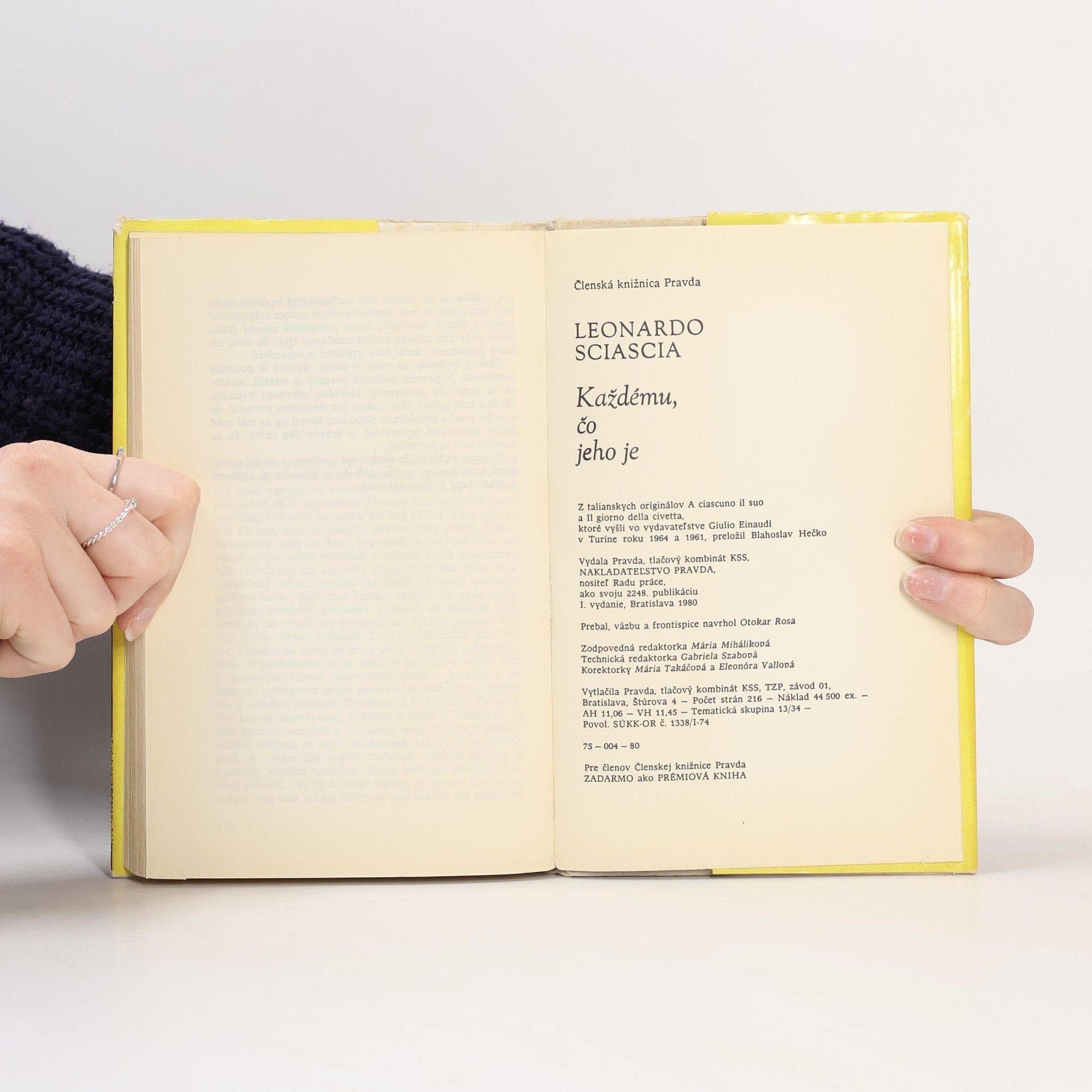 Významný taliansky prozaik, sicílsky rodák Leonardo Sciascia (1921) svojím doterajším dielom vzbudil veľký čitateľský ohlas nielen v Taliansku, ale aj v cudzine. Jeho romány a poviedky, zväčša čerpajúce námety zo Sicílie, sa prekladajú do mnohých jazykov. Ani slovenskému čitateľovi nie jeneznámy: spomeňme detektívny román Todo modo (1974), ktorý vyšiel spolu s výberom svojráznych poviedok pod názvom More vínovej farby. Divácky príťažlivé sú aj filmové verzie Sciasciových románov Deň sovy a Ctihodné mŕtvoly. Detektívne ladené prózy, ktoré vám predkladáme — Každému, čo jeho je (1964) a Deň sovy (1961), patria k tomu najlepšiemu, čo Sciascia napísal. Aj tu — ako v celom diele — rozvíja na malej ploche dramatické príbehy, v ktorých nemilosrdne odhaľuje metódy maskovania tých najväčších zločinov, skorumpovanú políciu a celú právnu džungľu. Hrdinovia príbehov, osamelí obhajcovia spravodlivosti profesor Laurana a odvážny kapitán karabinierov Bellodi majú pátranie po motívoch reťaze vrážd sťažené práve preto, že tajné nitky a spletité zákruty vedú do najvyšších kruhov... Leonardo Sciascia majstrovsky rozohráva detektívnu zápletku, pričom nešetrí komikou a iróniou. Predstavuje nám pestrú paletu svojráznych sicílskych typov, od ustráchaných bedárov po pohlavárov mafie, ktorá už celé desaťročia bašuje na tomto ostrove.