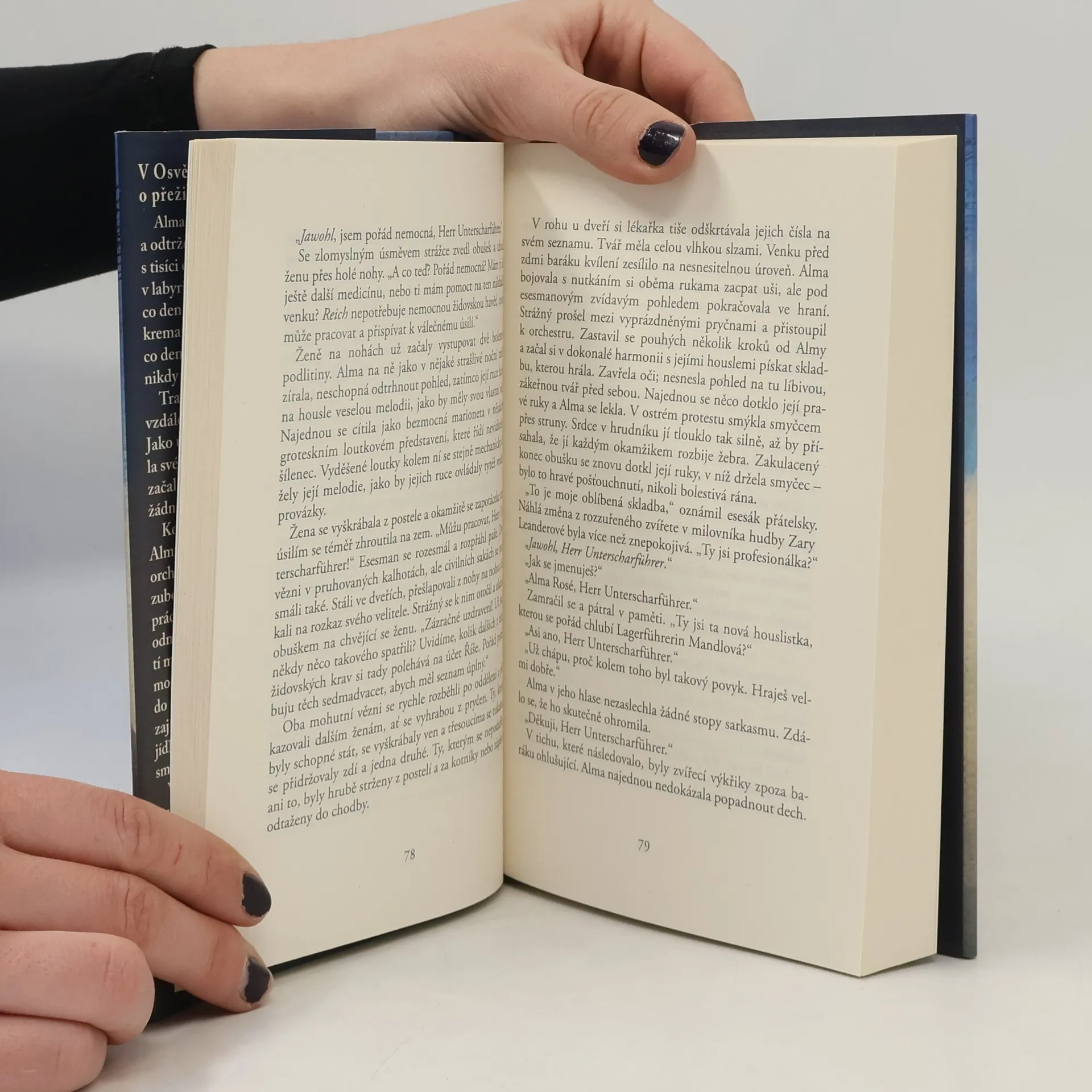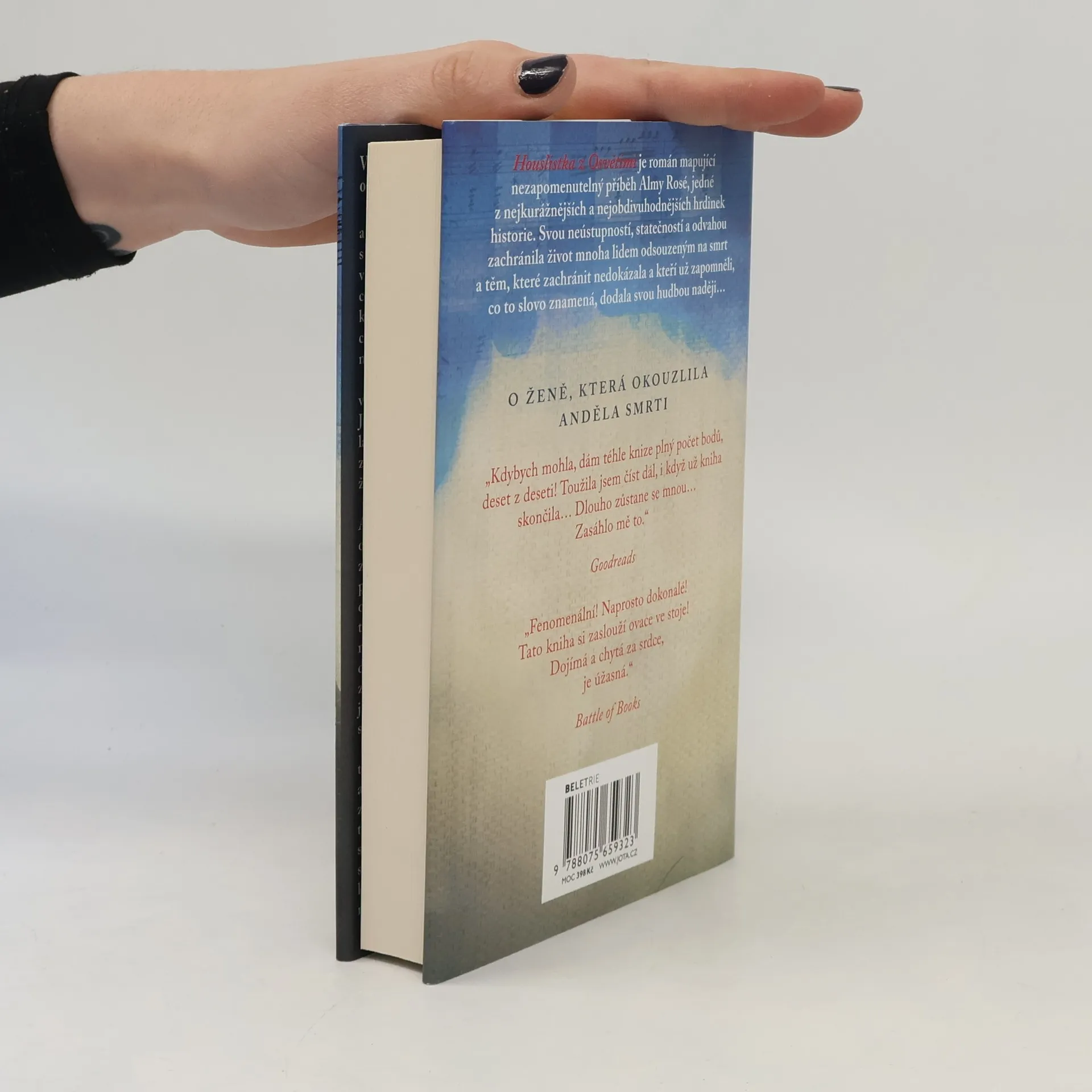 Historický román založený na skutečných událostech a životě slavné rakouské houslistky Almy Rosé. Její statečnost zachránila nespočet životů a dodala naději těm, kteří už zapomněli, co to slovo znamená… "V Osvětimi je každý den bojem o přežití. Alma má na ruce světle modrým inkoustem vytetované číslo 50381 a odtržená od svých milovaných je spolu s tisíci dalšími namačkaná v labyrintu ostnatých drátů. Každý den tu mizí lidé a nikdo je už nikdy nespatří. Tragická realita nemůže být vzdálenější Almině předchozímu životu. Jako uznávaná houslistka uchvacovala své publikum, když se ale v Evropě začali roztahovat nacisté, nemohla ji zachránit žádná sláva světa…Když velitelka ženského tábora Almu jmenuje dirigentkou táborového orchestru, který hraje vězňům plahočícím se do práce i vysokým důstojníkům SS, Alma odmítne: „Mohou mě zabít, ale nepřinutí mě hrát.“ Brzy si však uvědomí, jakou moc s sebou tato pozice nese: může zajistit hladovějícím dívkám příděly jídla navíc a mnoho z nich zachránit před smrtí. Takto Alma potká i Miklóse, talentovaného klavíristu. Obklopeni zoufalstvím nacházejí radost ve společných zkouškách, tajných vzkazech a koncertech, které hrají bok po boku, zatímco se modlí, aby utrpení jednoho dne skončilo. Ale v Osvětimi je i vzduch, který dýchají, prosycený ztrátou a jedinou jistotou je tragédie… Může jejich láska na tak zoufalém místě přežít? "