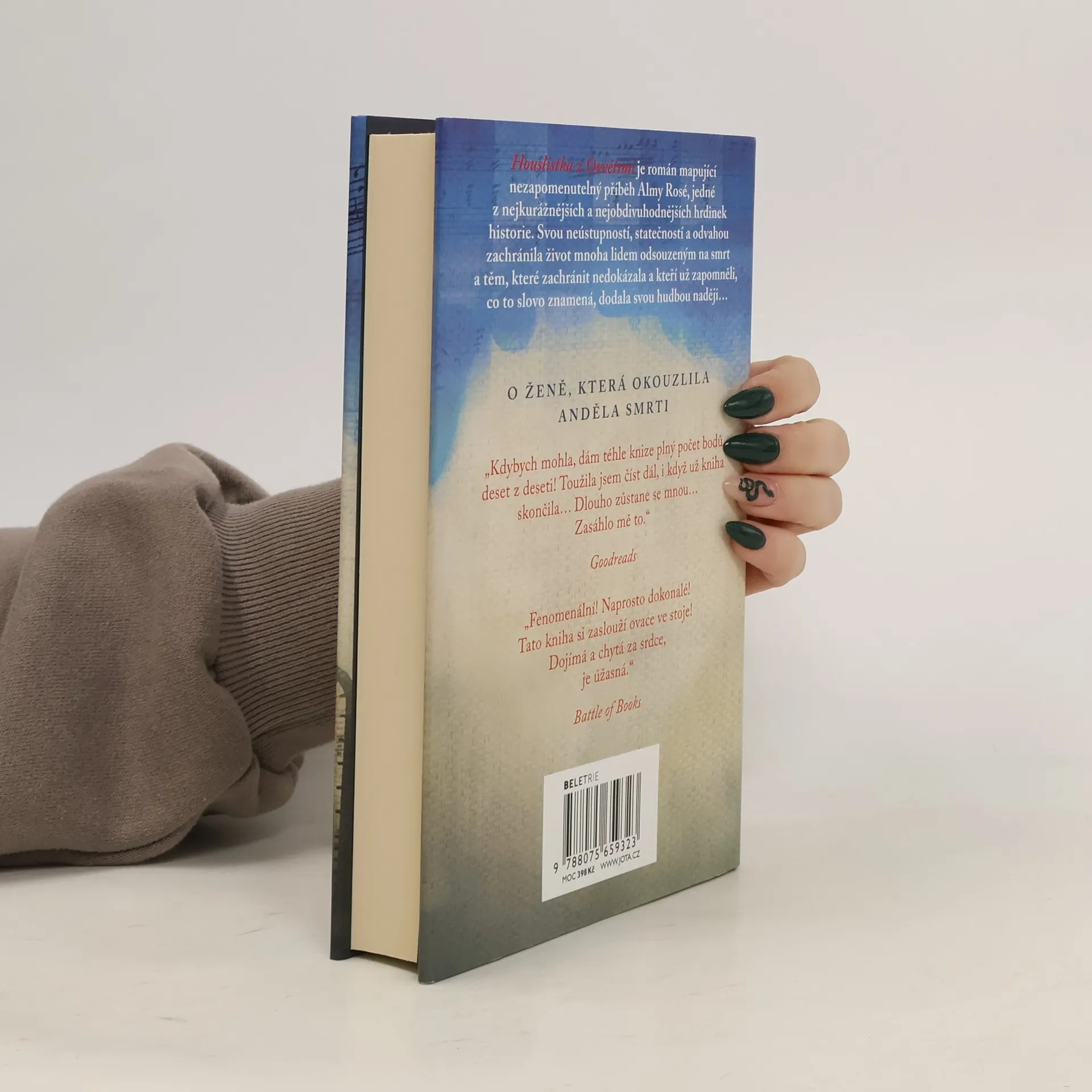 Historický román založený na skutečných událostech a životě slavné rakouské houslistky Almy Rosé. Její statečnost zachránila nespočet životů a dodala naději těm, kteří už zapomněli, co to slovo znamená… "V Osvětimi je každý den bojem o přežití. Alma má na ruce světle modrým inkoustem vytetované číslo 50381 a odtržená od svých milovaných je spolu s tisíci dalšími namačkaná v labyrintu ostnatých drátů. Každý den tu mizí lidé a nikdo je už nikdy nespatří. Tragická realita nemůže být vzdálenější Almině předchozímu životu. Jako uznávaná houslistka uchvacovala své publikum, když se ale v Evropě začali roztahovat nacisté, nemohla ji zachránit žádná sláva světa…Když velitelka ženského tábora Almu jmenuje dirigentkou táborového orchestru, který hraje vězňům plahočícím se do práce i vysokým důstojníkům SS, Alma odmítne: „Mohou mě zabít, ale nepřinutí mě hrát.“ Brzy si však uvědomí, jakou moc s sebou tato pozice nese: může zajistit hladovějícím dívkám příděly jídla navíc a mnoho z nich zachránit před smrtí. Takto Alma potká i Miklóse, talentovaného klavíristu. Obklopeni zoufalstvím nacházejí radost ve společných zkouškách, tajných vzkazech a koncertech, které hrají bok po boku, zatímco se modlí, aby utrpení jednoho dne skončilo. Ale v Osvětimi je i vzduch, který dýchají, prosycený ztrátou a jedinou jistotou je tragédie… Může jejich láska na tak zoufalém místě přežít? "