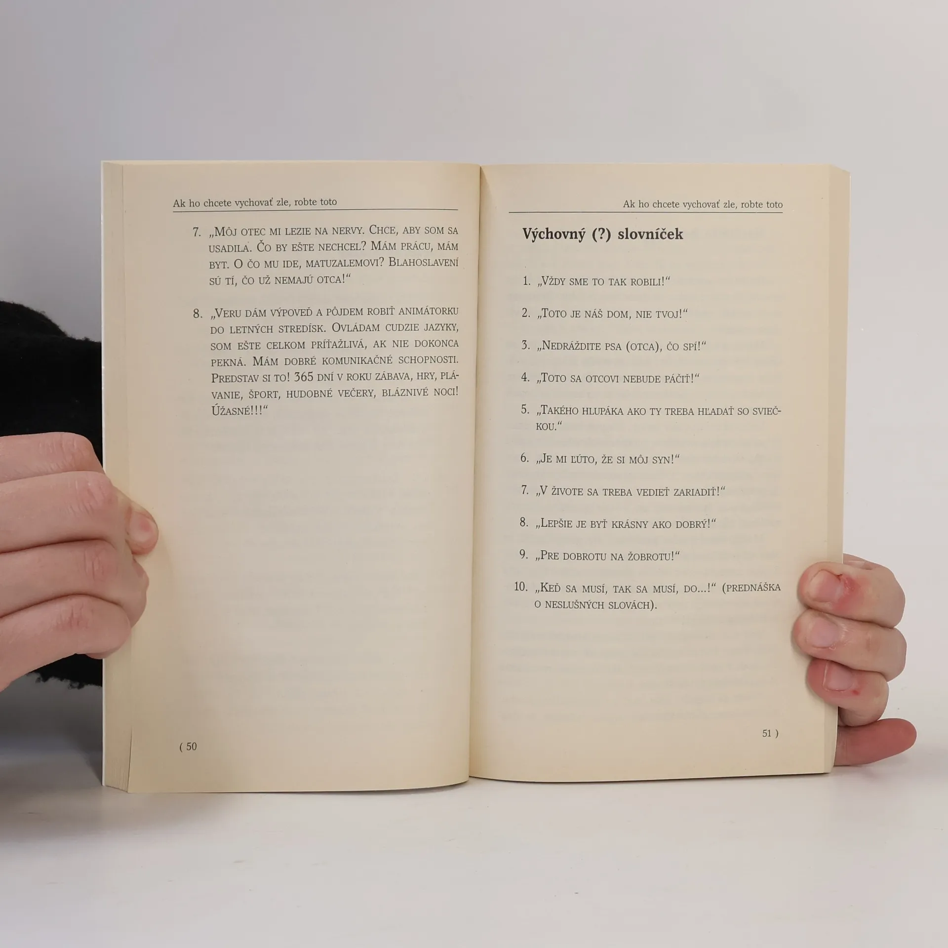 V tejto knihe sa autor skutočne originálnym, ľahkým a nenúteným štýlom obracia na rodičov a na vzdory súčasnému primátu kariéry a konzumizmu vracia výchove jej nenahraditeľné miesto. V prvej časti čitateľa zaujmú naruby obrátené zásady, ako si zle vychovať dieťa, ktorými autor veľmi trefne a pravdivo odhaľuje výchovné chyby. Druhá časť sa zasa zaoberá konkrétnymi radami pre dobrú výchovu.