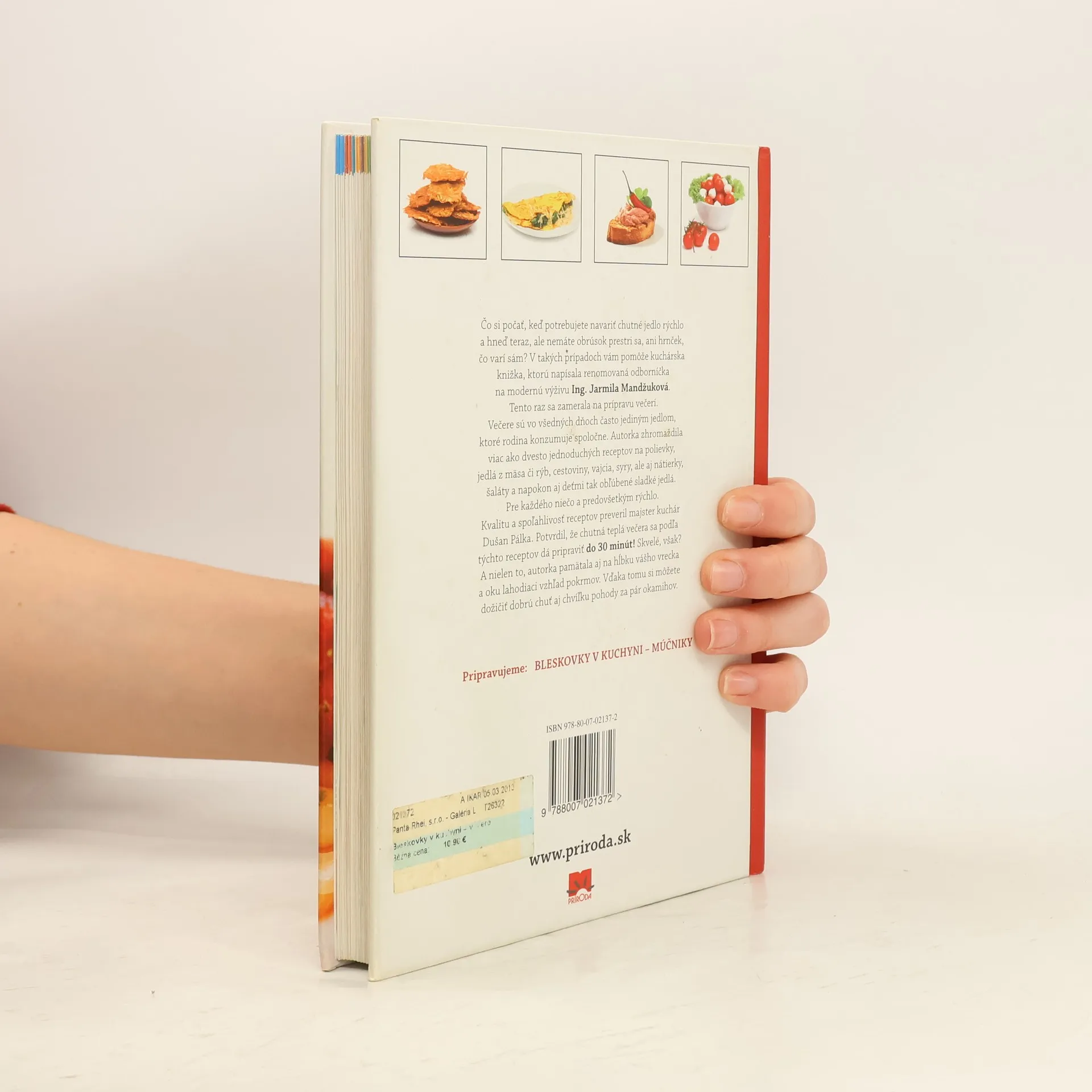 Čo si počať, keď potrebujete navariť chutné jedlo rýchlo a hneď teraz, ale nemáte obrúsok prestri sa, ani hrnček, čo varí sám? V takých prípadoch vám pomôže kuchárska knižka, ktorú napísala renomovaná odborníčka na modernú výživu Ing. Jarmila Mandžuková. Zamerala sa na prípravu večerí, ktoré sú vo všedných dňoch často jediným jedlom, ktoré rodina konzumuje spoločne. Zhromaždila viac ako dvesto jednoduchých receptov na polievky, jedlá z mäsa či rýb, cestoviny, vajcia, syry, ale aj nátierky, šaláty a napokon aj deťmi tak obľúbené sladké jedlá. Pre každého niečo a predovšetkým rýchlo. Kvalitu a spoľahlivosť receptov preveril majster kuchár Dušan Pálka. Potvrdil, že chutná teplá večera sa podľa týchto receptov dá pripraviť najviac do 30 minút! Skvelé, však? A nielen to, autorka pamätala aj na hĺbku nášho vrecka a oku lahodiaci vzhľad pokrmov. Vďaka tomu si môžeme dožičiť dobrú chuť aj chvíľku pohody za pár okamihov.