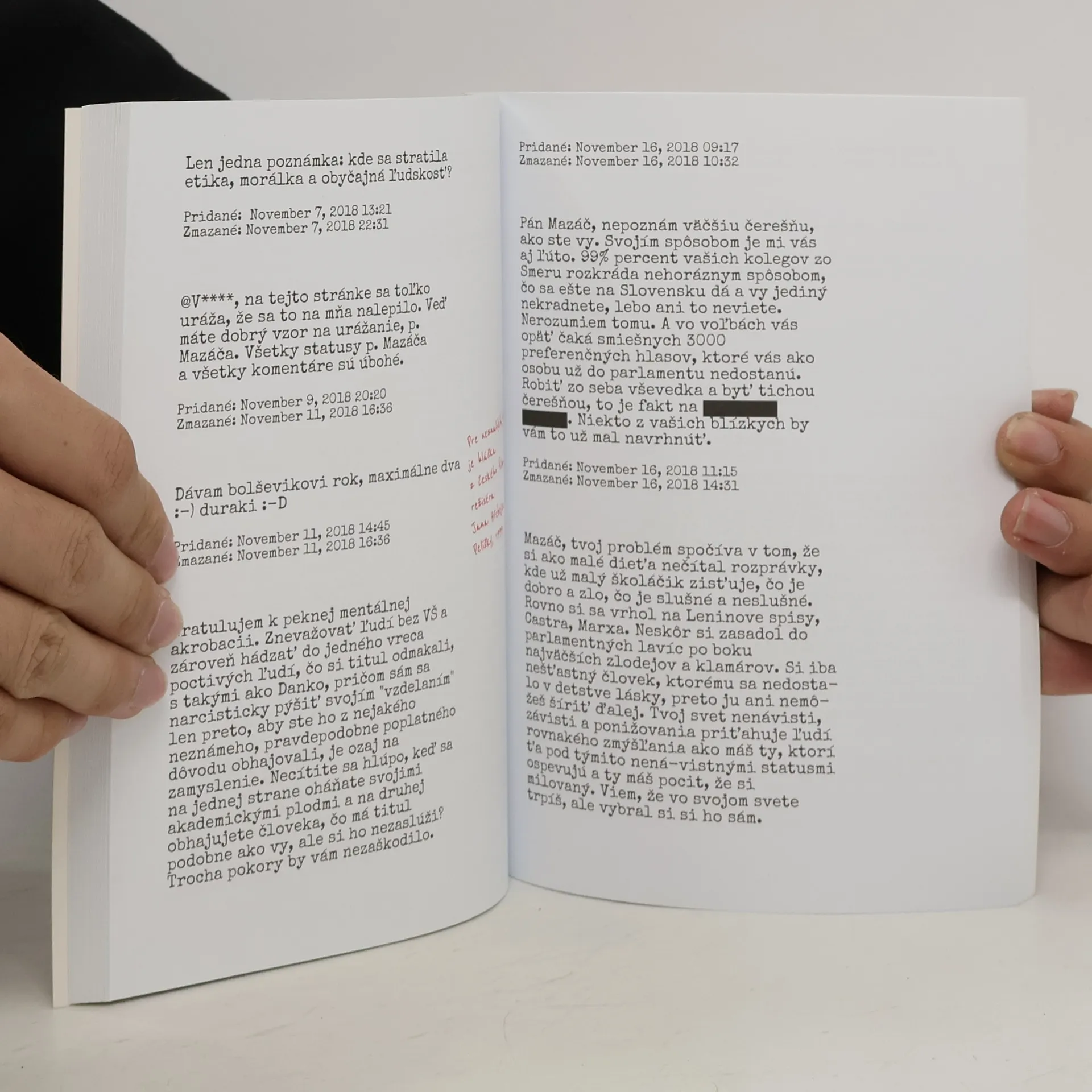 SMERák, komunista, človek ktorý nikdy nič užitočné nerobil. Súdruh Mazáč na svojom Facebooku vyniká vo vymazávaní nepohodlných názorov. Hm, čo vyniká, on dominuje v mazaní komentárov na Slovenských Fejsbúkoch. Komunista sa bráni. Vraj maže len vulgárne komentáre. Vraj maže len trollov a decká čo sa nevedia spratať do svojej kože. My Vám prinášame dôkaz o tom, že klame. Lož je totiž jeho hlavným pracovným nástrojom.Do rúk sa Vám dostáva knižka, do ktorej sme vybrali tie najlepšie z komentárov, ktoré súdruh Mazáč a jeho Tím normalizátorov vymazal na svojom Facebooku. Komentáre sme chronologicky zaradili podľa mesiacov a tém ktoré práve rezonovali v spoločnosti. Pozrite sa na čo všetko Vám súdruh nevie alebo nechce odpovedať. Všetky peniaze ktoré vyzbierame predajom tejto knižky rozdelíme medzi obete komunistického režimu na Slovensku. V ich mene Vám týmto ďakujeme.