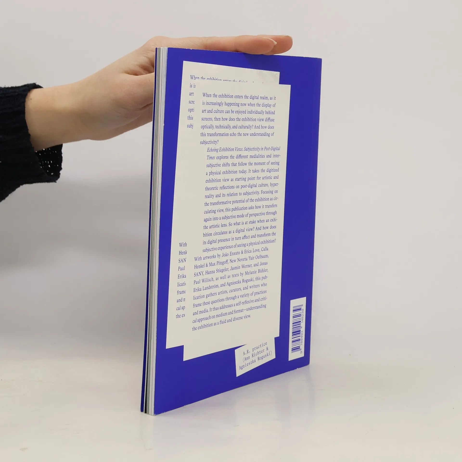 As exhibitions increasingly transition into the digital realm, the optical, technical, and cultural dimensions of viewing art and culture are transformed. This exploration delves into how this shift reflects a new understanding of subjectivity. The publication investigates the various medialities and intersubjective changes that arise from experiencing a physical exhibition in today’s context. By examining the digitized exhibition view, it offers artistic and theoretical reflections on post-digital culture and hyperreality, particularly concerning subjectivity. It questions the implications of exhibitions circulating as digital views and how this digital presence influences and alters the subjective experience of viewing physical exhibitions. Featuring works by artists such as João Enxuto & Erica Love, Calla Henkel & Max Pitegoff, and others, alongside texts by Melanie Bühler, Erika Landström, and Agnieszka Roguski, the publication brings together a diverse array of voices. It encourages a self-reflexive and critical approach to medium and format, framing the exhibition as a fluid and multifaceted experience. Through this lens, it addresses the transformative potential of exhibitions and their capacity to reshape perspectives in a post-digital landscape.
