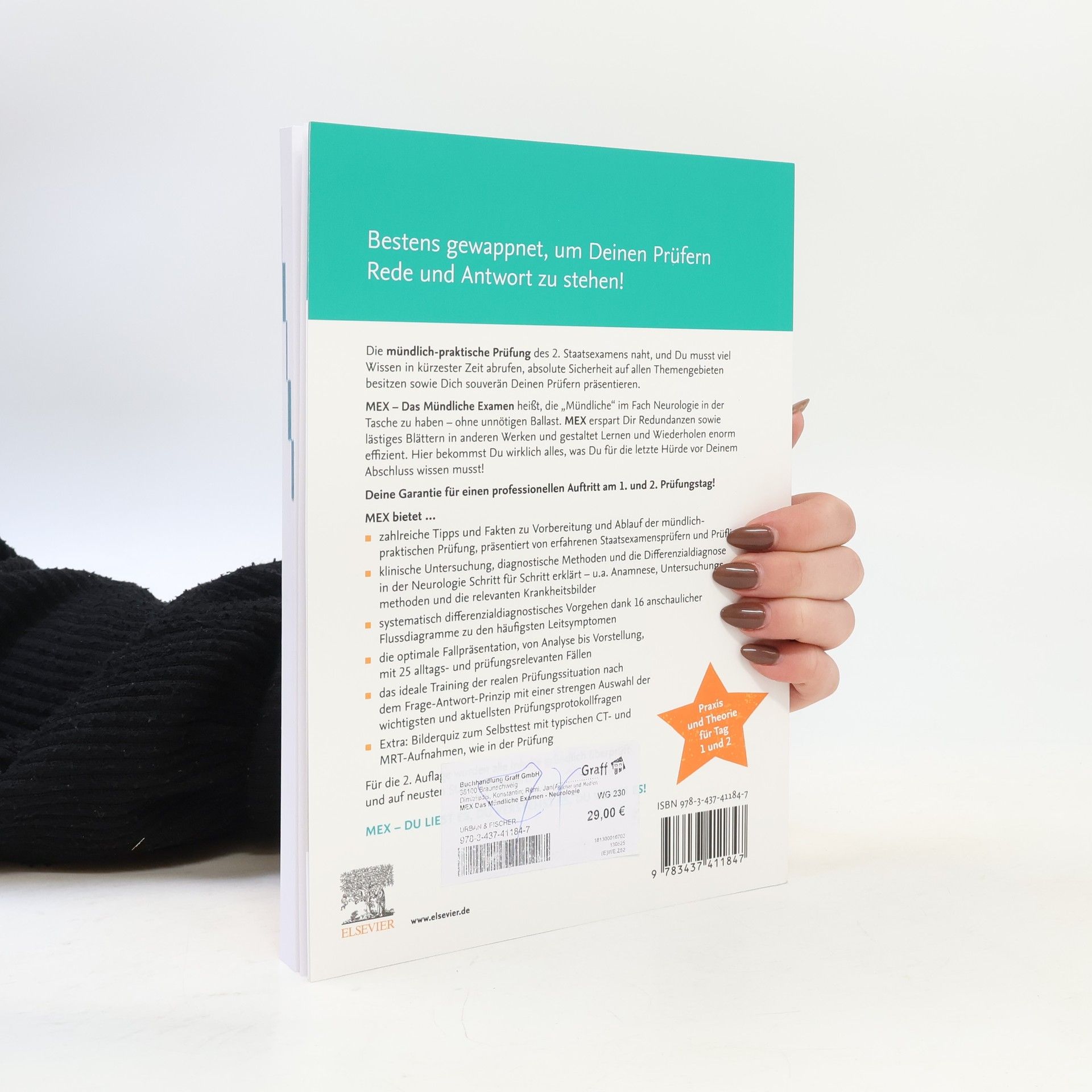 LADENPREIS GESENKT zum 20. August 2020! Jetzt nur noch 28 statt 35 ! Mit MEX hast du die letzte Hrde schon Du liest es, du verstehst es, du weit es!" Die mndliche Prfung meistern mit den MEX-Titeln! Mit den Bchern dieser Reihe ist jeder Medizinstudent bestens gewappnet, um den Prfern in der mndlich-praktischen Prfung des 2. Staatsexamens Rede und Antwort zu stehen. Es reicht nicht lnger nur Fragen und Antworten zu pauken. Praktisches Knnen ist gefragt! Dieses Kompendium bringt's auf den Punkt und fhrt alles Ntige fr die neue mndlich-praktische Prfung des 2. Staatsexamens fr den Themenbereich Neurologie zusammen. So lsst sich die reale Prfungssituation uerst effizient mit nur einem einzigen Buch Ein einleitendes Kapitel verrt die wichtigsten Fakten und Tipps zur Mndlichen Prfung! Fr den ersten Prfungstag in der Praxis am Patientenbett erhalten Sie in Kapitel 2 detailliertes Wissen zu Diagnosegngen, Anamnese, Untersuchungsmethoden, Labor und Bildgebung. Doppelseiten mit farbig kodierten Flussdiagrammen in Kapitel 3 erleichtern die Differenzialdiagnose der hufigsten Leitsymptome. Zustzlich gibts fr den 2. Prfungstag in Kapitel 4 und 5 eine Auswahl der wichtigsten und hufigsten Prfungsprotokollfragen aufgebaut nach dem Frage-Antwort-Prinzip und die wichtigsten Flle der aller Fachrichtungen. Garantiert professionell auftreten dank zahlreicher Tipps und Fakten zu Vorbereitung und Ablauf der Mndlichen Die perfekte Anleitung fr den 1