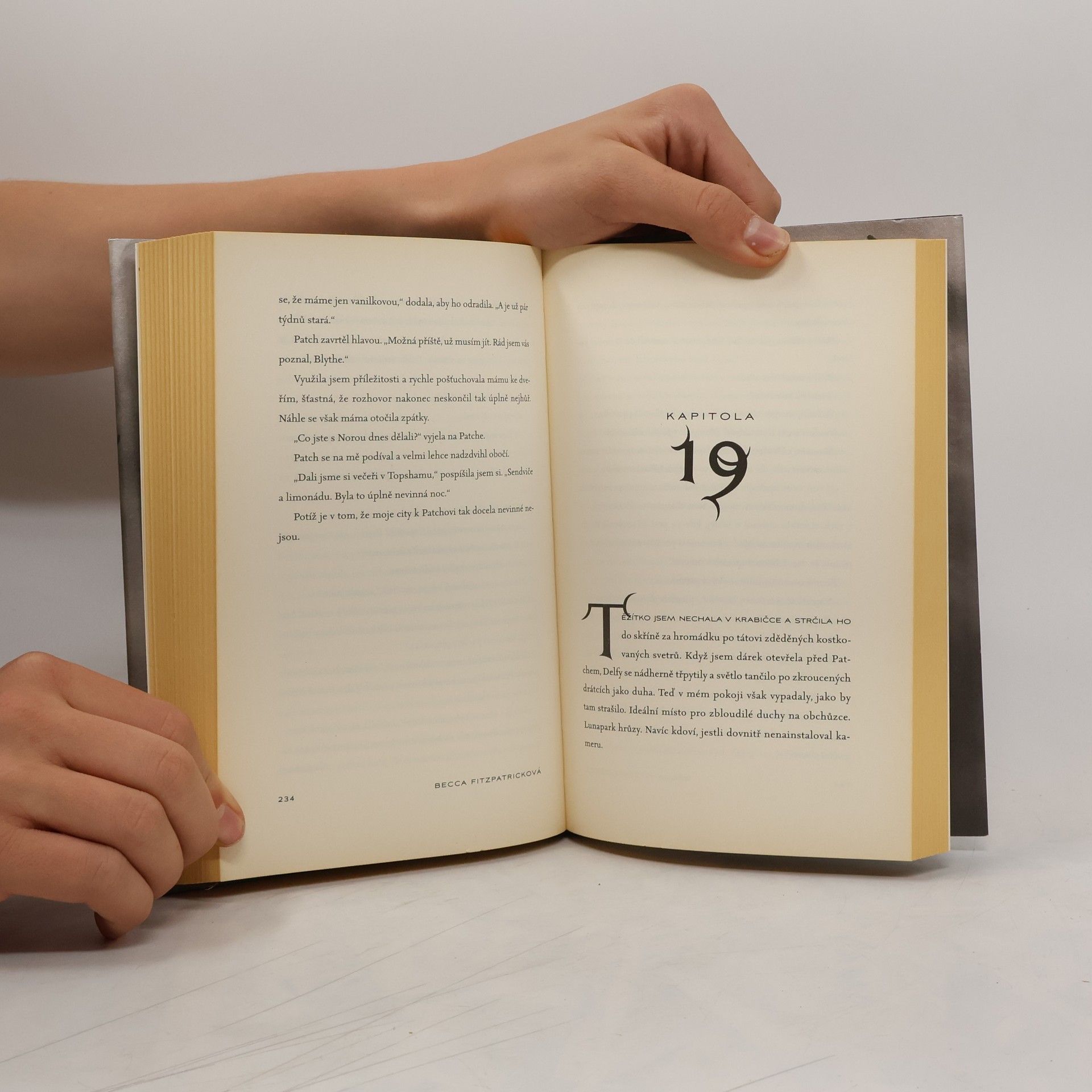 Patchovy oči připomínaly černé hvězdy. Bral všechno a nedával nic. Ne že bych o něm chtěla vědět víc. Nelíbil se mi zvnějšku a pochybovala jsem, že by se mi zamlouvalo, co se skrývá uvnitř. Tedy, to není úplně přesné. Zvnějšku se mi líbil hodně. Dlouhé, silné paže, široká, uvolněná ramena a úsměv zpola hravý, zpola svůdný. Cítila jsem, že mě neodolatelně přitahuje, a sama sobě jsem přestávala rozumět. Nora Greyová je svědomitá, chytrá a rozhodně nemá ráda riziko. Jenže se zamiluje do Patche a to je její první chyba. Patchova minulost je totiž všechno, jen ne nevinná. A nejlepší, co kdy udělal, bylo, že se zamiloval do Nory. Seznámili se na hodině biologie a Nora chce jediné – držet se od něj co nejdál. Jenže jak se zdá, Patch je vždy o dva kroky napřed. Dívka na sobě cítí jeho pohled, i když Patch není nablízku. Cítí jeho přítomnost, i když je v pokoji sama. A když své okouzlení nedokáže déle tajit, vyjde najevo, kdo Patch ve skutečnosti je a proč ji vyhledal. A za všemi otázkami, které se dotýkají jeho minulosti, si Nora a Patch mohou navzájem položit jen jedinou: „Jak hluboko dokážeš padnout?“