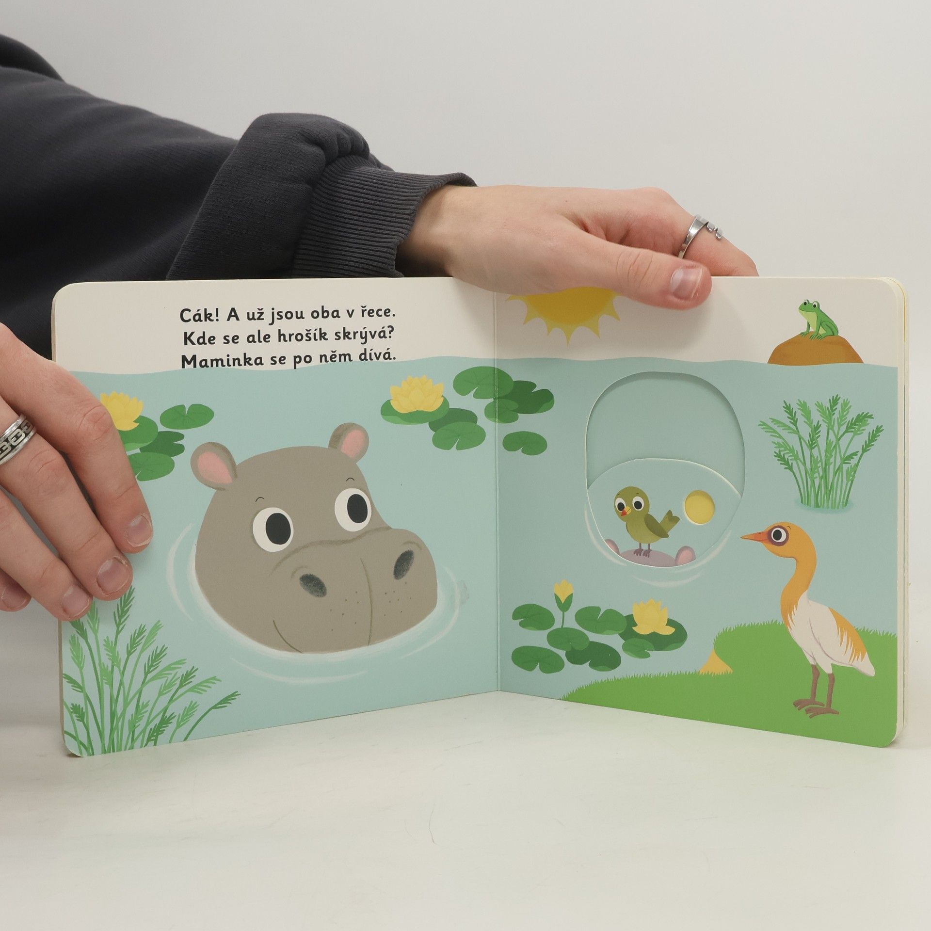 Co má hrošík nejradši? Dělat salta, pod vodou skotačit. Objevovat svět s tímto leporelem pro nejmenší děti od jednoho roku je tak zábavné! Pevné stránky s pohyblivými prvky procvičí i jemnou motoriku. Stačí jen vložit prstík do správného otvoru a lehce vysunout, zatáhnout nebo otočit a hned bude váš malý objevitel znát odpovědi. Knížka s prvky Montessori. České vydání publikace nakladatelství Nathan.