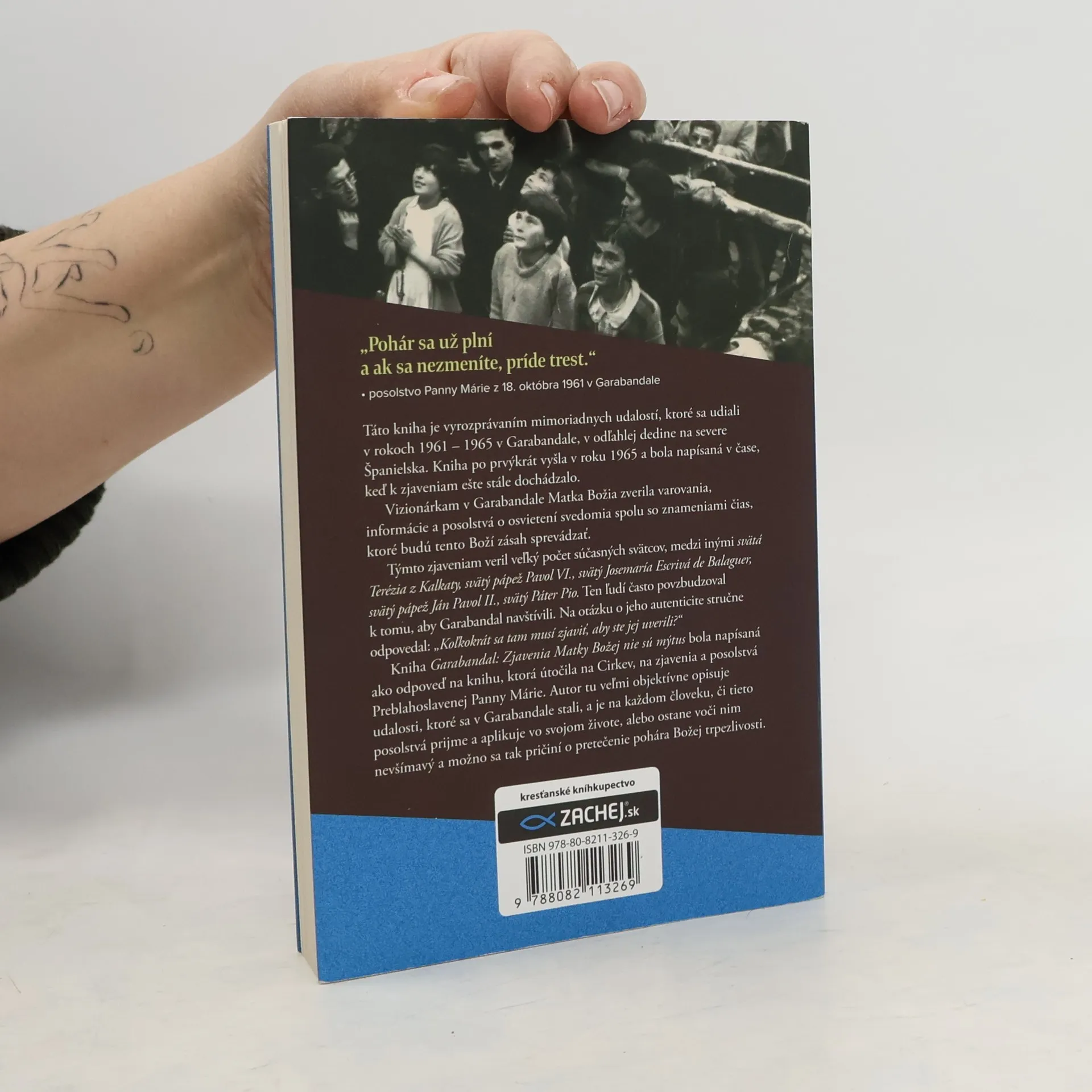 Pohár sa už plní a ak sa nezmeníte, príde trest. Toto posolstvo Panny Márie z 18. októbra 1961 v Garabandale je ústredným motívom tejto knihy, ktorá zachytáva mimoriadne udalosti z rokov 1961-1965 v odľahlej dedine na severe Španielska. Prvýkrát bola publikovaná v roku 1965, počas prebiehajúcich zjavení. Vizionárkam Matka Božia zverila varovania a posolstvá o osvietení svedomia, pričom tieto zjavenia boli uznávané mnohými súčasnými svätcami, ako sú svätá Terézia z Kalkaty, svätý pápež Pavol VI., svätý Ján Pavol II. a svätý Páter Pio, ktorý povzbudzoval návštevy Garabandalu. Autor reaguje na kritiku zjavení a posolstiev Panny Márie, pričom objektívne opisuje udalosti, ktoré sa tam odohrali. Čitateľom ponúka možnosť rozhodnúť sa, či posolstvá prijmú a aplikujú vo svojom živote, alebo ostanú voči nim nevšímaví, čo môže viesť k pretečeniu pohára Božej trpezlivosti. Kniha obsahuje aj rozsiahlu fotodokumentáciu, ktorá dopĺňa vyrozprávané udalosti. Nech posolstvo Matky Božej nájde cestu do sŕdc skôr, než bude neskoro.