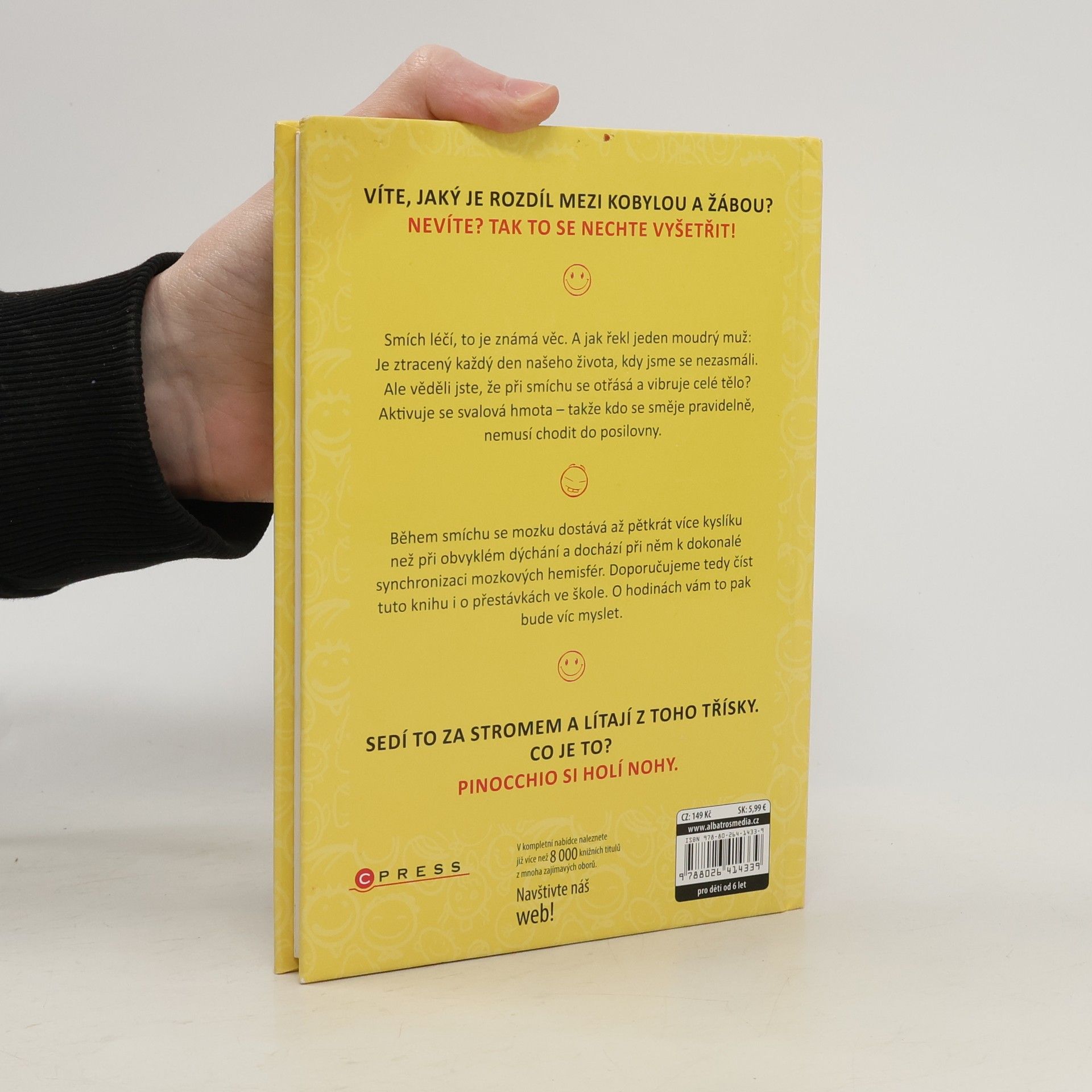 Víte, jaký je rozdíl mezi kobylou a žábou? Nevíte? Tak to se nechte vyšetřit! Smích léčí, to je známá věc. A jak řekl jeden moudrý muž: Je ztracený každý den našeho života, kdy jsme se nezasmáli. Ale věděli jste, že při smíchu se otřásá a vibruje celé tělo? Aktivuje se svalová hmota – takže kdo se směje pravidelně, nemusí chodit do posilovny. Během smíchu se mozku dostává až 5 x více kyslíku než při obvyklém dýchání a dochází při něm k dokonalé synchronizaci mozkových hemisfér. Doporučujeme tedy číst tuto knihu i o přestávkách ve škole. O hodinách vám to pak bude víc myslet.
