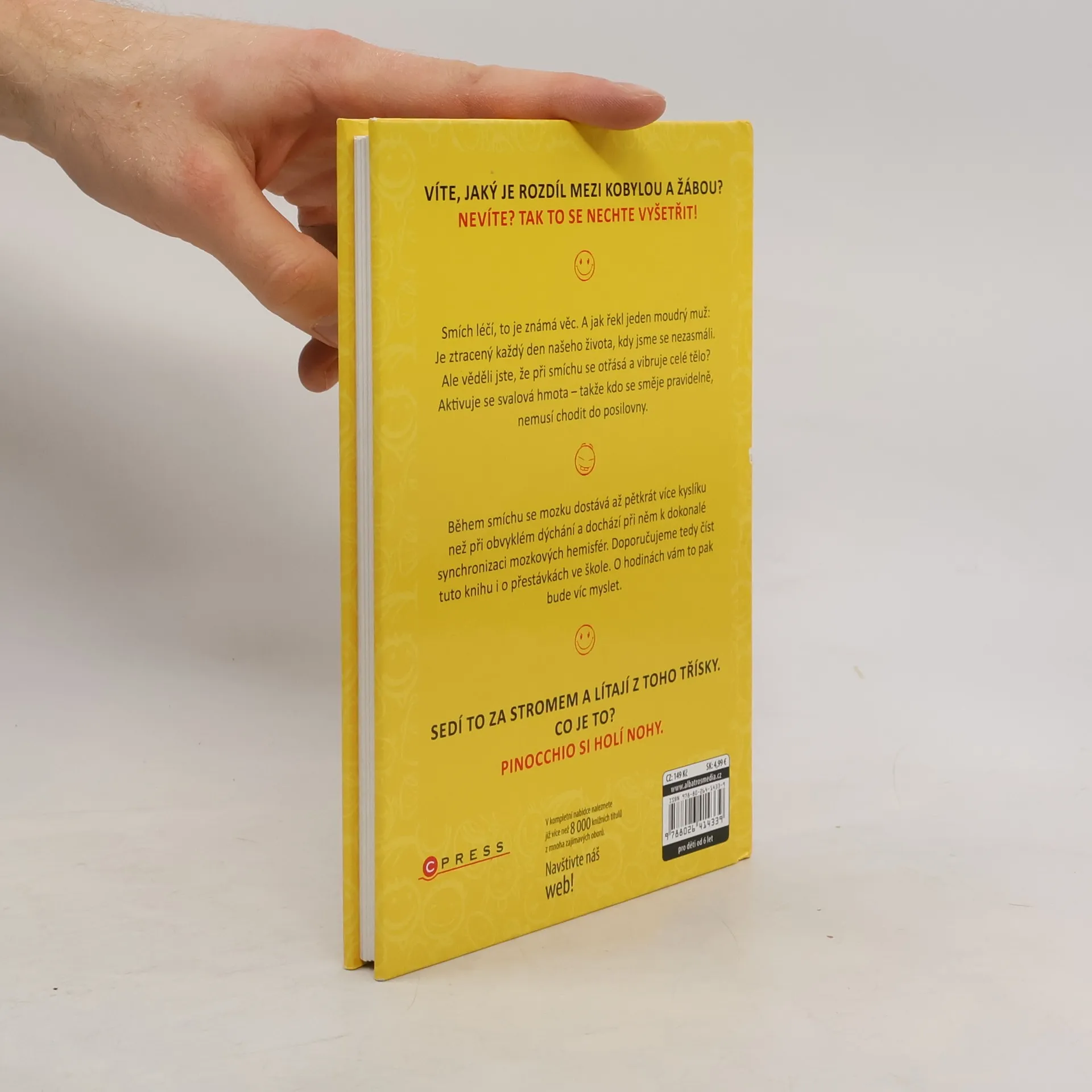 Víte, jaký je rozdíl mezi kobylou a žábou? Nevíte? Tak to se nechte vyšetřit! Smích léčí, to je známá věc. A jak řekl jeden moudrý muž: Je ztracený každý den našeho života, kdy jsme se nezasmáli. Ale věděli jste, že při smíchu se otřásá a vibruje celé tělo? Aktivuje se svalová hmota – takže kdo se směje pravidelně, nemusí chodit do posilovny. Během smíchu se mozku dostává až 5 x více kyslíku než při obvyklém dýchání a dochází při něm k dokonalé synchronizaci mozkových hemisfér. Doporučujeme tedy číst tuto knihu i o přestávkách ve škole. O hodinách vám to pak bude víc myslet.