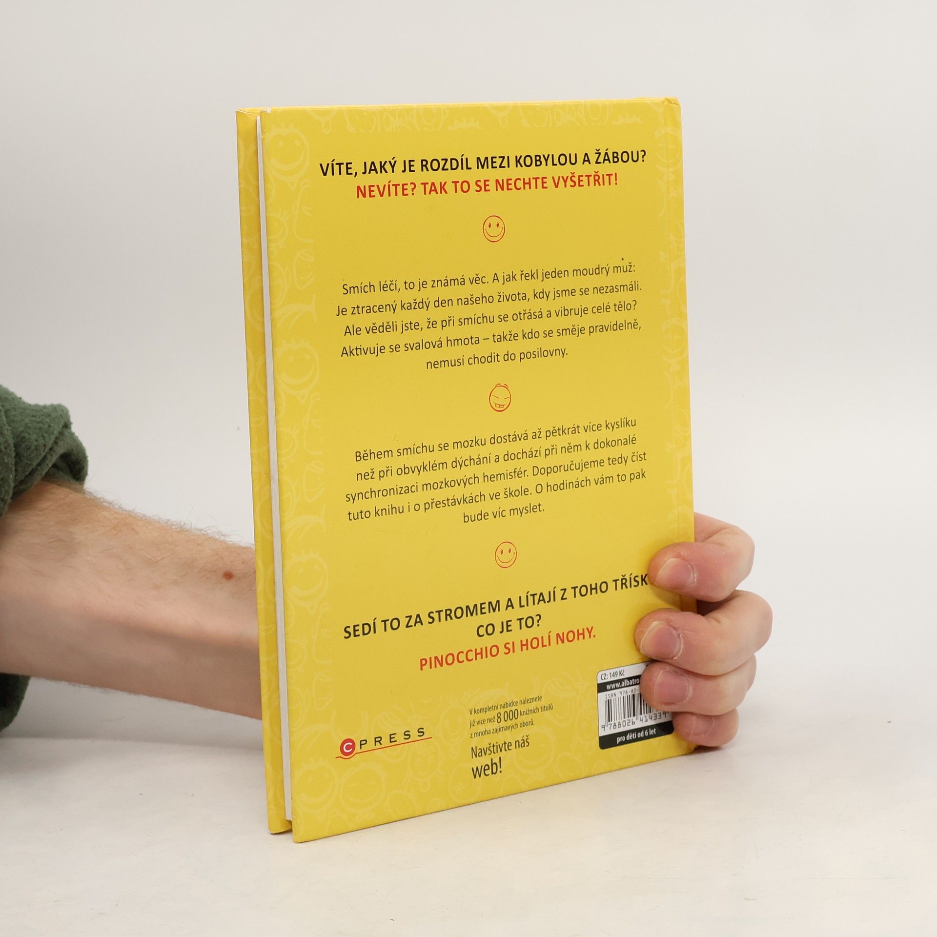 Víte, jaký je rozdíl mezi kobylou a žábou? Nevíte? Tak to se nechte vyšetřit! Smích léčí, to je známá věc. A jak řekl jeden moudrý muž: Je ztracený každý den našeho života, kdy jsme se nezasmáli. Ale věděli jste, že při smíchu se otřásá a vibruje celé tělo? Aktivuje se svalová hmota – takže kdo se směje pravidelně, nemusí chodit do posilovny. Během smíchu se mozku dostává až 5 x více kyslíku než při obvyklém dýchání a dochází při něm k dokonalé synchronizaci mozkových hemisfér. Doporučujeme tedy číst tuto knihu i o přestávkách ve škole. O hodinách vám to pak bude víc myslet.