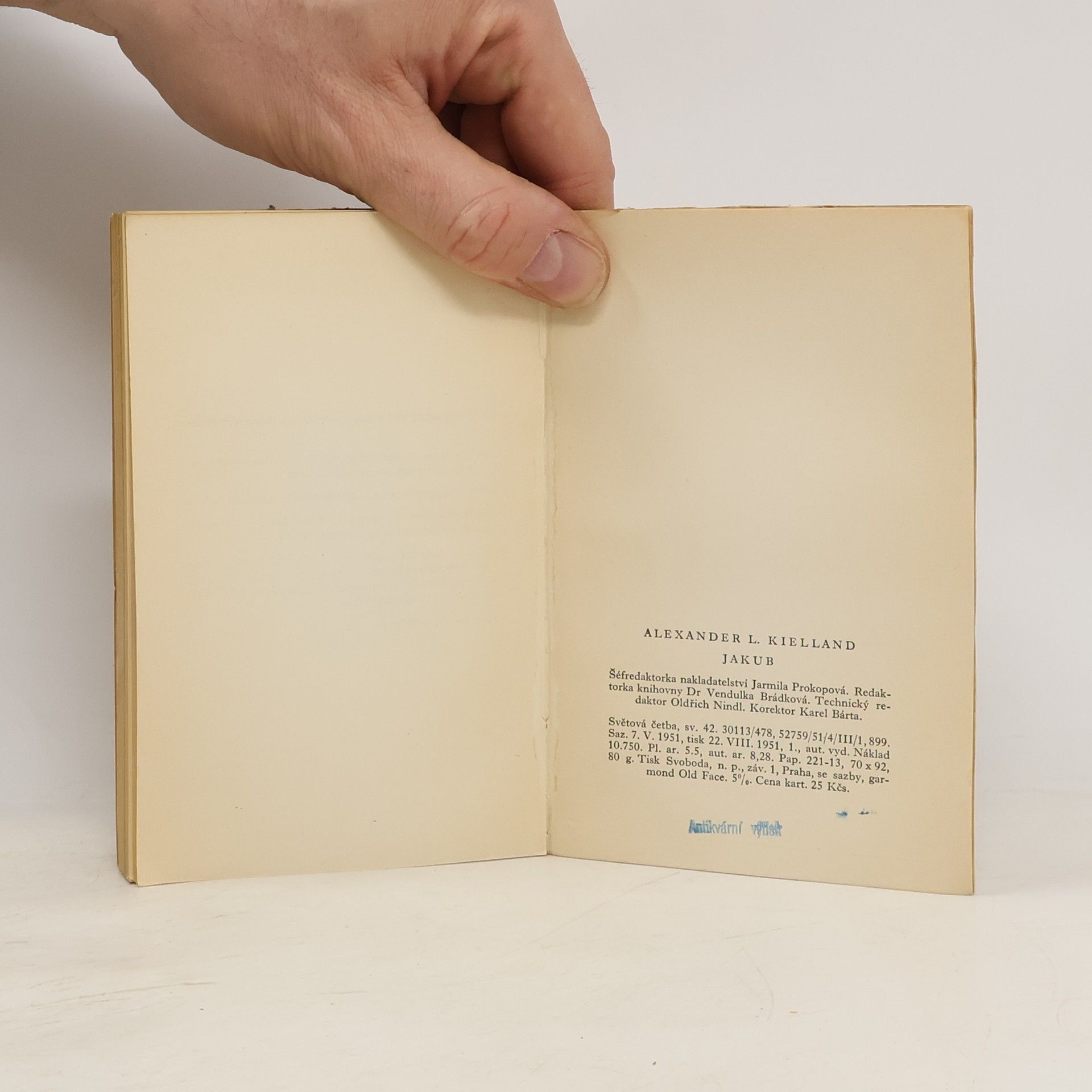 A. L. Kielland, jehož román „Jacob“ z r. 1891 vychází u nás po prvé, patří mezi nejpokrokovější spisovatele Norska 2. pol. 19. stol. Jako v ostatních dílech, i v tomto románu bojuje A. L. K. proti kapitalismu, kritisuje dravčí politiku lidí přišlých většinou z venkova a ženoucích se zaprospěchem a kořistí, poukazuje na rozdíl mezi životem bohatých lidí a bídou dělníků. Hlavním hrdinou jeho příběhu je selský synek Törres, který se vypraví do města za zlatem. Žádný prostředek k jeho získání mu není dost špatný: dopouští se stejně lehce drobných krádeží jako rafinovaných, promyšlených intrik. Brzy se zmocní výsledku práce všech lidí ve svém okolí, především norských kupců ze starých patricijských rodů, jež autor, sám z podobné rodiny vyšlý, líčí ve světle celkem sympatickém a příznivém. Svou bezohledností dosáhne Törres bohatství, postavení, ženy, jež ho kdysi odmítla a kterou může nyní podle své vůle pokořit. On a jemu podobní tvoří vrstvu kapitalistů, kteří se zmocňují vlády nejen v obchodě a společnosti, ale i v politice a dostávají svět do krisí.