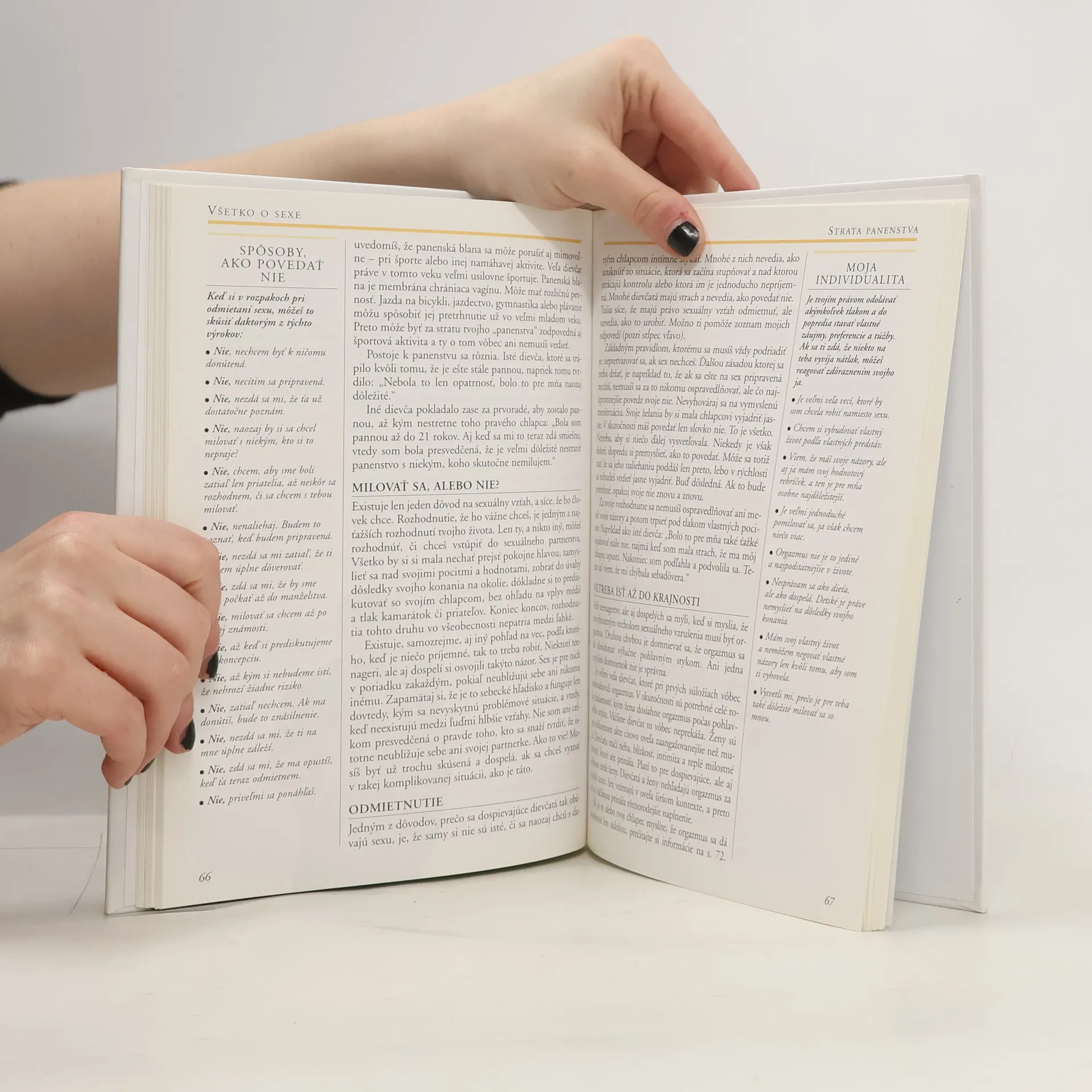 Kniha oslovuje dievčatá na prahu dospelosti - v čase, keď ide o veľa nových a dôležitých vecí: treba si zvyknúť na menštruáciu, uvedomiť si svoju zrejúcu ženskosť i plodnosť, akceptovať sex, upraviť svoje vzťahy s chlapcami i ostatným okolím. Okrem toho treba s plnou zodpovednosťou vziať do vlastných rúk starostlivosť o svoje duševné i telesné zdravie a o svoj vzhľad, zvoliť si životnú dráhu, nájsť svoje nové miesto v pôvodnej rodine, neraz sa práve zmietajúcej v kríze.